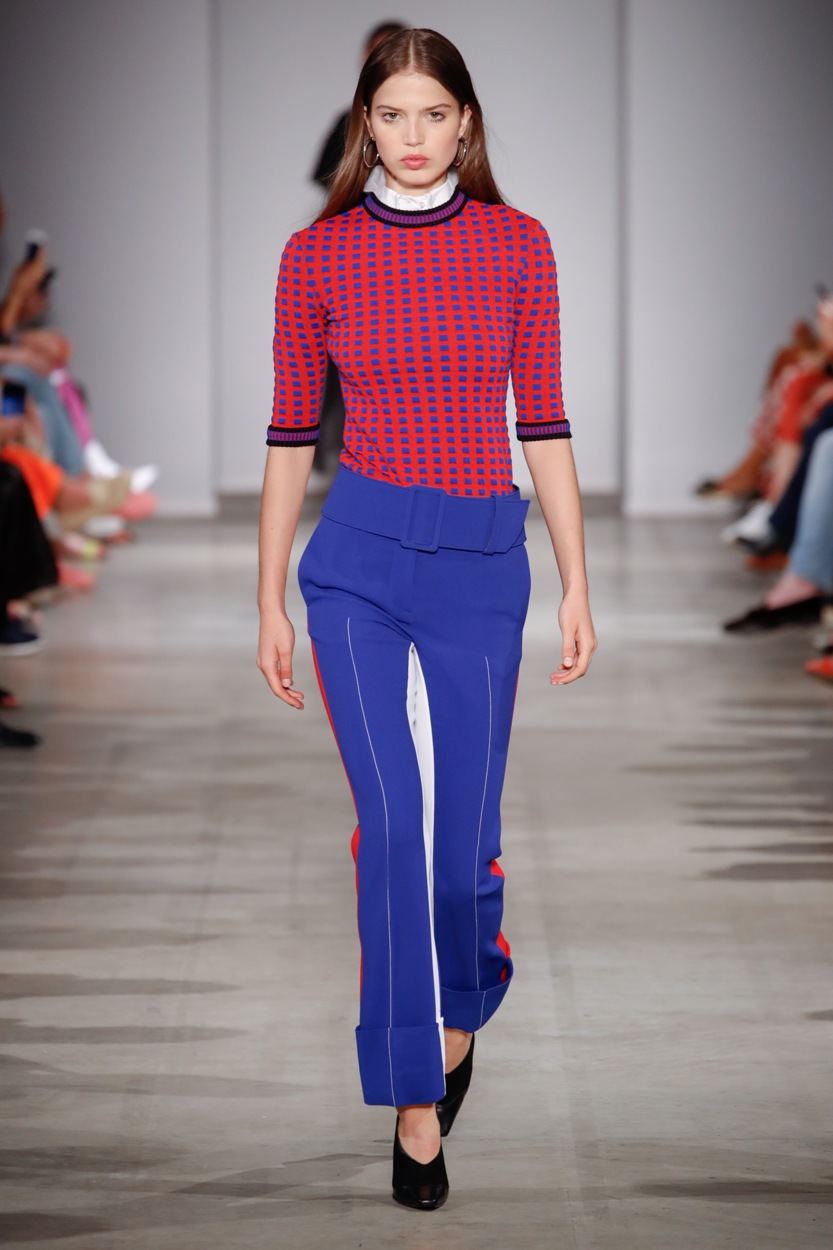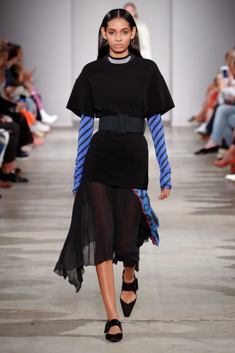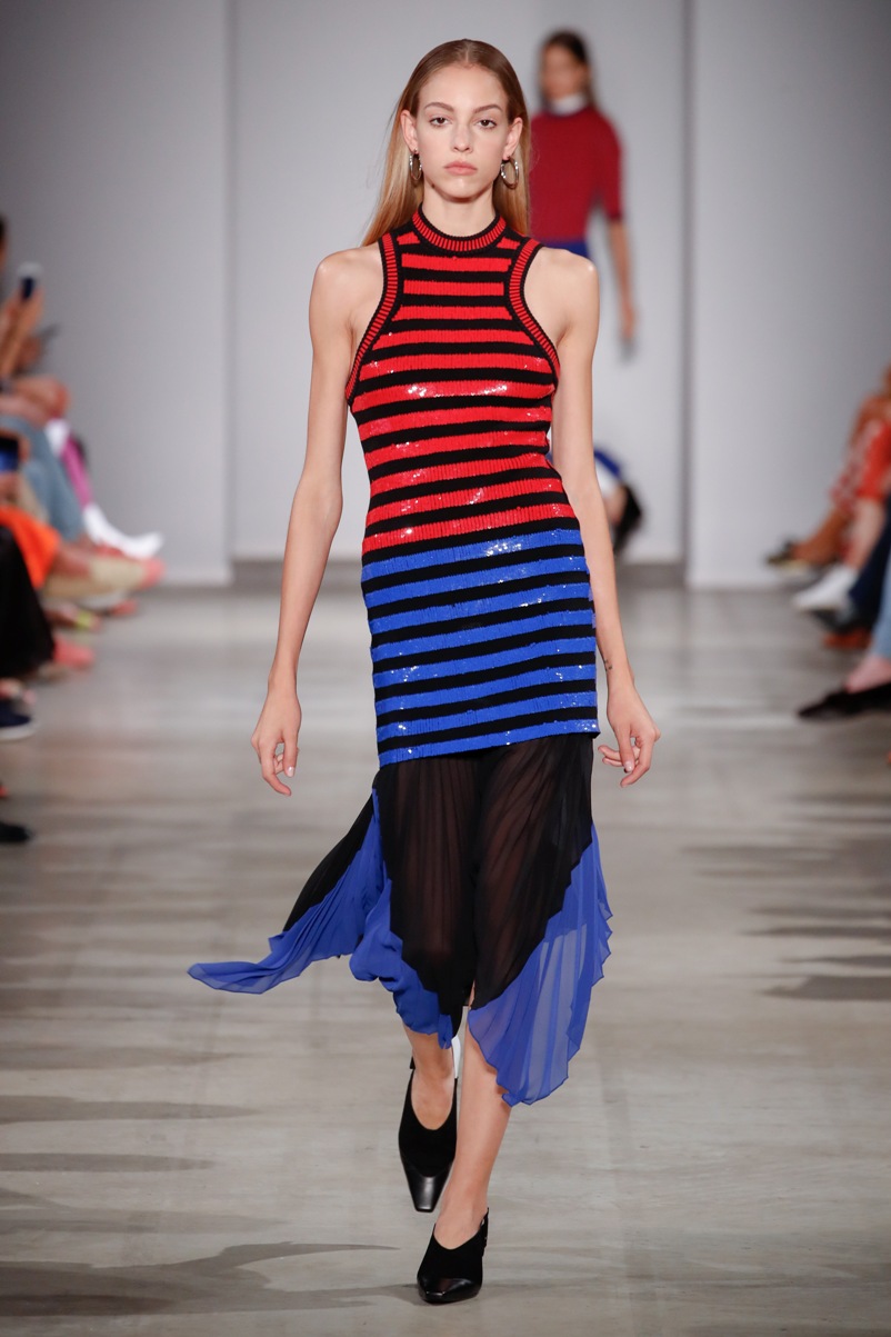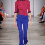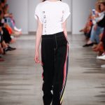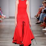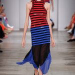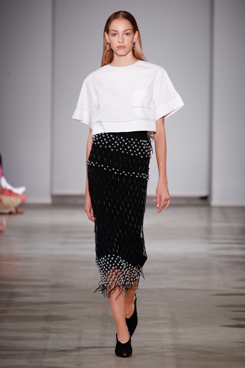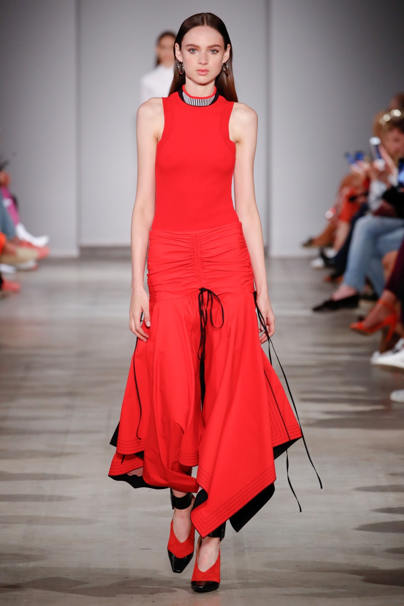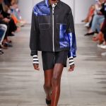 I volumi sono ampi soprattutto quelli che ridisegnano le camicie bianche, capo iconico del marchio. L’identità della collezione è nei tagli essenziali, evidenziati da intersezioni cromatiche di righe e geometrie, come nei pantaloni dalle lunghezze varie caratterizzati da bande laterali; ma l’identità è anche nelle asimmetrie, che costruiscono gonne dall’allure femminile e leggera enfatizzata dalla vita strizzata in cinture alte, che disegnano abiti leggeri e fluttuanti, sofisticati, iperfemminili e vibranti.