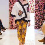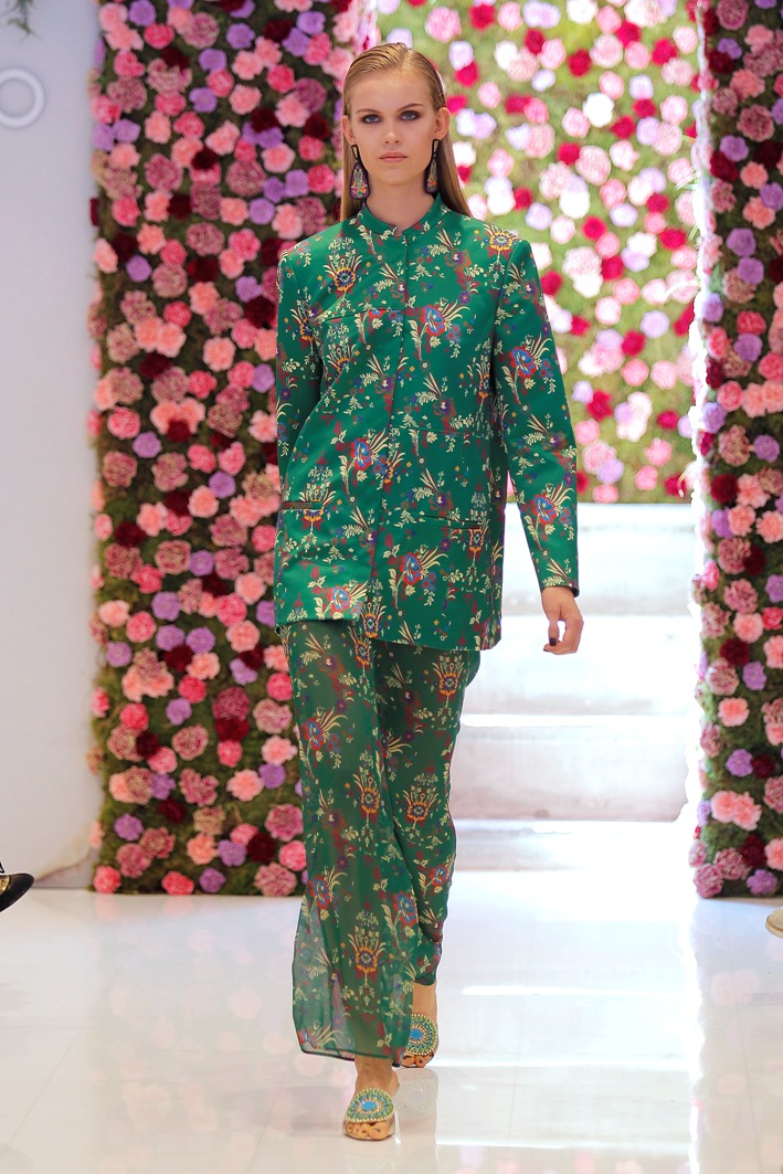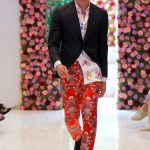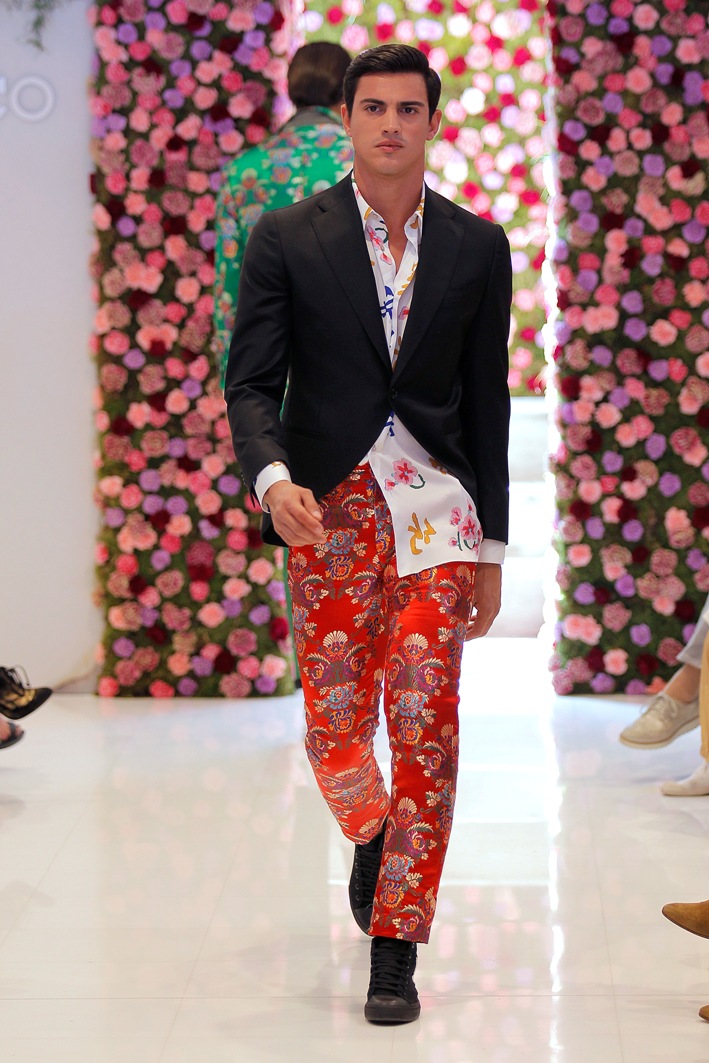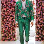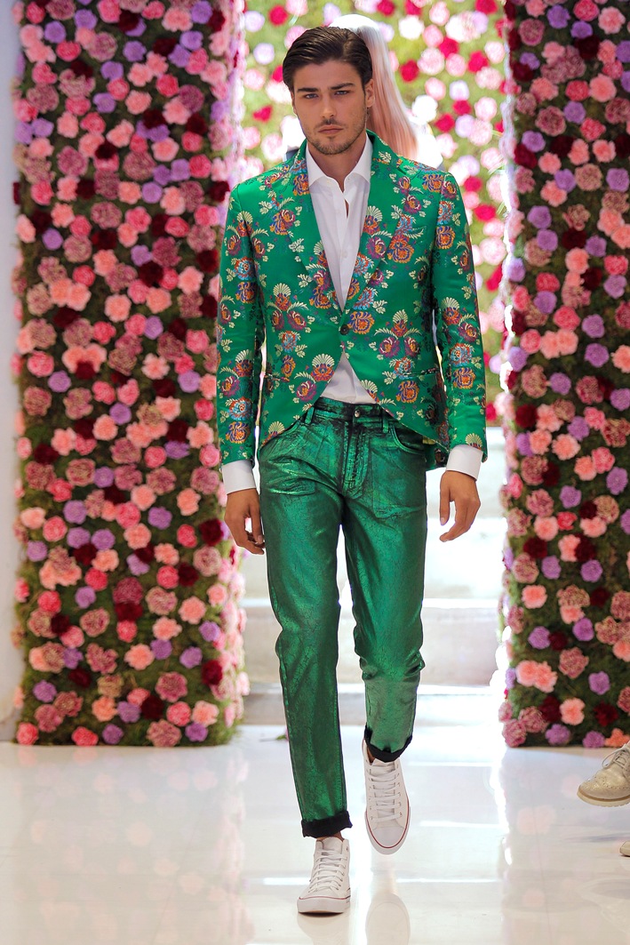 Dai toni allegri e frizzanti anche la collezione uomo, fatta di giacche strizzate in vita allacciate da un solo bottone e pantaloni a sigaretta, dai toni accesi e dai ricami orientaleggianti.