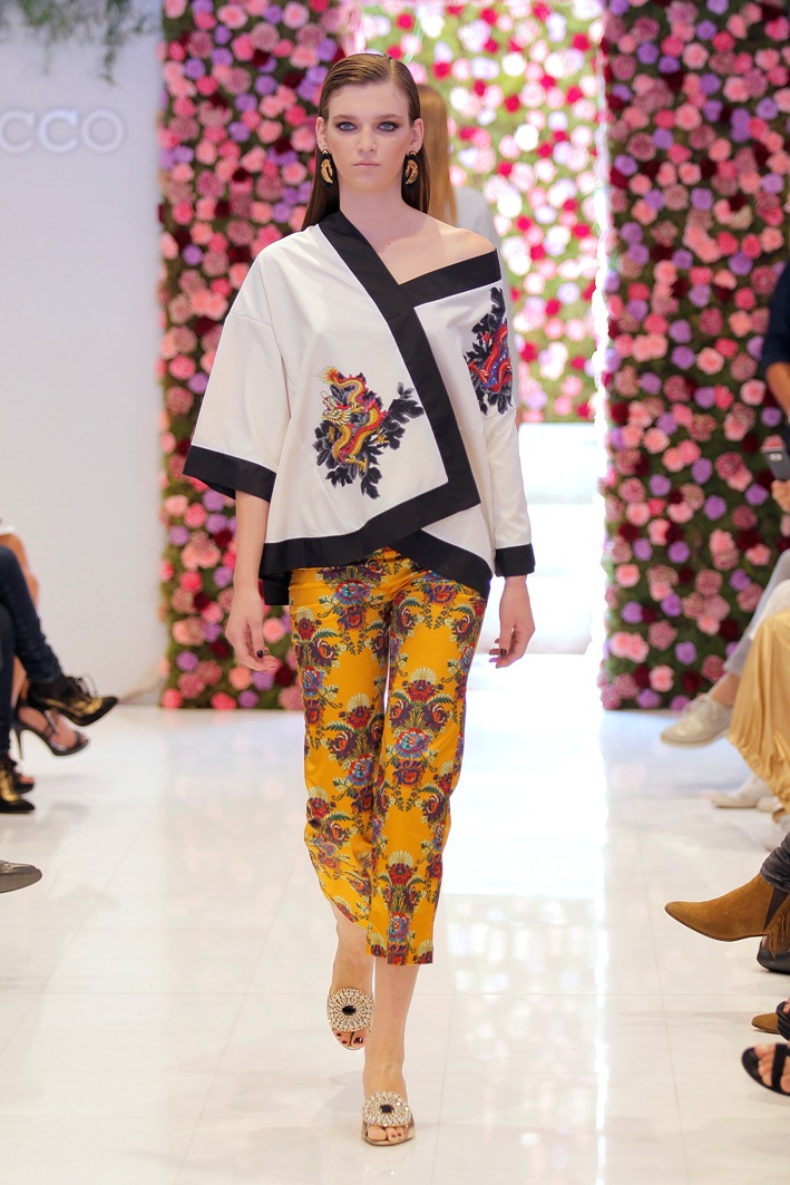 Raffinate carpe, pesci simbolo di prosperità e buona fortuna, modellano silhouette iperfemminili, fatte di spacchi generosi e sovente di spalle scoperte. Delle geishe moderne e metropolitane, seducenti, e audaci, le donne immaginate dallo stilista per la proposta della prossima stagione. Interessante la linea rivisitata delle giacche kimono, proposte in versione monospalla, così come gli abiti dalla tipica foggia orientale che tanto ricordano le mise della protagonista del film “In the mood for love”.
