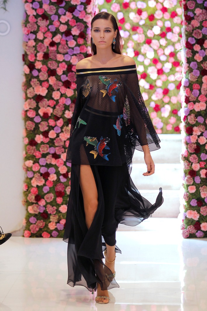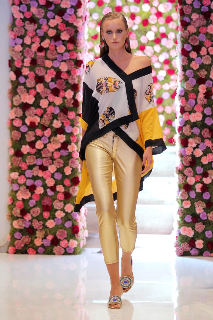 Le linee degli abiti, perlopiù fluide, presentano mise poste ad enfatizzare una sensualità decisa: lo stilista immagina dress in chiffon dal sapore romantico, decorati da draghi o da maschere del teatro giapponese.