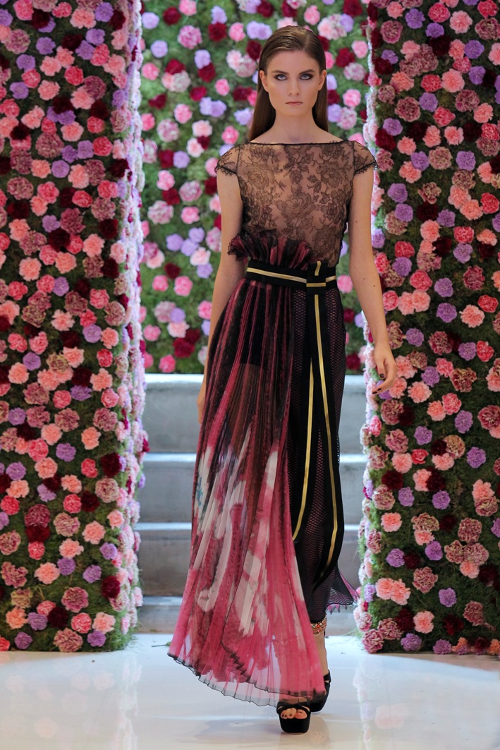 Tripudi di pizzo, seta, georgette e chiffon disegnano silhouette dalle linee fluttuanti e leggere, da mille e una notte.