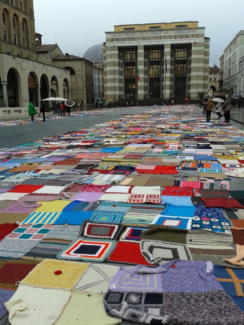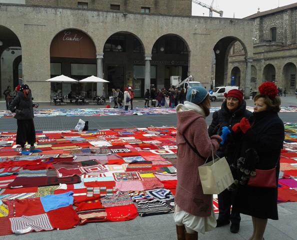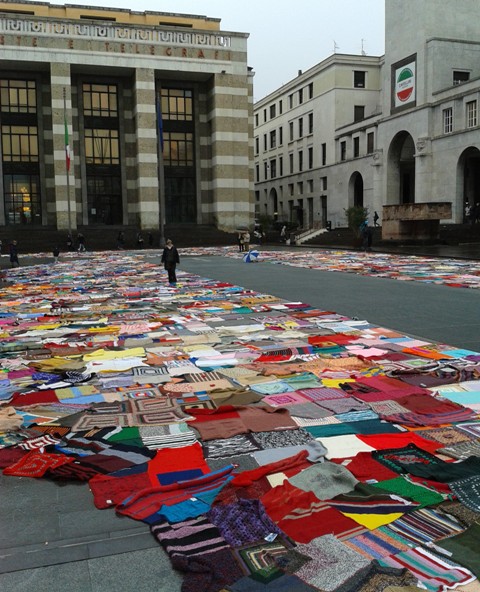 Oltre 20mila carré di maglia di cinquanta centimetri l’uno, cuciti insieme quattro per quattro tanto da formare un metro quadro. Il risultato 5mila coperte unite da un filo rosso. Un social patchwork sferruzzato da migliaia di donne e uomini di tutto il mondo.
