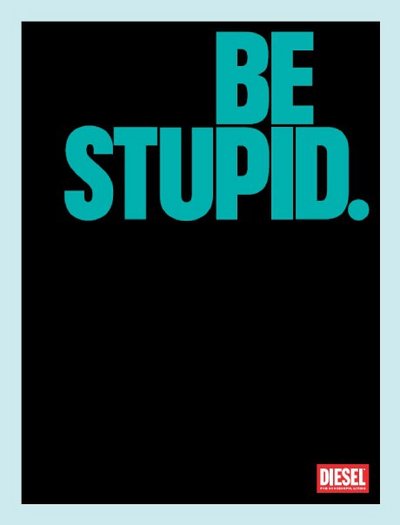 L’avventura dell’ iconico marchio è continuata anche quest’anno con la campagna per la prossima collezione “Be stupid” (lo traduciamo “sii stupido!”): messaggi non sempre semplici e chiari (dipende dai punti di vista e dalla vostra conoscenza dell’inglese), ma sicuramente provocanti, che tramite una quarantina di manifesti, con soli slogan, o accompagnati da immagini pop-demenziali, stanno facendo il giro delle città. In Italia in realtà le immagini non sono ancora state esposte: sembra che faccia parte della strategia pubbliciataria Diesel…creare suspence con l’attesa e intanto incuriosirci con slogan effetto shock… comunque le potete vedere sul sito della Diesel http://www.diesel.com/be-stupid/.