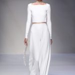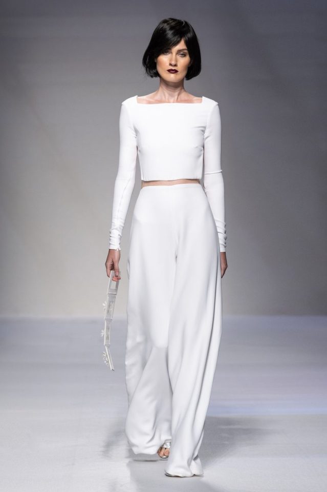 Le forme razionali che segnano gli abiti da sera, conferiscono un’impronta raffinata e contemporanea, mentre la fluidità delle tute abbraccia morbidamente la silhouette femminile.