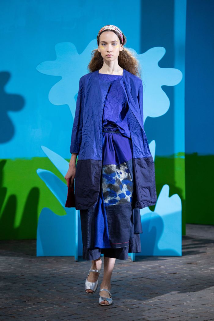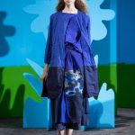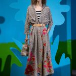 Linee semplici pulite e accoglienti nel loro sofisticato rigore che nella loro espressione disegnano ampi volumi, comodi e confortevoli. I tessuti: sublimi lini, seta e cotone, regalano silhouette morbide e armoniche. I colori sono caldi, avvolgenti, come il miele naturale, il caldo castagno, l’arancio, ma anche le tonalità decise dell’azzurro, del verde sottobosco, del giallo, del blu navy, del blu oltremare, del blu elettrico che tingono la collezione di note allegre e fiorite. Come nella giacca a uovo bluette tempestata di micro fiori combinata con i pantaloni morbidi, ma anche nell’abitino con micro stampa geometrica in bianco e nero con grossi fiori appoggiati sulla gonna in ordine sparso.
