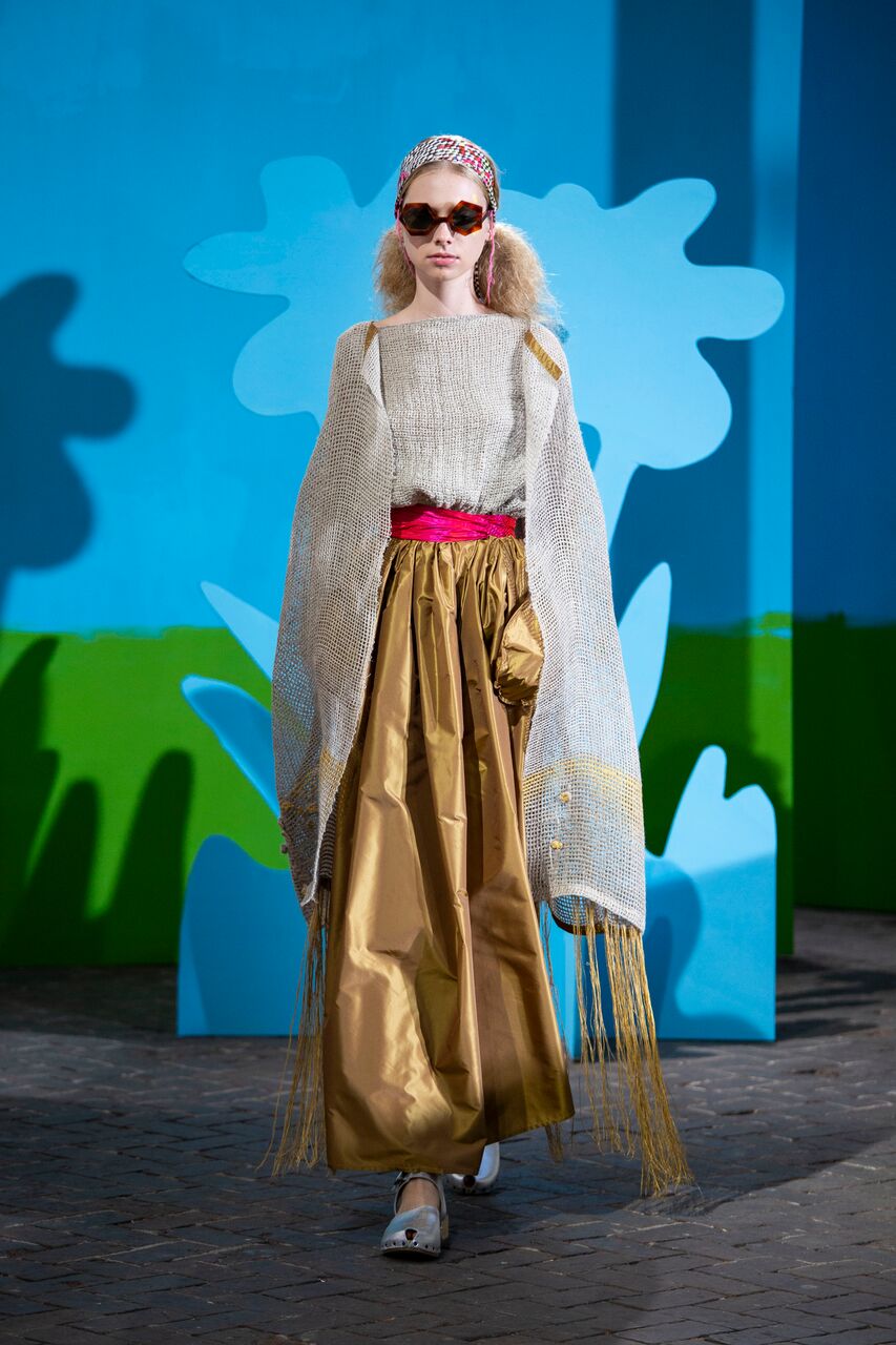 La collezione è ispirata al lavoro gregario delle api, alla loro meticolosità e costanza, alla loro pazienza e al loro vigore. Il frutto di tanto operare è il miele, l’oro liquido. Il nettare generoso e calmante, disinfettante e rinvigorente. Dall’ arnia sgorgano tesori, tutti i colori dei fiori si traducono in miele: è il racconto del buono delle piante. Gli abiti, ispirati al lavoro delle api, sono casa, come un favo d’infinite tasche.