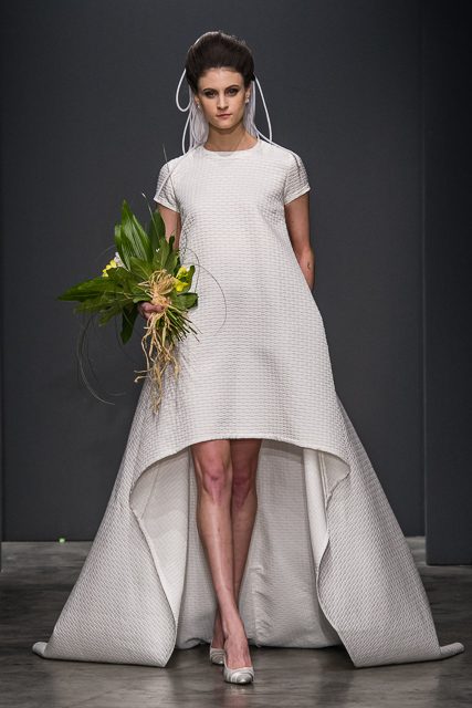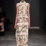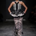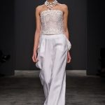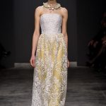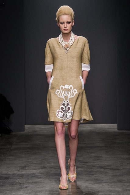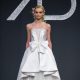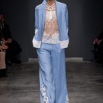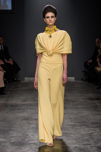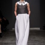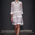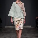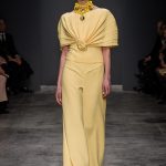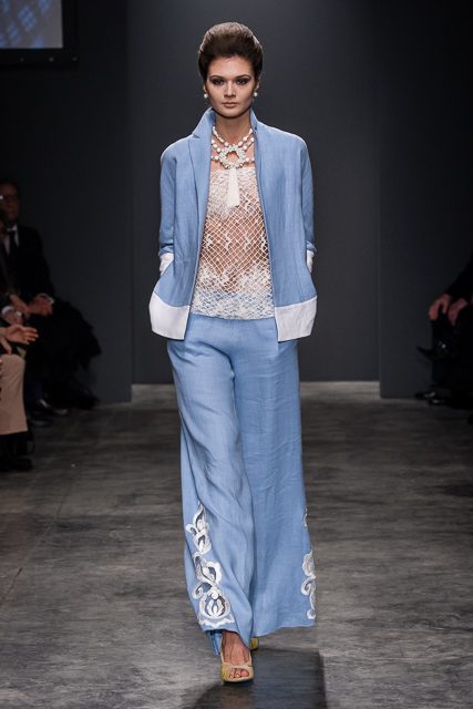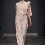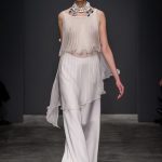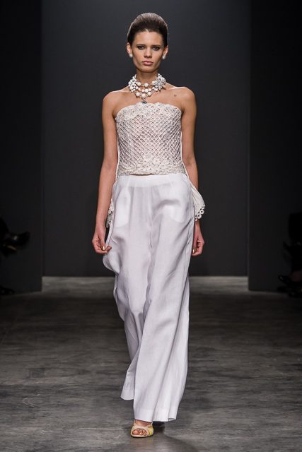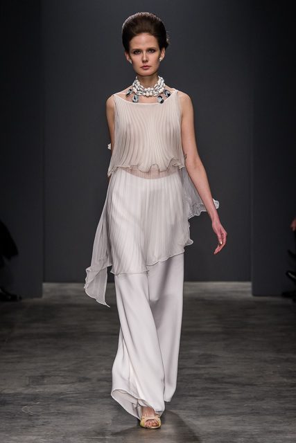E’ il plissé ad aprire la sfilata con la mantellina chiusa a nodo sul davanti nel completo dai pantaloni di un giallo caldo e dalla linea morbidissima; pantaloni dalla chiusura sovrapposta sul fianco destro; un mood che ritorna nel completo bianco dove la mantellina è fermata sulla spalla sinistra lasciando scoperto il braccio, mentre scivola sul braccio destro; oppure, quasi a ricordare una giacca da ussero, passa sotto un seno ed è fermata asimmetricamente con un laccio. Restano da segnalare gli abiti più “quotidiani”. La tunichetta ambra –la accompagna il collier con un medaglione color ambra più scuro, dalle spalle importanti con inserto bianco di volute e trafori; questi ultimi decori si ripetono sui pantaloni del tailleur di lino celeste e topo bianco a maglia di rete. Ultima uscita l’abito da sposa, a nostro parere non particolarmente riuscito, dove il velo tradizionale è sostituito da nastri tubolari fermati alla nuca.
