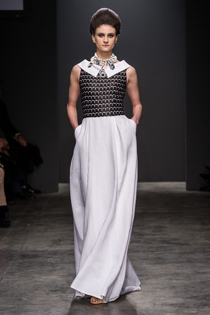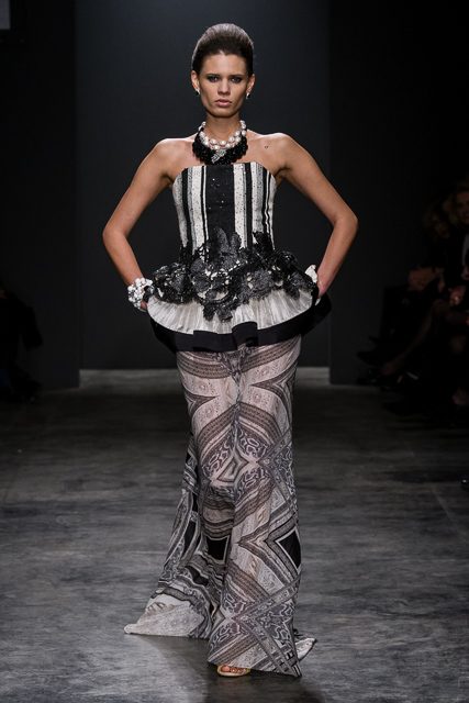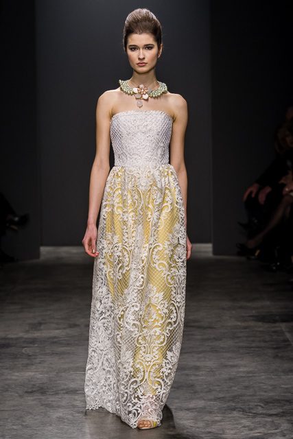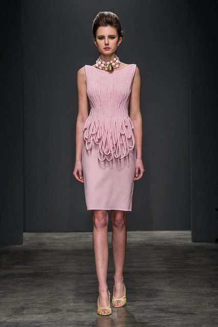Se analizziamo l’immagine di donna che emerge dalla collezione capiamo più a fondo il lavoro di Camillo Bona. Ci presenta una donna estremamente femminile, rigorosa ma seducente, che ha una personalità definita e una posizione sociale “elevata” che giustifica la possibilità di vestire alta moda; possiede un’eleganza misurata, autentico charme: per questo può permettersi di eccedere in un dettaglio, vestire “pesantemente” il collo con collarini di perle, coralli, e pietre dure, da cui scendono cascate di fili di perle e pietre.