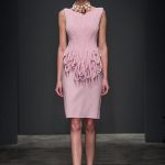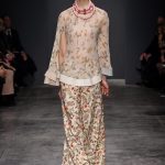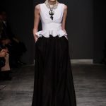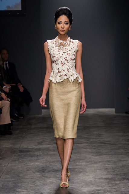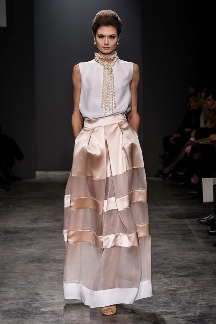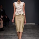 L’immagine femminile che emerge si esprime principalmente attraverso la semplicità delle linee e della costrizione dell’abito che scivola sul corpo, senza nasconderlo ma senza ostentarlo; una semplicità arricchita dai tessuti, le lane lavorate in double e il cachemire, il lino leggerissimo, lo chiffon trasparente in colori tenui dal bianco al leggermente rosato alternato in un gioco di luce da righe seta della stessa tonalità. Elegantissimo per un cocktail la tunica in chiffon che doppia una gonna liscia e un top di merletto; e ancora il pizzo bianco che doppia una gonna lunga dorata per una mise da sera; il corpino in pizzo lascia le spalle scoperte. Più ridondante nei materiali, pur nella semplicità della linea, la gonna in lamé con un esito visivo di plissé orizzontale, color oro nella gonna, bruciato nella baschina, “stampata” a colori tenui nel corpino; data la preziosità dei materiali avremmo utilizzato gioielli più semplici solo il doppio filo del collier bianco o almeno le pietre di un unico colore. Tutti da ammirare gli abiti in pizzo; ma anche il completo pantaloni bianchi larghi, top dal taglio asimmetrico lungo a balze plissettate.