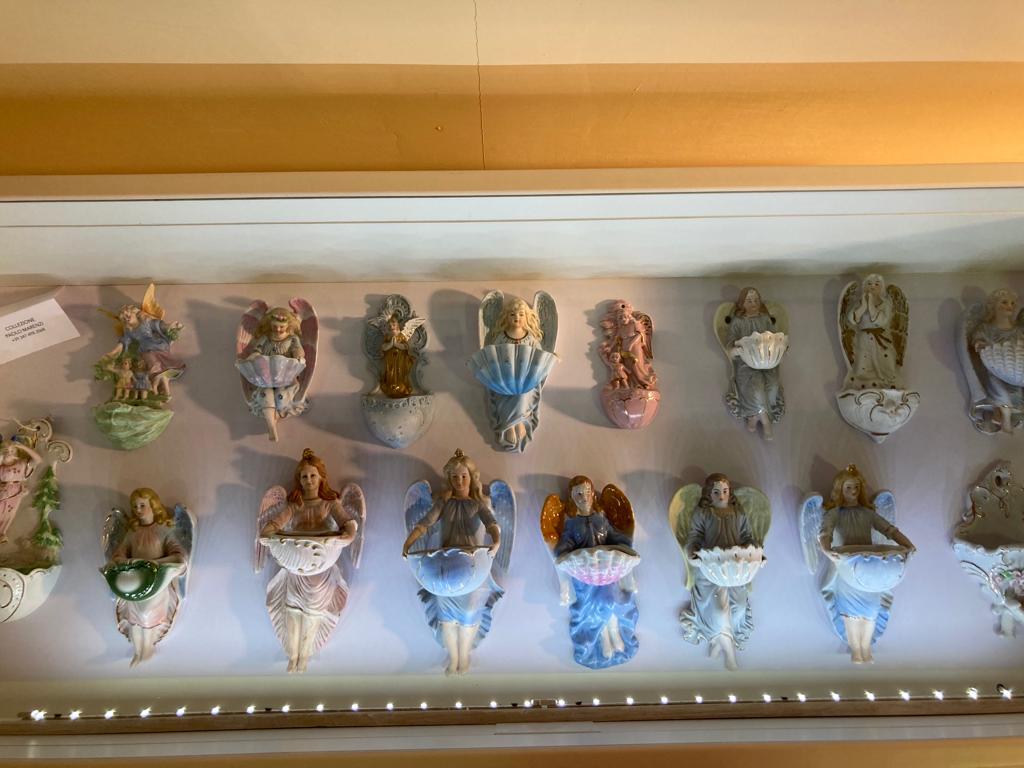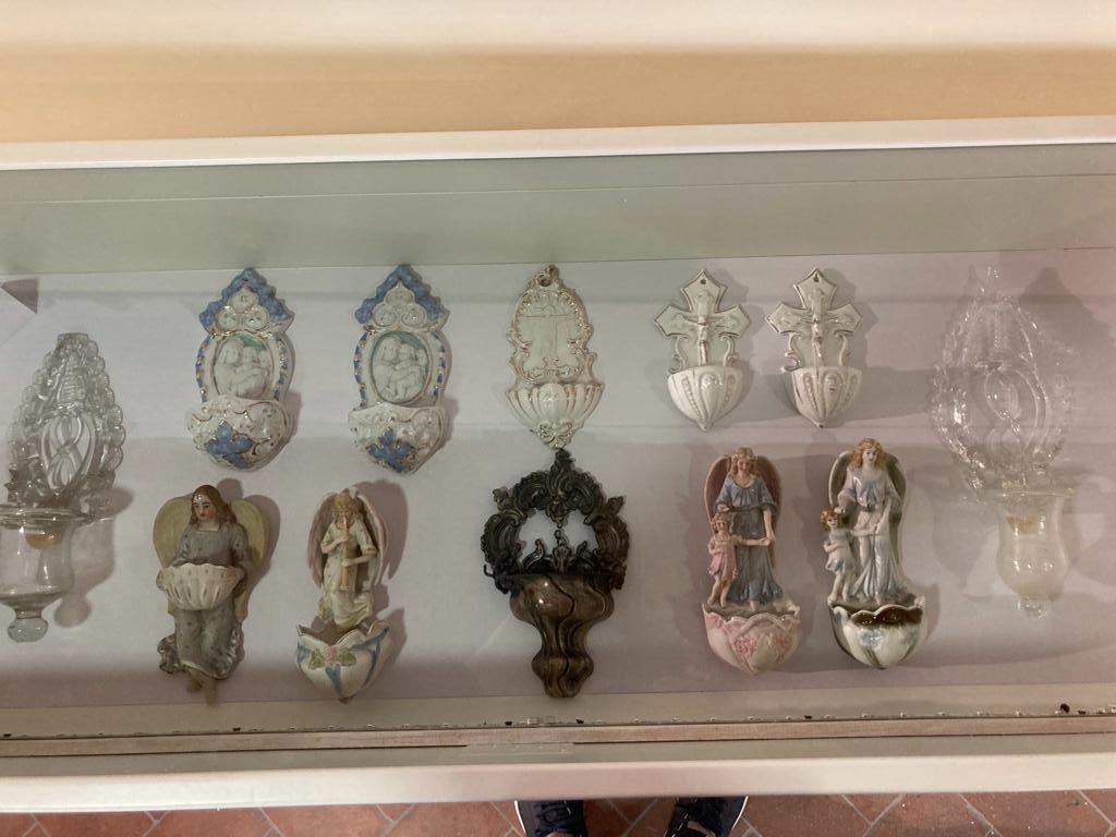 Le acquasantiere in mostra al Museo del Bijou – tutte deliziose – sono di epoca contemporanea e prodotte da ceramisti di Casalmaggiore (in primis Francesco Vitale) recuperando filologicamente e creativamente la storica attività manifatturiera delle locali fabbriche riunite placcato oro di