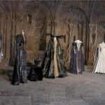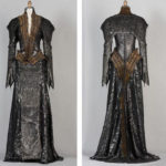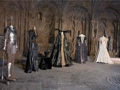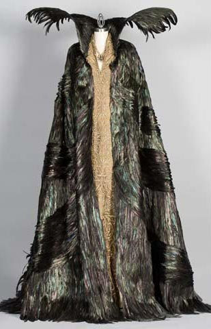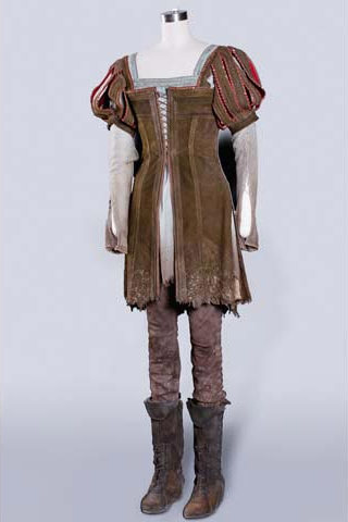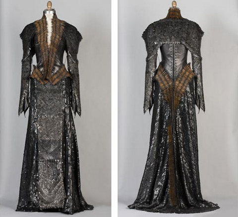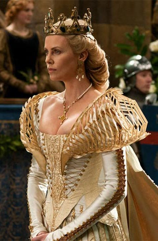 Ma gli sforzi della Atwood si sono tutti concentrati sulla figura di Ravenna, per i cui costumi è andata alla ricerca dei simboli del male e del brutto. Nelle sue prime apparizioni la vediamo con abiti dorati come la luce del sole, che la fanno apparire di una bellezza semplice e modesta. Tra questi c’è anche l’abito che indossa durante il matrimonio col re, in cui però c’è già un elemento che rivelano la sua vera natura: le gabbie scheletriche sulle spalle. Una volta ucciso il re e diventata regina, non si preoccupa più di nascondere ciò che è veramente: continua a indossare abiti dorati, ma di una tonalità fredda e costituiti da placche che ricordano squame. L’altro colore che privilegia è il nero, dal vestito di ali di scarafaggio che ricorda un’armatura, che indossa quando il castello viene assaltato da Biancaneve, al mantello di penne di corvo che le si vede addosso quando offre la mela avvelenata alla principessa: e infatti fugge tramutandosi in uno stormo di corvi. Questi elementi si ritrovano anche nei suoi gioielli, dall’anello a forma di artiglio di uccello, che ricorda la sua somiglianza con un uccello rapace, alla corona d’argento con fili pendenti sul davanti e gabbia scheletrica sulla fronte. Abiti che sottolineano la sua crudeltà, ma dotati di una bellezza perversa e pericolosa che pone in eveidenza il suo fascino letale.