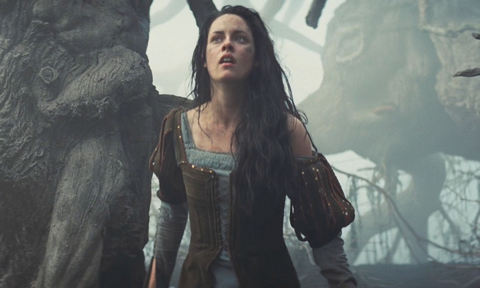 I costumi sono stati curati da Colleen Atwood, la fidata costumista di Tim Burton -vincitrice di tre premi Oscar per “Alice in Wonderland” (2010, Tim Burton), “Memorie di una geisha” (2005, Rob Marshall) e “Chicago” (2002, Rob Marshall)-, che ha ideato una Biancaneve tosta e combattiva. Se da bambina è vestita con abiti azzurro ghiaccio molto luminosi, per sottolineare la sua bellezza, una volta cresciuta, quando viene tenuta prigioniera, la vediamo con un abito lungo lacero e sporco, di colore marrone e con dettagli in rosso sulle maniche, a cui il Cacciatore strappa la gonna mentre sono nella Foresta Oscura, per facilitare la fuga. Ciò che resta del vestito le fa da casacca, ma sotto la gonna si rivelano esserci un paio di pantaloni marroni e alti stivali dello stesso colore. Non si può poi dimenticare l’armatura che indossa quando guida l’assalto al castello di Ravenna. Non è un caso che gli unici abiti femminili li tenga addosso per pochi minuti, come la lunga veste bianca, che la fa brillare di luce propria e sottolinea la sua purezza e che indossa mentre è addormentata dopo aver morso la mela avvelenata; e il prezioso vestito broccato rosso e oro che mette alla fine durante la sua incoronazione.