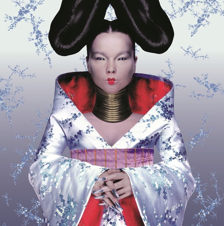 Impossibile non citare, poi, i modelli del compianto Alexander McQueen, concepiti per lei a cavallo tra natura e tecnologia: ad esempio, la ricordiamo come techno-geisha sulla copertina dello splendido album intimista “Homogenic” in un’atmosfera di erotismo latente, o come sensuale folletto in topless in “Pagan Poetry”, o come una contemporanea Alice con un abito da fiaba-incubo fatto di campane nel video di “Who is it”, oppure come creatura pronta a levarsi in volo nella Cattedrale di S. Paul a Londra mentre canta “Gloomy Sunday” per l’amico-stilista scomparso, indossando un suo abito-scultura con gonna di piume di struzzo e ali legnose color cipria.
