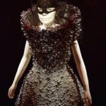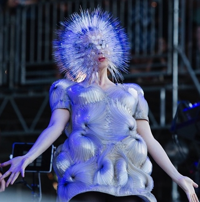 In realtà sono molti i fashion designer che hanno collaborato con Björk, condividendone l’aspirazione a plasmare se stessa mutante alla ricerca di un’identità, complici di una metamorfosi senza posa che riflette la sua ansia di intrecci creativi tra arti diverse, la sua sete di sperimentazione, di trasversalità, di innovazione all’inseguimento dell’avventura pura. Senza accennare alle sue performance musicali o di visual arts all’insegna della contaminazione dei generi, ci limitiamo qui al solo look, che può definirsi ora neo-barocco, ora futurista, sempre borderline e provocatorio nel senso più autentico, forse meglio definibile con algoritmi matematici che con mere parole. Lo si comprende chiaramente osservando il costume di scena che Björk usò nel progetto multimediale “Biophilia”: un corpo cristallino ibrido a metà tra il riccio di mare e la medusa, una sorta di gelatinoso mostro degli abissi allevato in un brodo primordiale, tuttavia affascinante, didascalico, teso a scandalizzare per far riflettere sulla deriva degli attacchi all’ambiente.