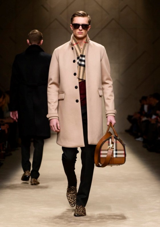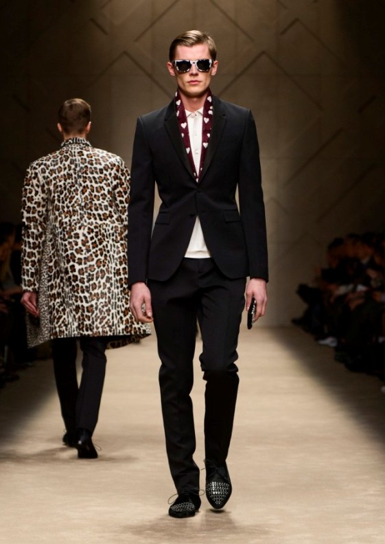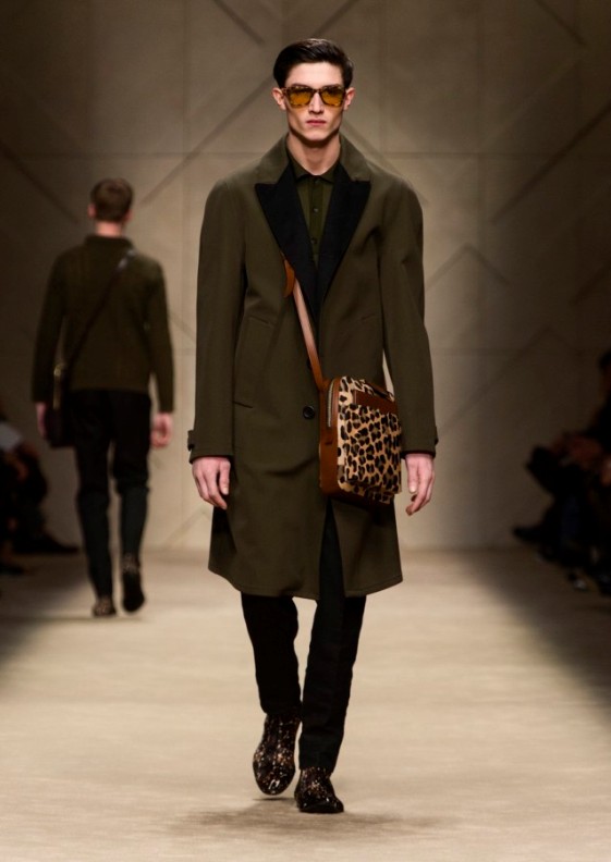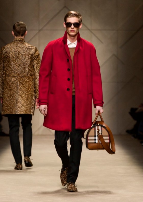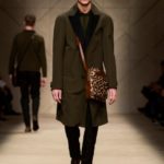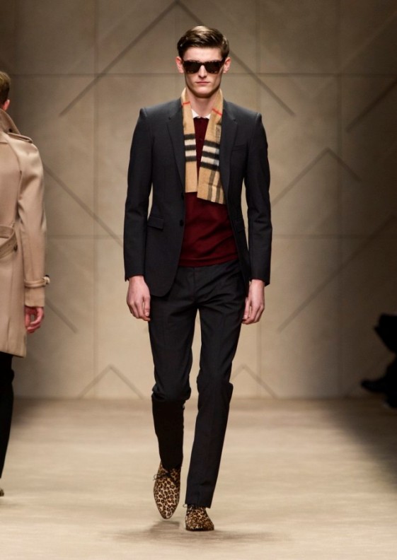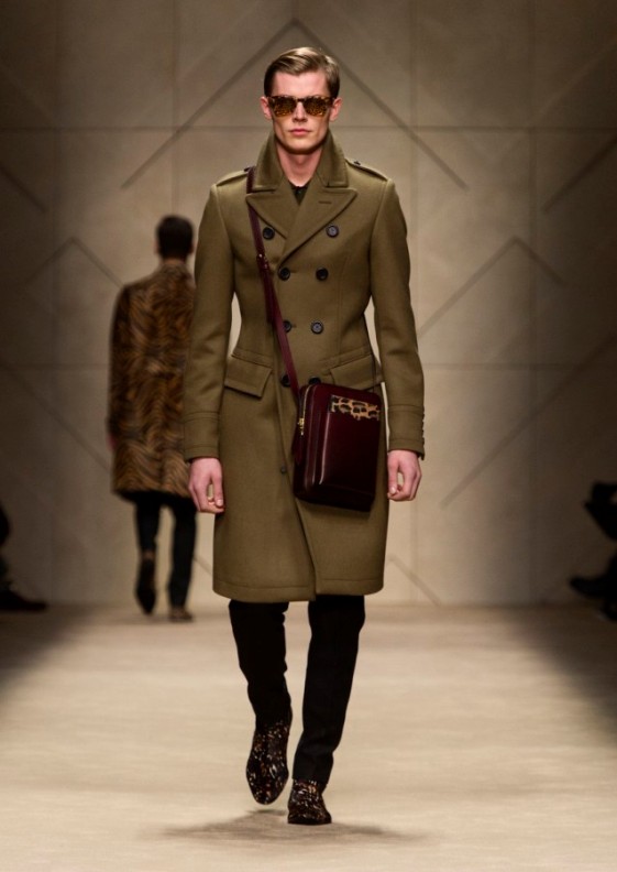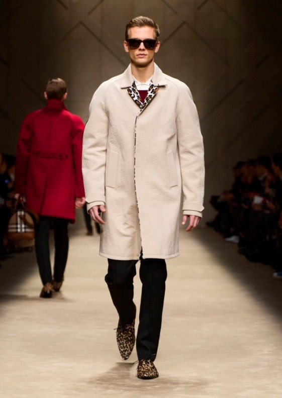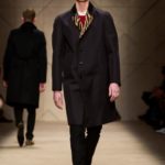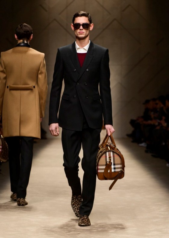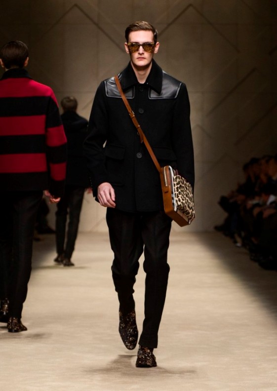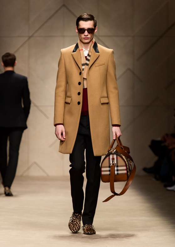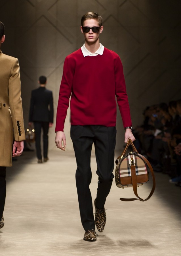 L’eleganza che contraddistingue la casa di moda domina la passerella con ampi cappotti, trench e montgomery dal taglio classico, con le iconiche sciarpe stampa Burberry e con il beige e il bordeaux come colori guida. Il perfetto gentleman inglese sceglie capispalla impeccabili, dalla linea pulita e con le silhouette morbide del caban e del cappotto doppio petto; indossa anche soprabiti imbottiti impermeabili o con colletto di velluto a contrasto, giacche dal taglio sartoriale, bomber e utility jacket. Il look si completa con maglioni di lana, polo e pantaloni dalla linea slim; la stravaganza invece è metropolitana e lasciata ai dettagli: stampe animalier rivestono scarpe, borse e revers dei cappotti così come sorprendenti cuori traforati imprimono maglioni, camicie e revers delle giacche. Gli accessori fanno davvero la differenza, sono il vero tocco fashion della collezione; l’uomo Burberry sa accostare il classico cappotto beige e l’eterna sciarpa in cachemire con stampa check a scarpe stampate dalla punta borchiata e borse boston dal disegno leopardato. Non mancano insieme alle cartelle e ai borsoni anche le moderne custodie per iPad, iPhone e addirittura per il mini iPad; al polso orologi the Britan e per uno sguardo intrigante dei classici occhiali da sole squadrati con stampe.