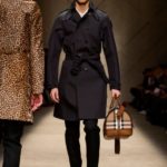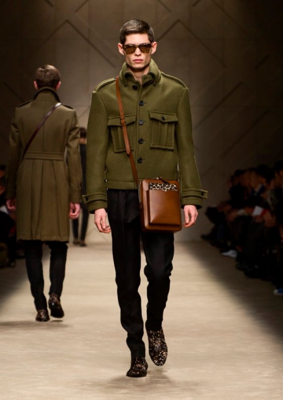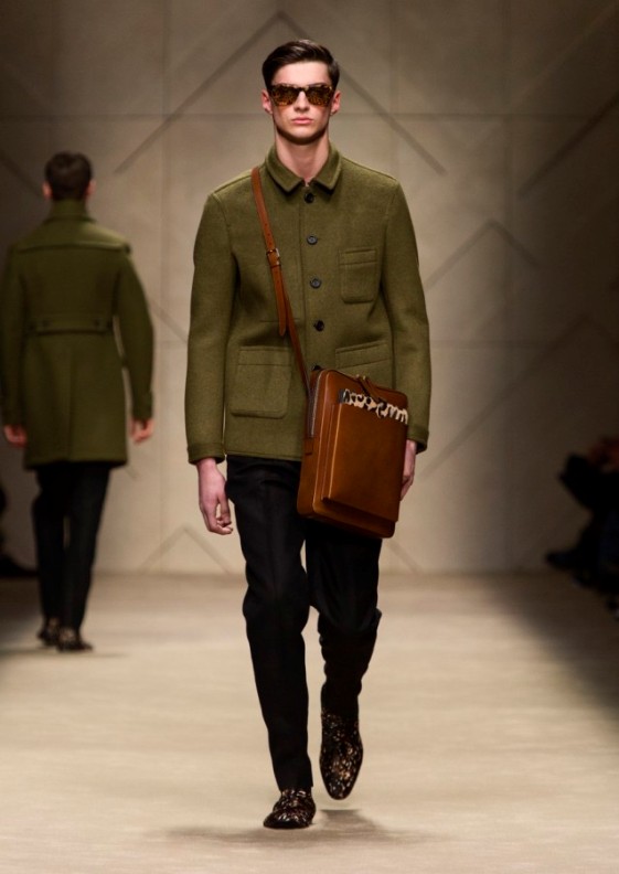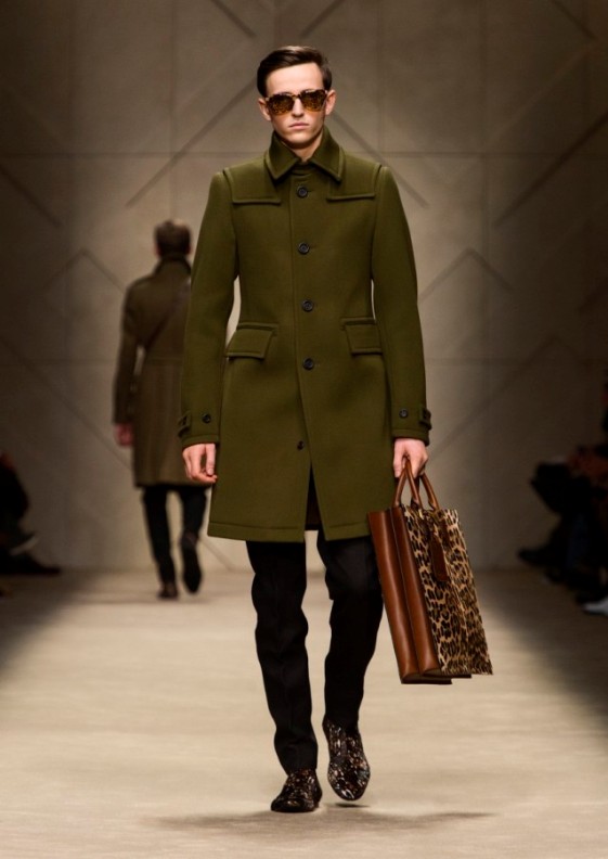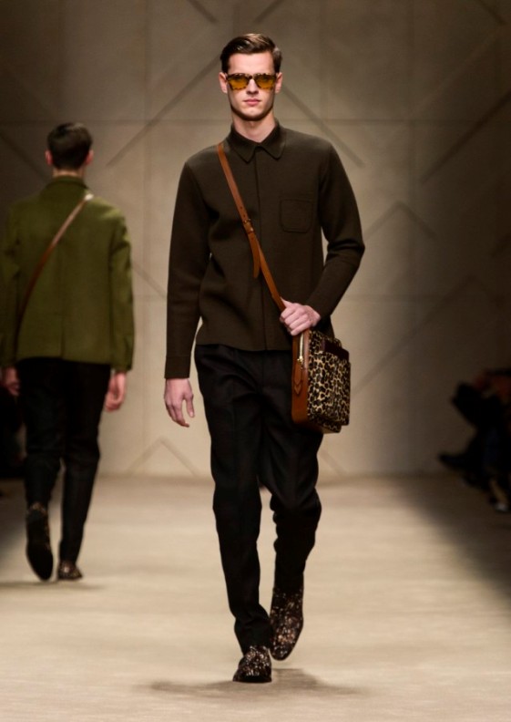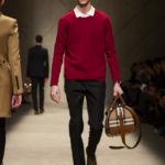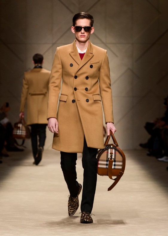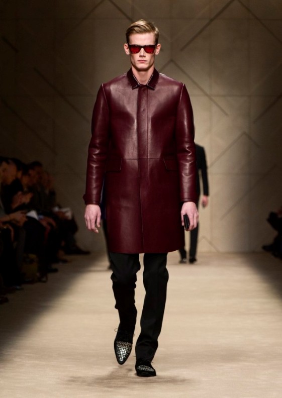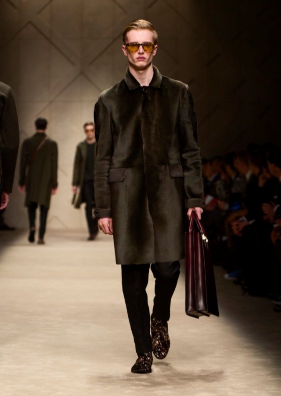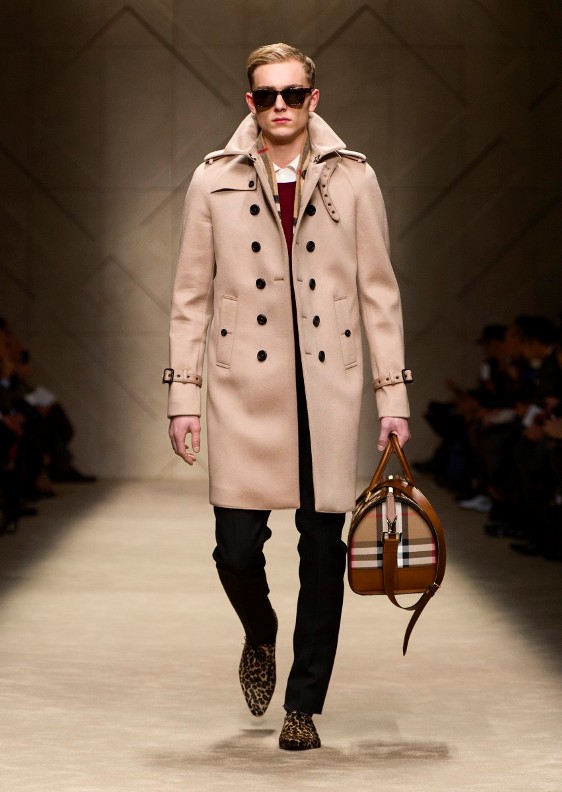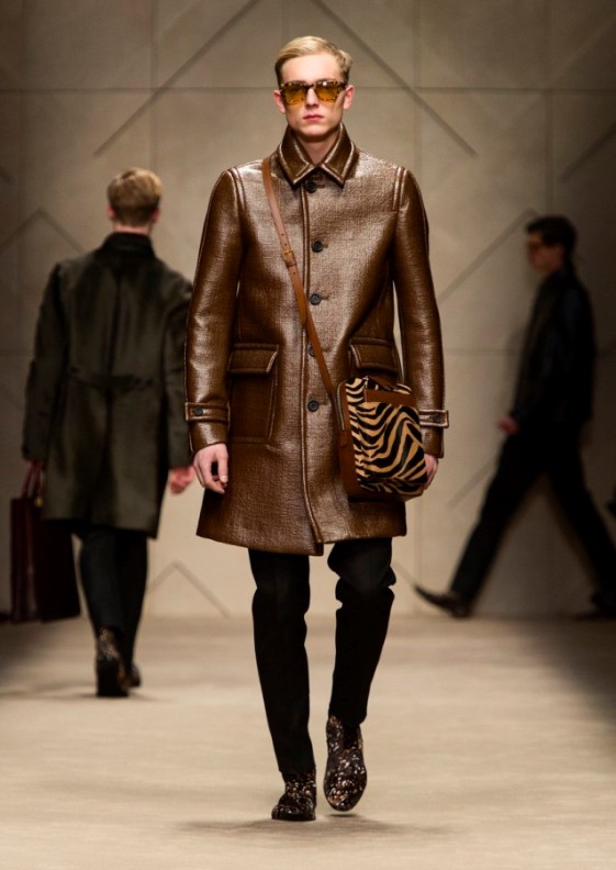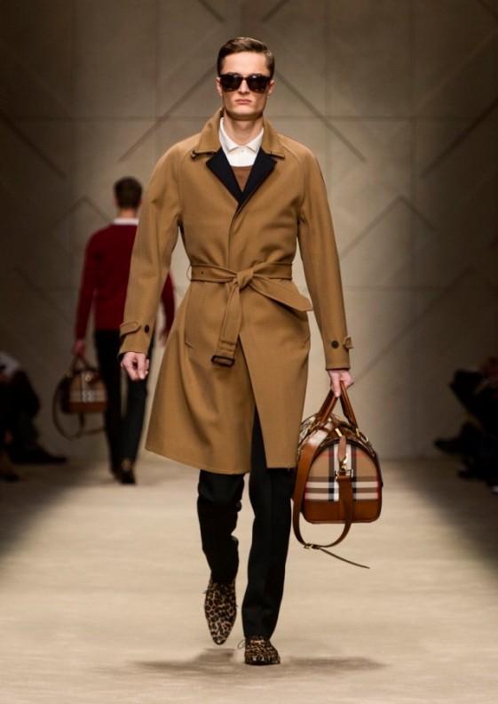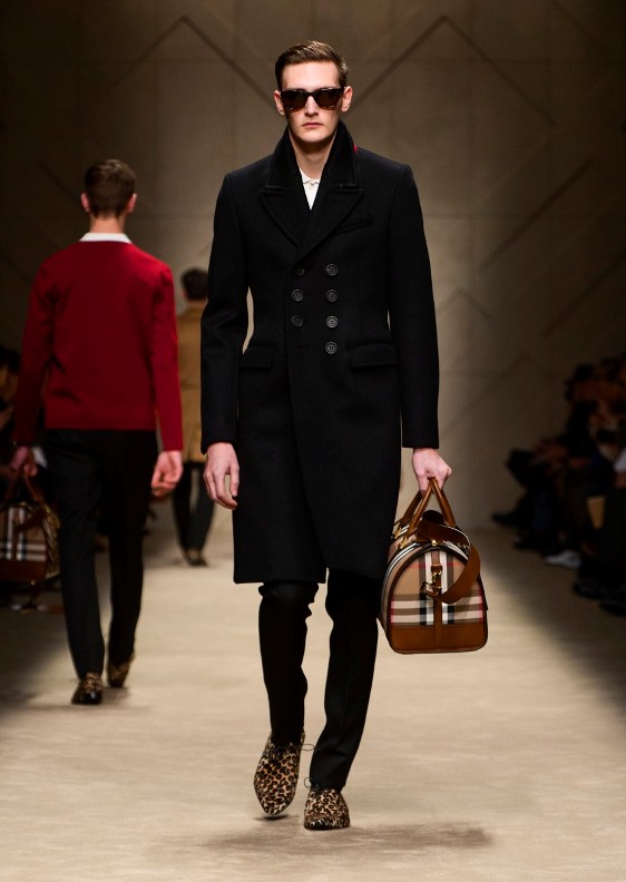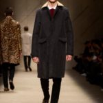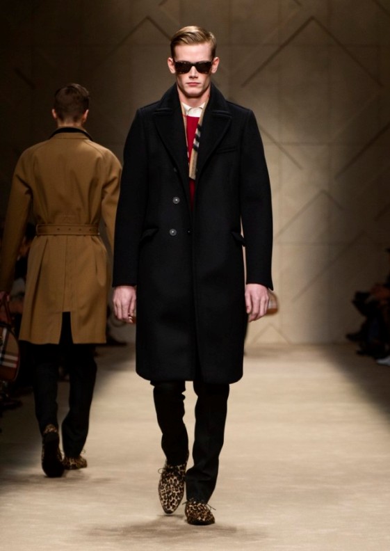 L’eleganza che contraddistingue la casa di moda domina la passerella con ampi cappotti, trench e montgomery dal taglio classico, con le iconiche sciarpe stampa Burberry e con il beige e il bordeaux come colori guida. Il perfetto gentleman inglese sceglie capispalla impeccabili, dalla linea pulita e con le silhouette morbide del caban e del cappotto doppio petto; indossa anche soprabiti imbottiti impermeabili o con colletto di velluto a contrasto, giacche dal taglio sartoriale, bomber e utility jacket. Il look si completa con maglioni di lana, polo e pantaloni dalla linea slim; la stravaganza invece è metropolitana e lasciata ai dettagli: stampe animalier rivestono scarpe, borse e revers dei cappotti così come sorprendenti cuori traforati imprimono maglioni, camicie e revers delle giacche. Gli accessori fanno davvero la differenza, sono il vero tocco fashion della collezione; l’uomo Burberry sa accostare il classico cappotto beige e l’eterna sciarpa in cachemire con stampa check a scarpe stampate dalla punta borchiata e borse boston dal disegno leopardato. Non mancano insieme alle cartelle e ai borsoni anche le moderne custodie per iPad, iPhone e addirittura per il mini iPad; al polso orologi the Britan e per uno sguardo intrigante dei classici occhiali da sole squadrati con stampe.