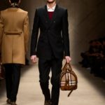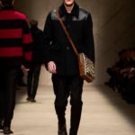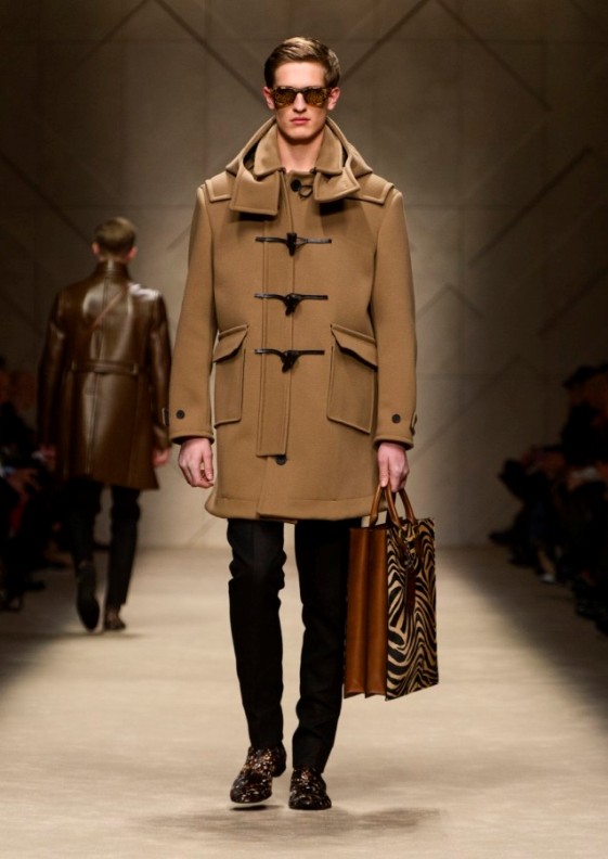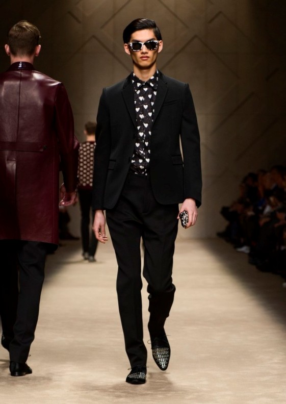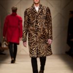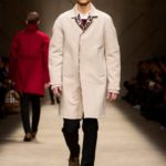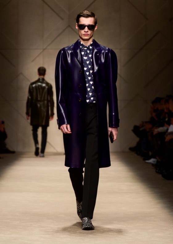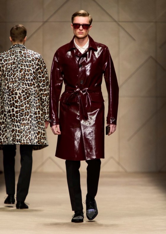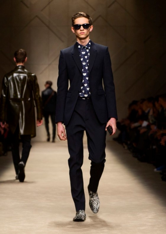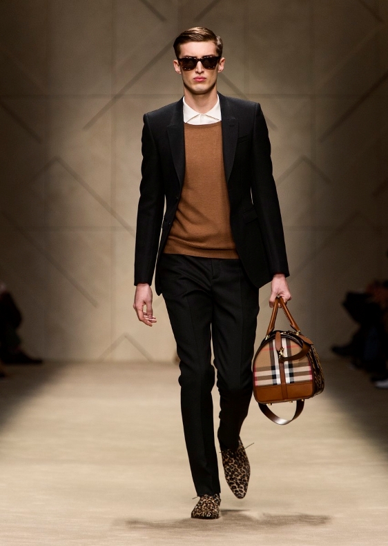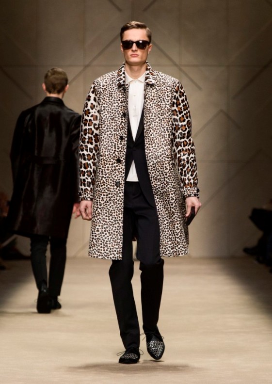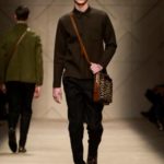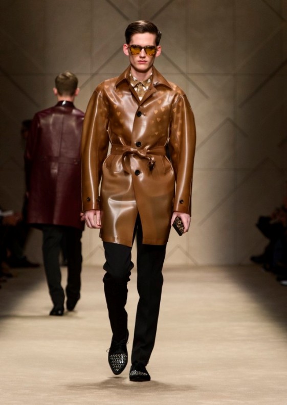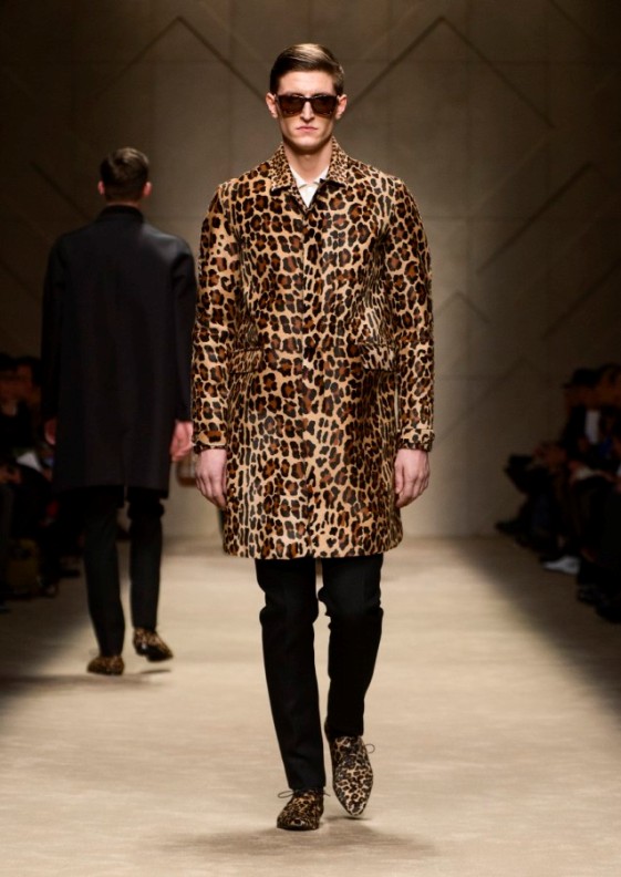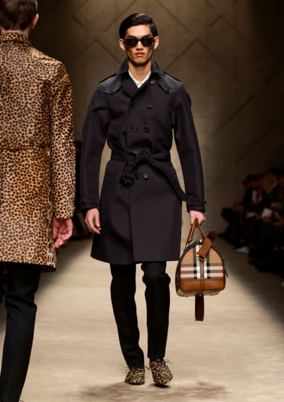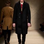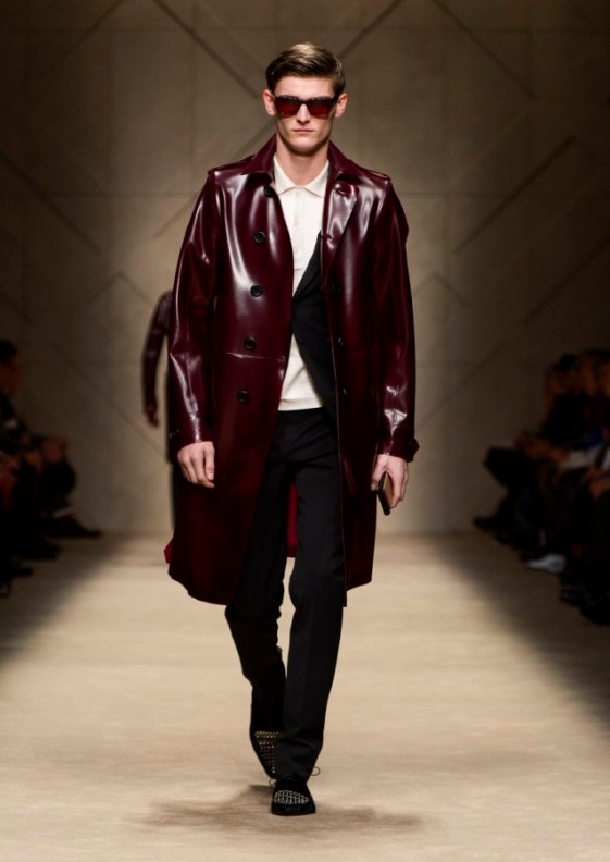 L’eleganza che contraddistingue la casa di moda domina la passerella con ampi cappotti, trench e montgomery dal taglio classico, con le iconiche sciarpe stampa Burberry e con il beige e il bordeaux come colori guida. Il perfetto gentleman inglese sceglie capispalla impeccabili, dalla linea pulita e con le silhouette morbide del caban e del cappotto doppio petto; indossa anche soprabiti imbottiti impermeabili o con colletto di velluto a contrasto, giacche dal taglio sartoriale, bomber e utility jacket. Il look si completa con maglioni di lana, polo e pantaloni dalla linea slim; la stravaganza invece è metropolitana e lasciata ai dettagli: stampe animalier rivestono scarpe, borse e revers dei cappotti così come sorprendenti cuori traforati imprimono maglioni, camicie e revers delle giacche. Gli accessori fanno davvero la differenza, sono il vero tocco fashion della collezione; l’uomo Burberry sa accostare il classico cappotto beige e l’eterna sciarpa in cachemire con stampa check a scarpe stampate dalla punta borchiata e borse boston dal disegno leopardato. Non mancano insieme alle cartelle e ai borsoni anche le moderne custodie per iPad, iPhone e addirittura per il mini iPad; al polso orologi the Britan e per uno sguardo intrigante dei classici occhiali da sole squadrati con stampe.