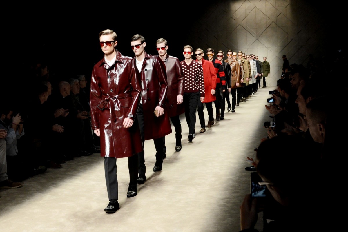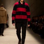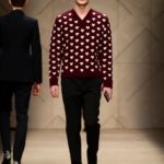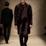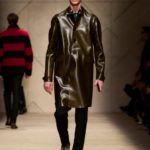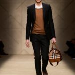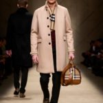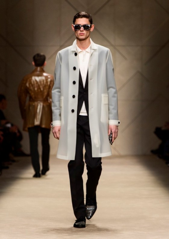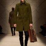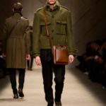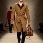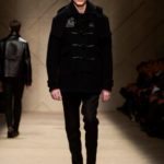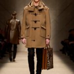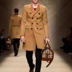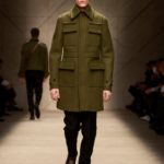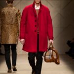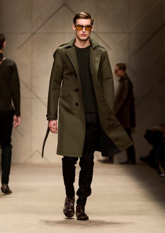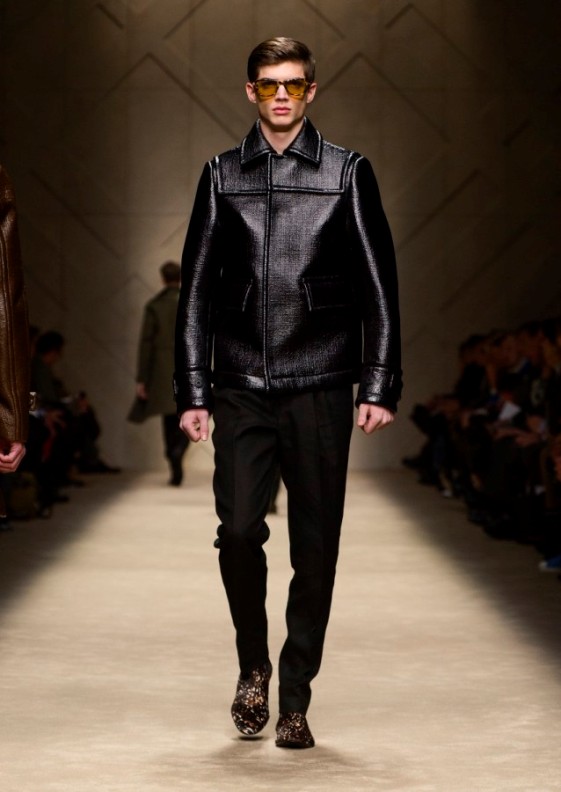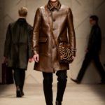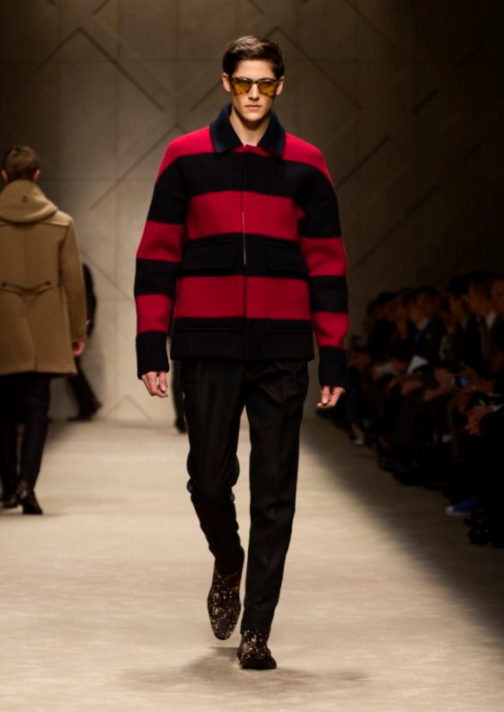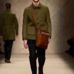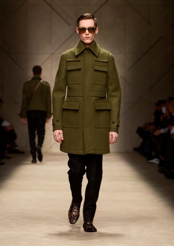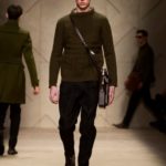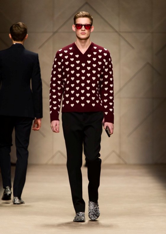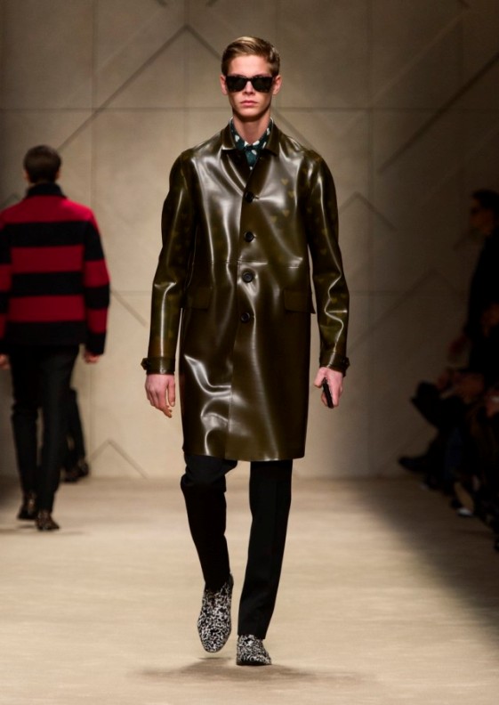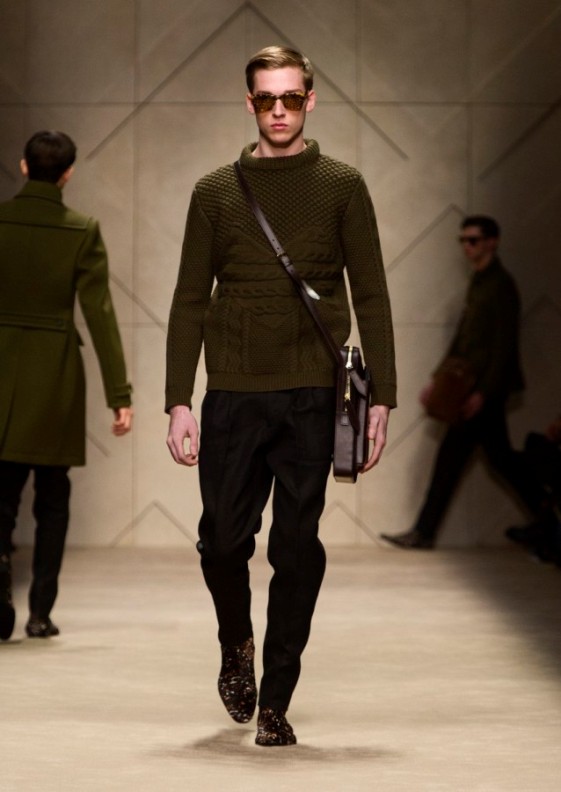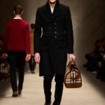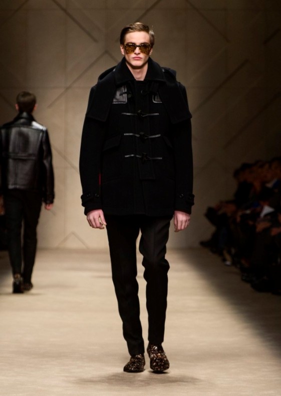 L’eleganza che contraddistingue la casa di moda domina la passerella con ampi cappotti, trench e montgomery dal taglio classico, con le iconiche sciarpe stampa Burberry e con il beige e il bordeaux come colori guida. Il perfetto gentleman inglese sceglie capispalla impeccabili, dalla linea pulita e con le silhouette morbide del caban e del cappotto doppio petto; indossa anche soprabiti imbottiti impermeabili o con colletto di velluto a contrasto, giacche dal taglio sartoriale, bomber e utility jacket. Il look si completa con maglioni di lana, polo e pantaloni dalla linea slim; la stravaganza invece è metropolitana e lasciata ai dettagli: stampe animalier rivestono scarpe, borse e revers dei cappotti così come sorprendenti cuori traforati imprimono maglioni, camicie e revers delle giacche. Gli accessori fanno davvero la differenza, sono il vero tocco fashion della collezione; l’uomo Burberry sa accostare il classico cappotto beige e l’eterna sciarpa in cachemire con stampa check a scarpe stampate dalla punta borchiata e borse boston dal disegno leopardato. Non mancano insieme alle cartelle e ai borsoni anche le moderne custodie per iPad, iPhone e addirittura per il mini iPad; al polso orologi the Britan e per uno sguardo intrigante dei classici occhiali da sole squadrati con stampe.