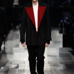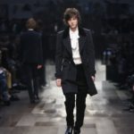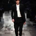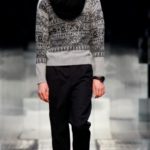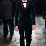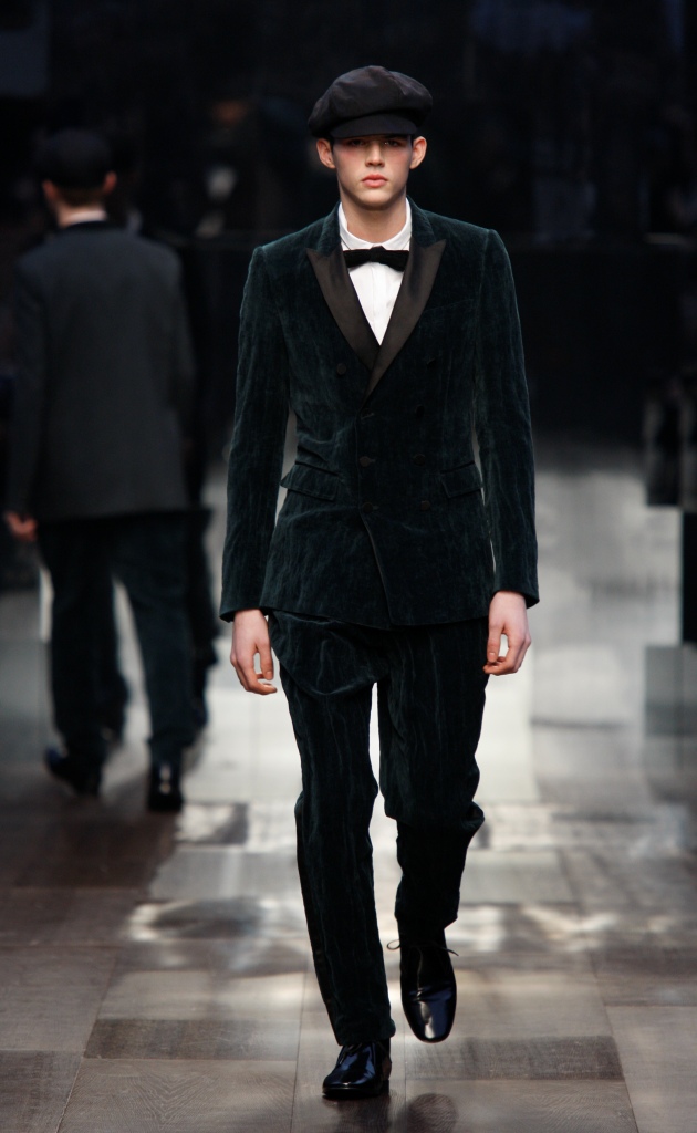 Accanto a tessuti più di tendenza, come il velluto stropicciato, compaiono i più tradizionali gessati, i tweed spigati. Accanto all’ottocentesco berretto e all’altrettanto ottocentesco nastrino per chiudere la camicia, accessori cult come stivaletti di vitello lucido, stivali in pelle con suola a carro armato in gomma, grandi borse con cerniera e guanti con polsini in maglia.
