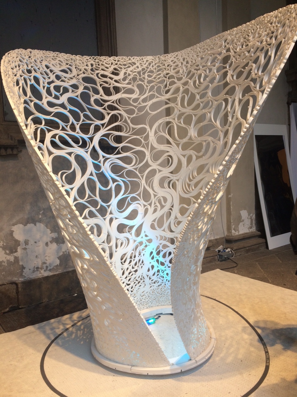 Nomi altisonanti coinvolti nella realizzazione di questa via lattea tangibile: nel cortile dell’Accademia Stefano Boeri (affascinante la sua candida “Stanza degli abbracci”, luogo atto a custodire un prezioso gesto) e David Chipperfield, Aires Mateus (il suo “Vuoto di luce” incanta e si avvicina al concetto di sublime) e Daniel Libeskind, Marco Piva e lo studio Zaha Hadid (sinuosa ed elegantissima la perfetta sintesi scultorea – connubio tra robotica sperimentazione ed arte- denominata Thallus, parola greca che definisce in botanica l’attimo in cui non vi è alcuna differenziazione tra stelo e foglia), Patricia Urquola (con la sua scala chiamata “Oltre” per poter osservare il mondo da un altro punto di vista)……ma anche giovani designer –White Young, la mostra allestita nel loft del Class Editori spazio– pronti come sentinelle a interpretare la vitalità e la forza del bianco con creazioni innovative e originalissime; inoltre, varie e innumerevoli aziende aderenti al progetto gettate come positive meteore qua e là a testimonianza della scelta stabilita.