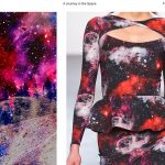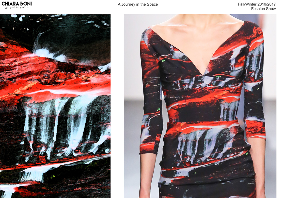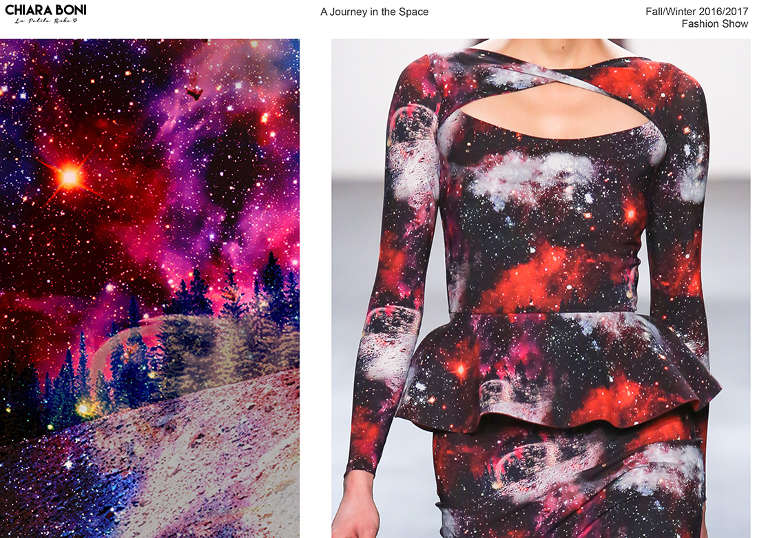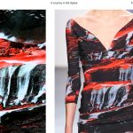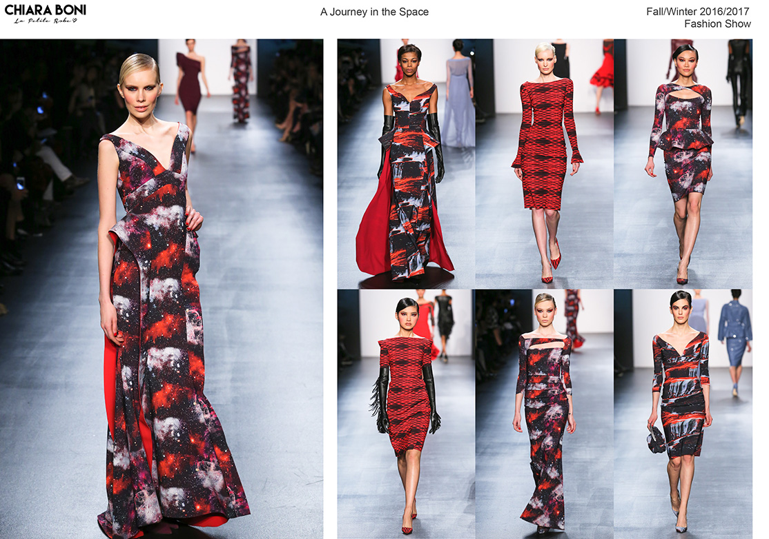 L’ispirazione alla base è cambiata tante volte, condizionando il mio lavoro! Alla fine si è optato per una combinazione tra futuro, spazio ed architettura avveniristica. Siccome nella cartella colori i rossi la facevano da padrone assieme al nero, ho preso con fonte d’ispirazione il pianeta rosso per eccellenza, Marte. Ho cercato innumerevoli immagini su internet per creare collage fotografici da impiegare come stampe. Mi sono così concentrata su paesaggi naturali brulli e rocciosi; costellazioni, cieli stellati, fenomeni gassosi e galassie; architettura contemporanea di impronta futuristica. Il passo successivo è stato abbinarle e sovrapporle attraverso Photoshop, per poi passarle sotto vari filtri per creare effetti particolari. In questo modo ho creato le stampe che sono finite nella sfilata di New York, evento che mi ha veramente emozionata perché non avrei mai pensato di ottenere tale riconoscimento col mio primo progetto lavorativo!