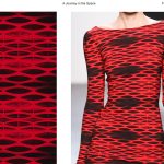 Invece le altre stampe le ho progettate come pattern fin dall’inizio, ad esempio quella che crea una sorta di effetto rete, che ho realizzato a partire dalla foto di un ponte che aveva proprio l’aspetto di una sorta di rete dai fori ampi ed ovali. Attraverso i filtri ho ottenuto un aspetto grafico e bicolore, optando per rosso e nero. Tra le stampe che hanno sfilato, questa è l’unica finita in commercio e ne sono state realizzate anche altre versioni, col nero abbinato a viola, verde e blu.