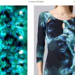 La prima stampa rappresentava un’esile cascata che scorre attraverso la roccia nera e macchie di muschio rosso, un paesaggio vagamente extraterrestre, resa tramite l’effetto di un dipinto ad acquerello. La seconda, invece, raffigurava un veduta spaziale attraversata da costellazioni e gas, le cui tonalità di grigio, viola e rosso spezzavano il nero dello sfondo, e vagamente sfumata si intravedeva una collina ricoperta da alberi, creando così un’atmosfera onirica. La mia idea iniziale era che fossero stampe piazzate ma, una volta passati i file alla stamperia, questa li ha trasformati in pattern. Tuttavia sono comunque entusiasta del risultato!