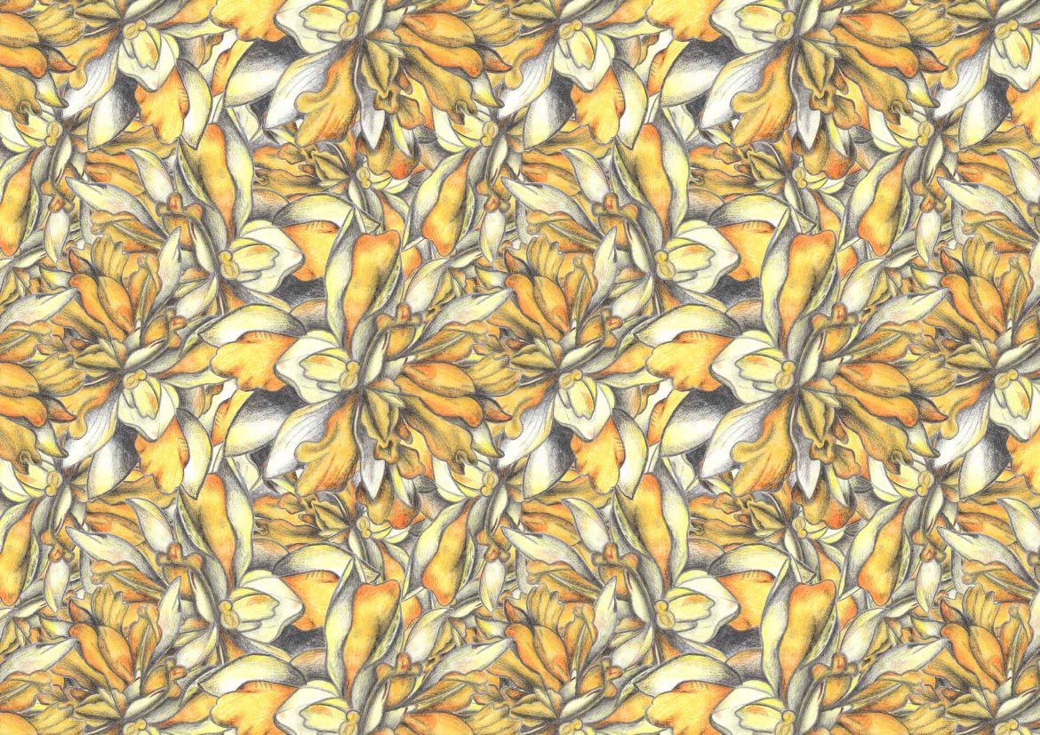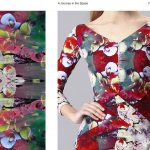 Dopo queste stampe, mi è stato chiesto di lavorare ad altre apposite per la vendita, avendo come idea di partenza “fiori spaziali”. Mi è subito venuto in mente di creare collage fotografici con fiori come peonie ed orchidee su uno sfondo come ad esempio un cielo stellato attraverso dall’aurora boreale, per creare giochi di luce e colori. Il risultato sono state due stampe, stavolta moduli ripetuti attraverso un gioco di riflessioni: la prima presentava orchidee multicolore sfumate su uno sfondo raffigurante un cielo nordico attraversato dall’aurora, il cui effetto si moltiplicava grazie al riflesso dell’acqua nel lago nei toni di rosso, verde, viola e grigio; la seconda, invece, raffigurava un girotondo di peonie su una volta celeste attraversata da costellazioni luminose e fenomeni gassosi, e ne sono state realizzate due versioni, una rossa ed un’altra azzurra.