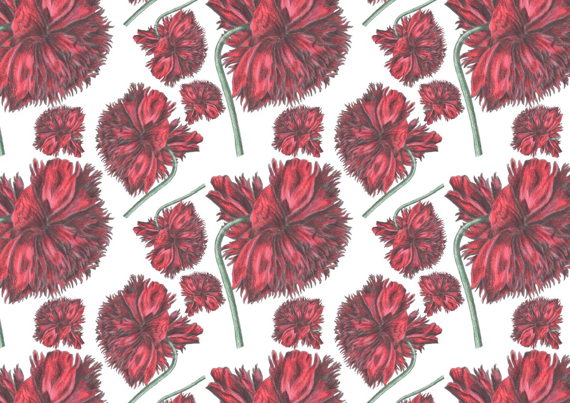 Tutti i disegni li ho colorati interamente a matita , sfumando poi il colore con le dita, poi però ho deciso di sviluppare qualche altra idea modificando i miei disegni col computer. Ho così disegnato un vestito lungo verde con importanti applicazioni a forma di papaveri che poi al computer ho inserito su uno sfondo costituito da uno dei miei pattern personali, in questo caso papaveri per riprendere il tema presente sull’abito.
