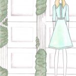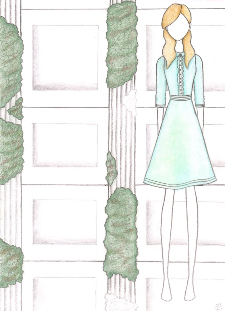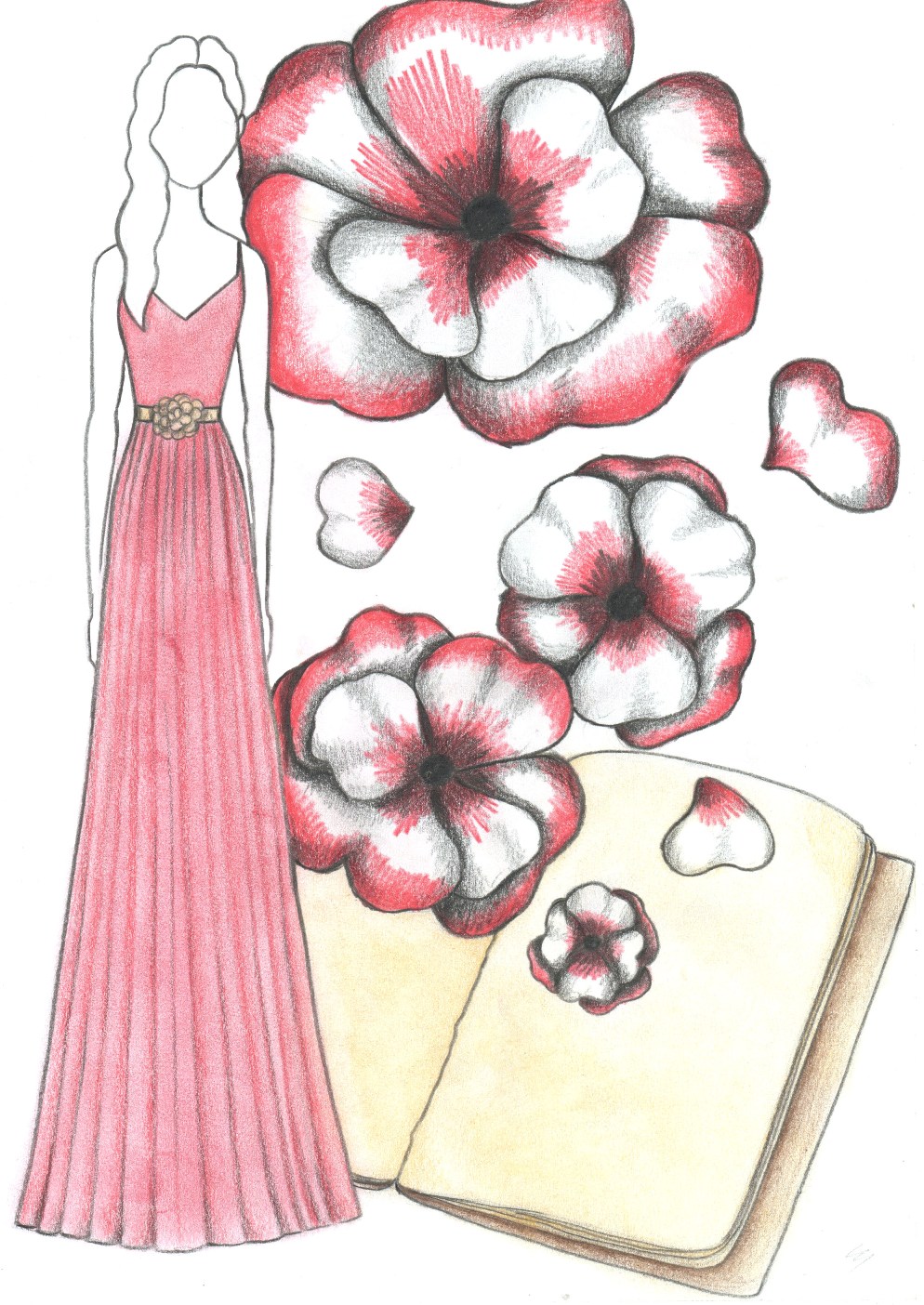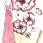 Così per primo ho disegnato un lungo abito bordeaux senza maniche con un fiore in vita di colore oro vivo chiaro accanto ad un antico libro aperto, come se fosse fuoriuscito da esso, allo stesso modo degli enormi fiori nelle stesse tonalità sullo sfondo bianco. Successivamente mi sono dedicata a qualcosa di più semplice, un vestito lungo color carta da zucchero sovrabbondante di ricami di ispirazione floreale e spaziale, a cui rimandano gli schizzi presenti in due angoli che risaltano sul fondale bianco. Sono poi tornata a fare qualcosa di più complicato quando ho disegnato un abito acquamarina corto con gonna svasata e corpetto allacciato come una camicia, collocato su uno sfondo di ispirazione architettonica che ho lasciato in bianco, interrotto da colonne ricoperte in alcuni punti da vegetazione, che ho colorato tranne che in qualche punto per dare un’idea di “non finito”.