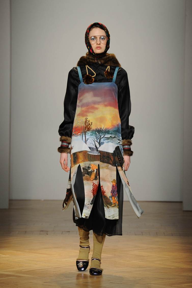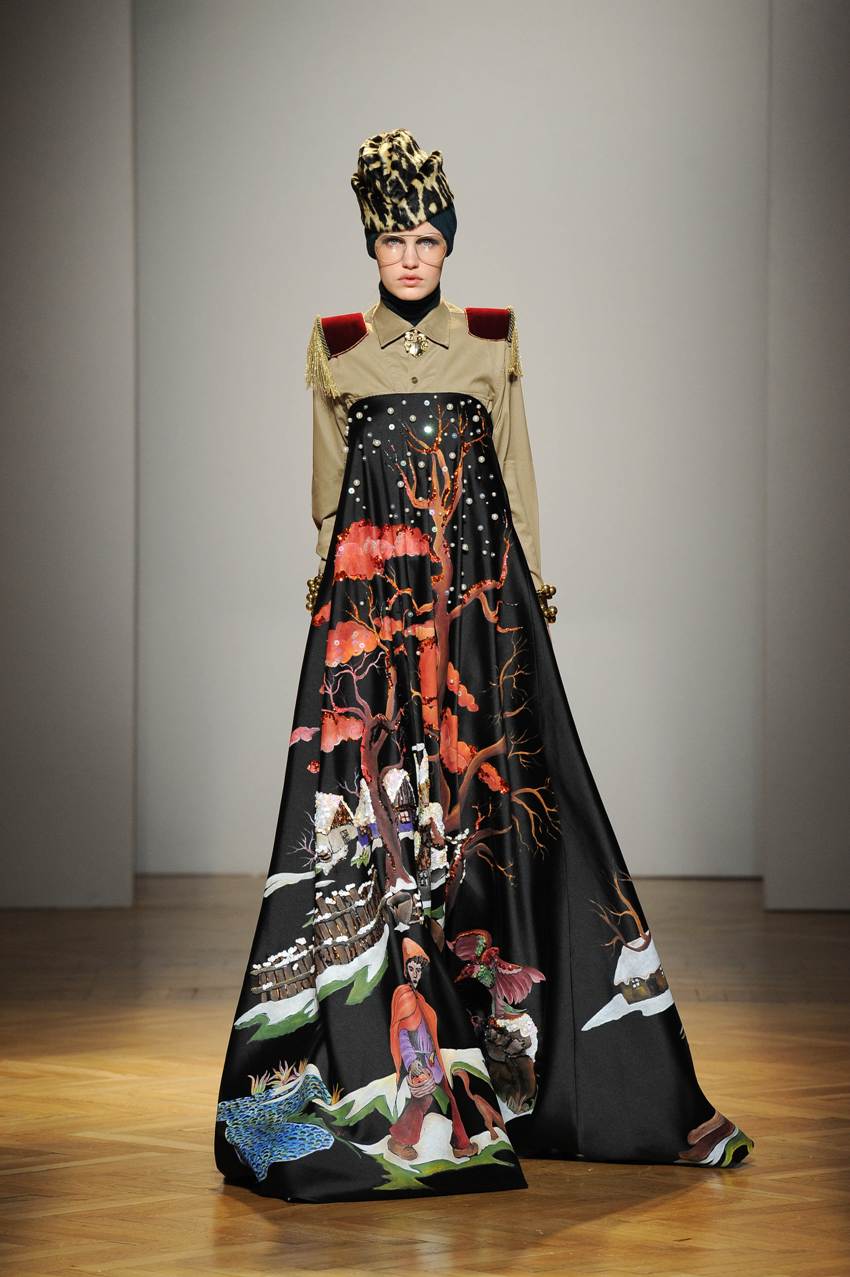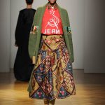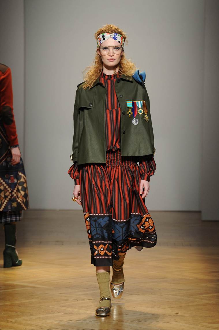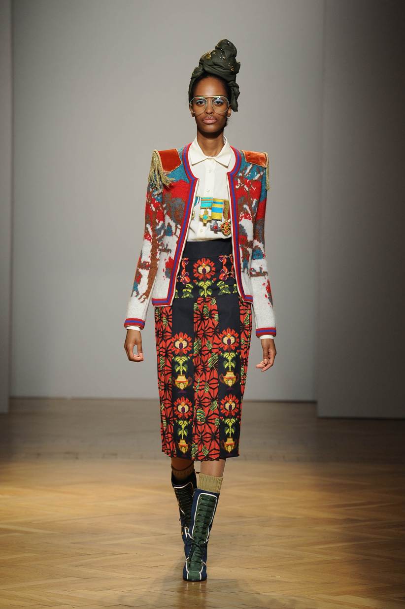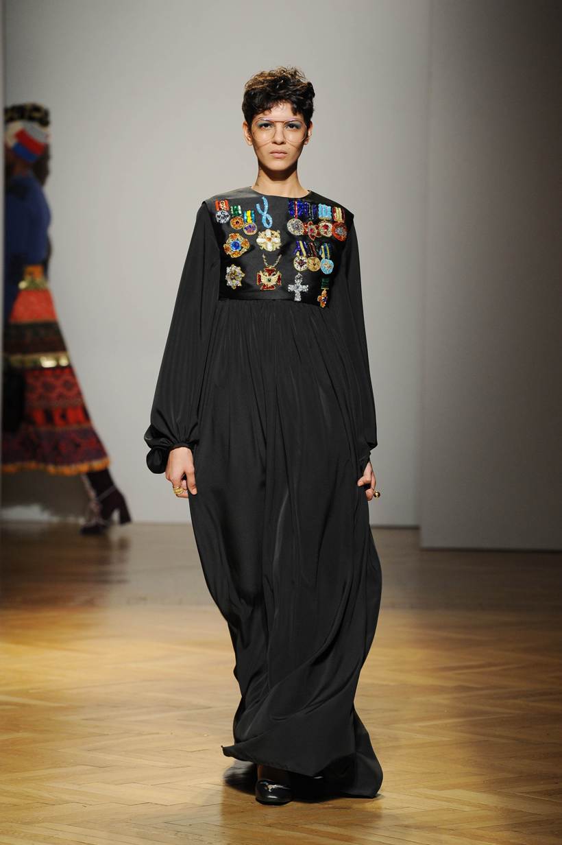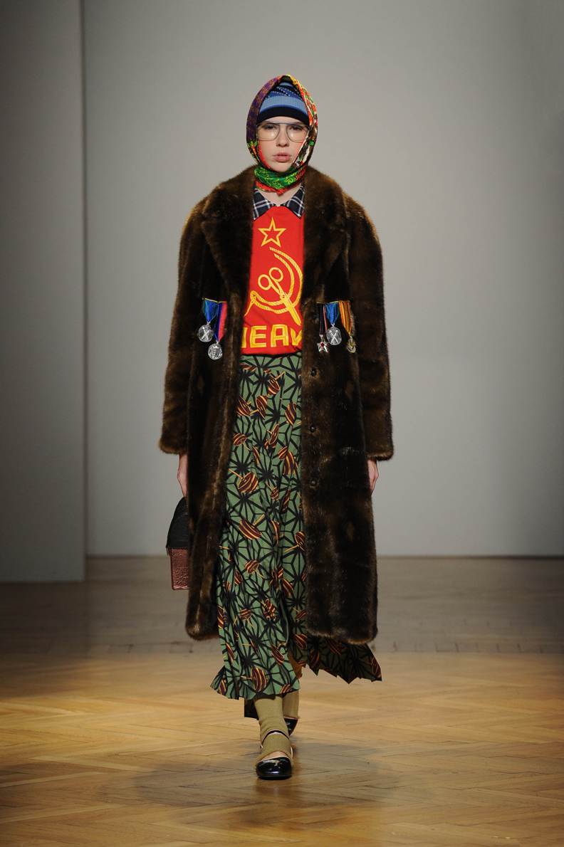Una performance stupefacente. La stilista mescola spudoratamente tutto: fonti di ispirazione, stampe, colori, materiali, lunghezze, forme; un melting pot pittoresco, incrocio di visioni e crogiolo di culture diverse e distanti. Convivono l’ispirazione militare, nei riferimenti alle armate statunitensi e sovietiche fatte di medaglie ricamate e di gradi militari, con il fiabesco candore dei pittori naif russi.
