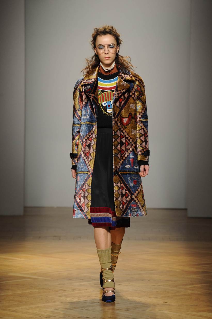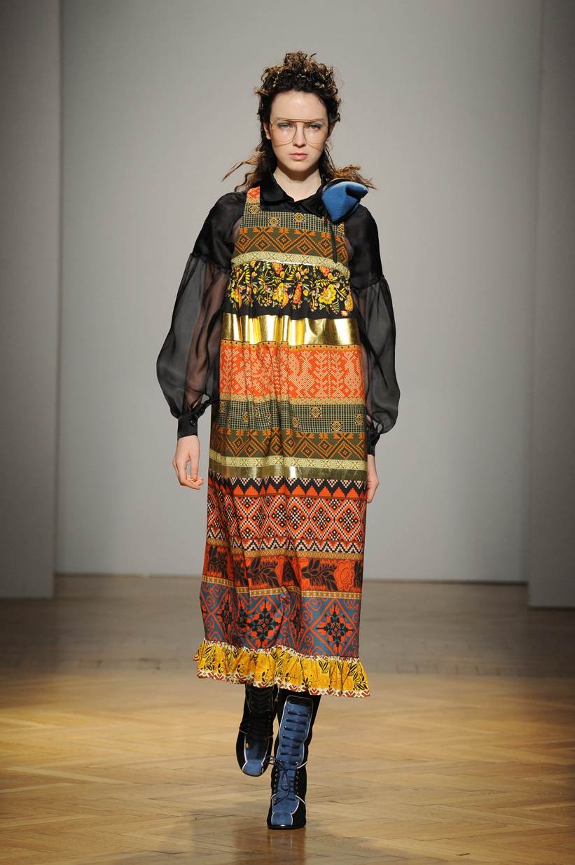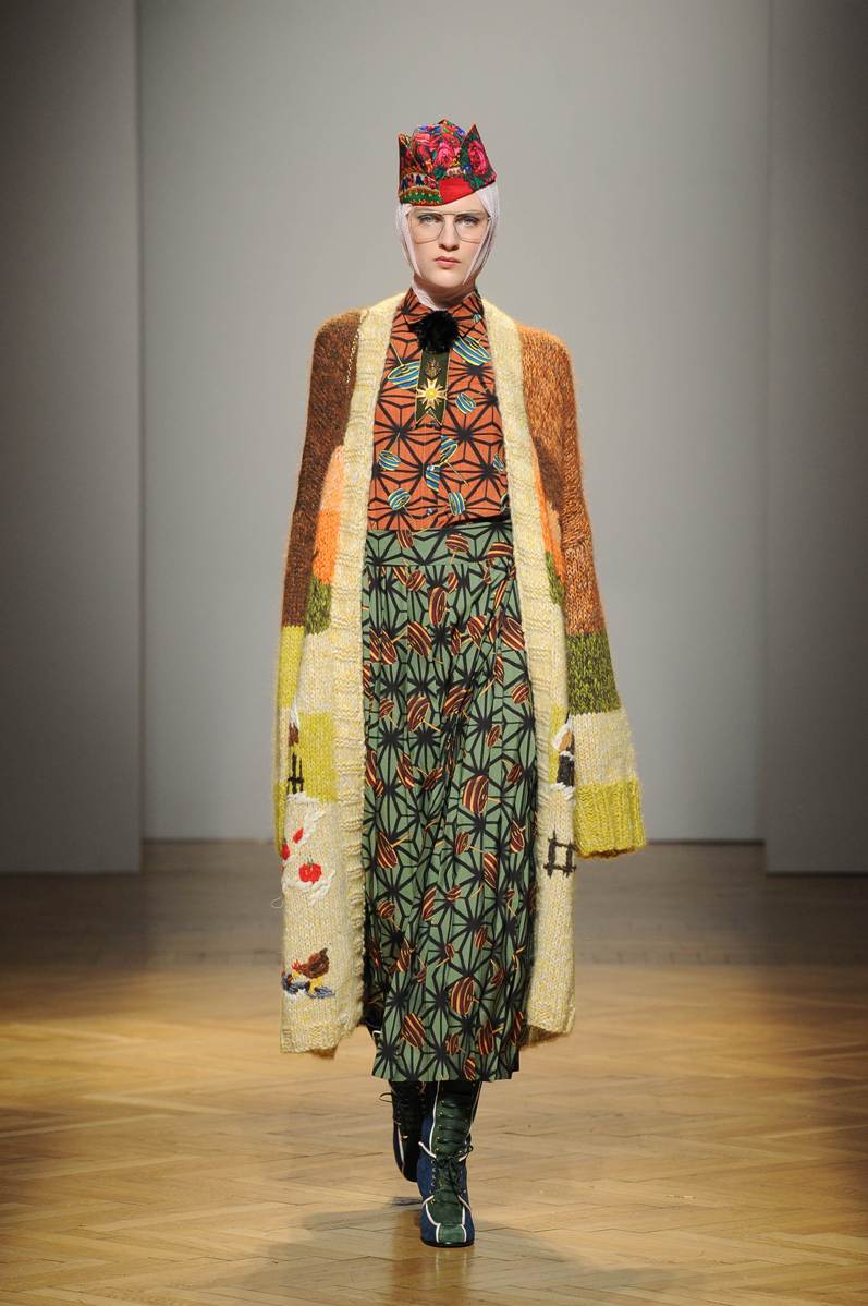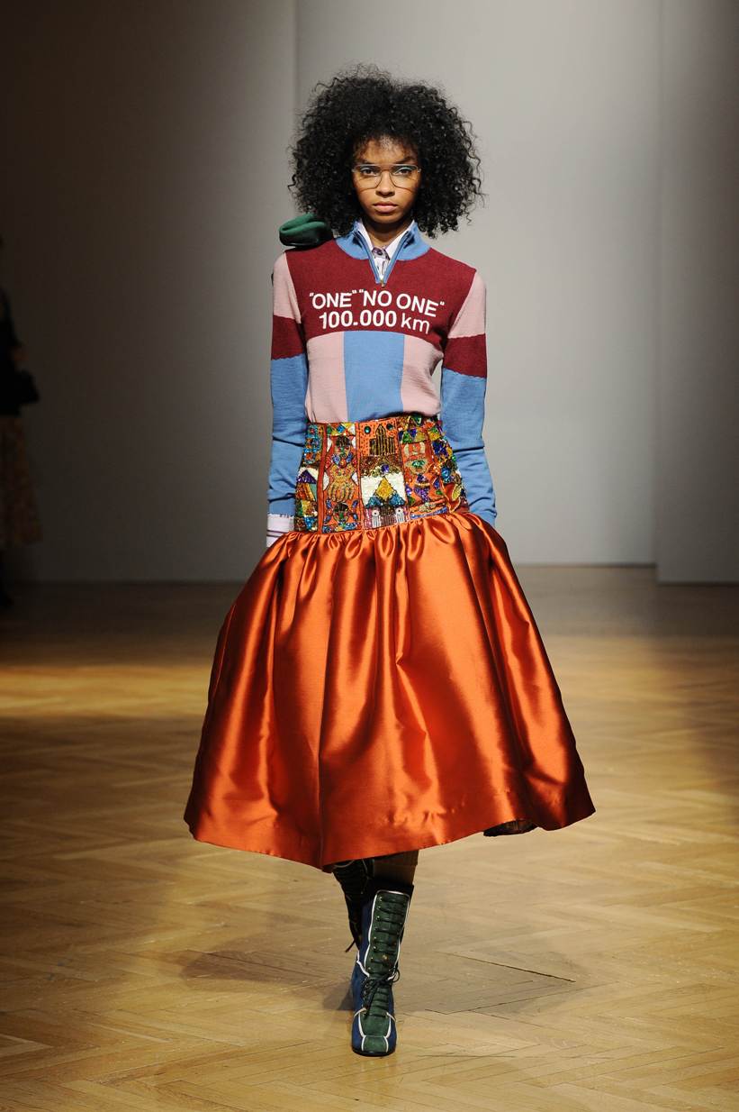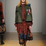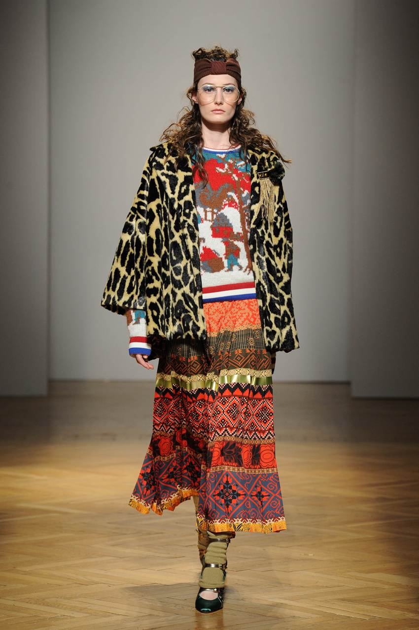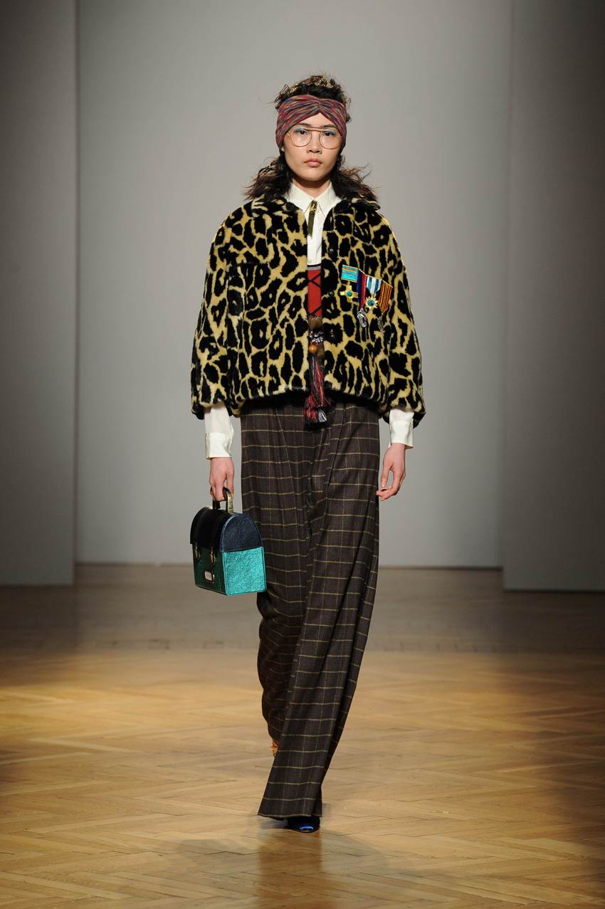 Una performance stupefacente. La stilista mescola spudoratamente tutto: fonti di ispirazione, stampe, colori, materiali, lunghezze, forme; un melting pot pittoresco, incrocio di visioni e crogiolo di culture diverse e distanti. Convivono l’ispirazione militare, nei riferimenti alle armate statunitensi e sovietiche fatte di medaglie ricamate e di gradi militari, con il fiabesco candore dei pittori naif russi.