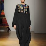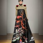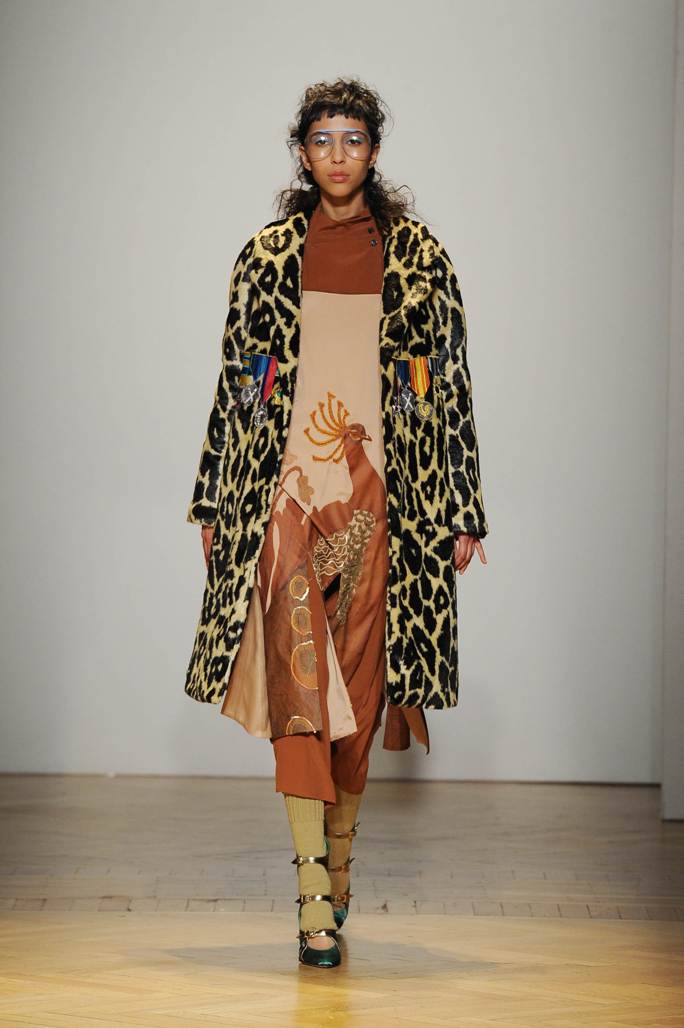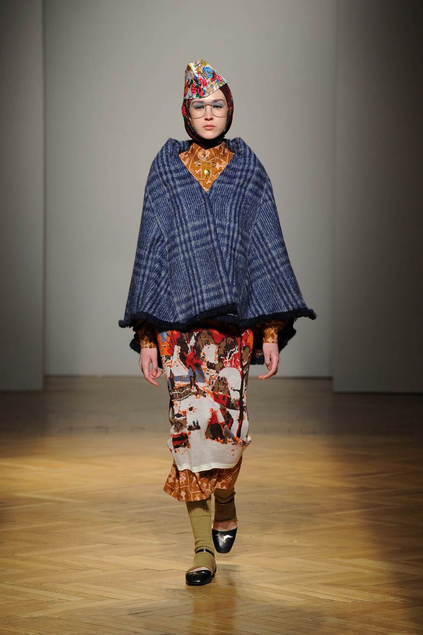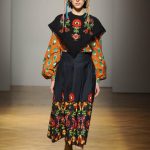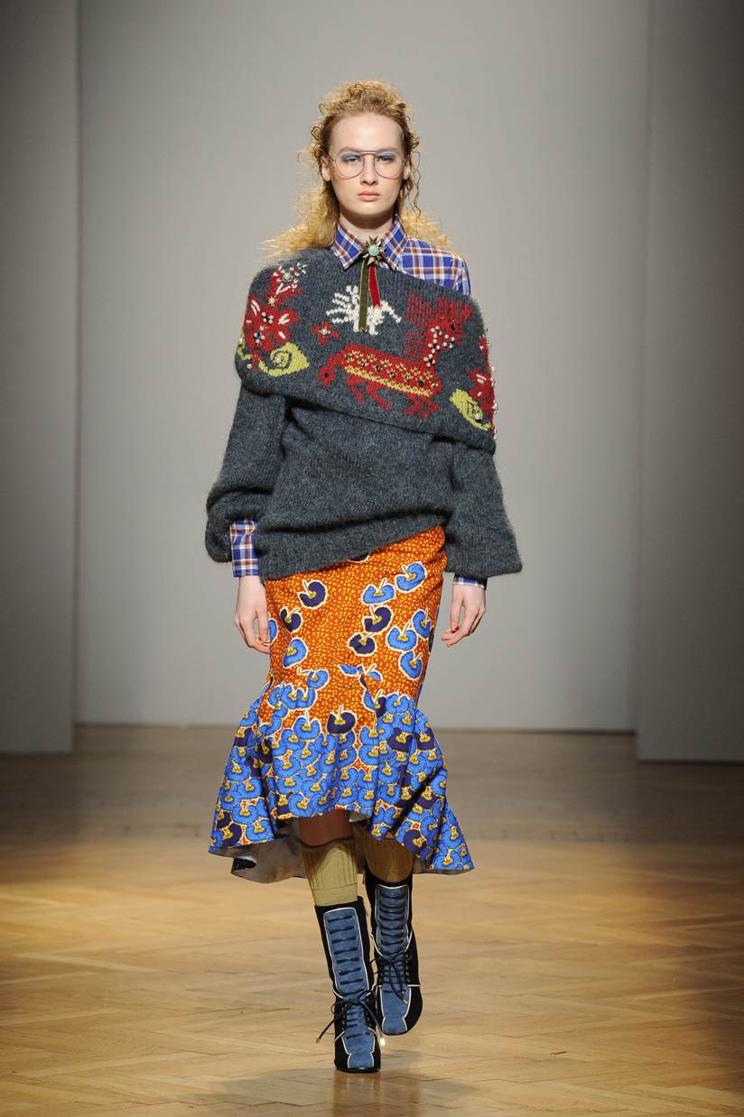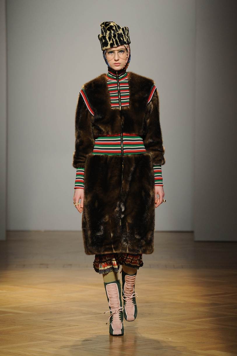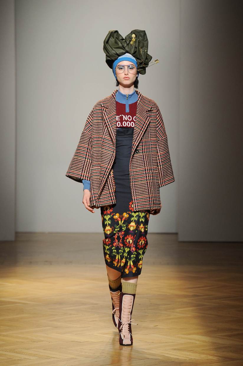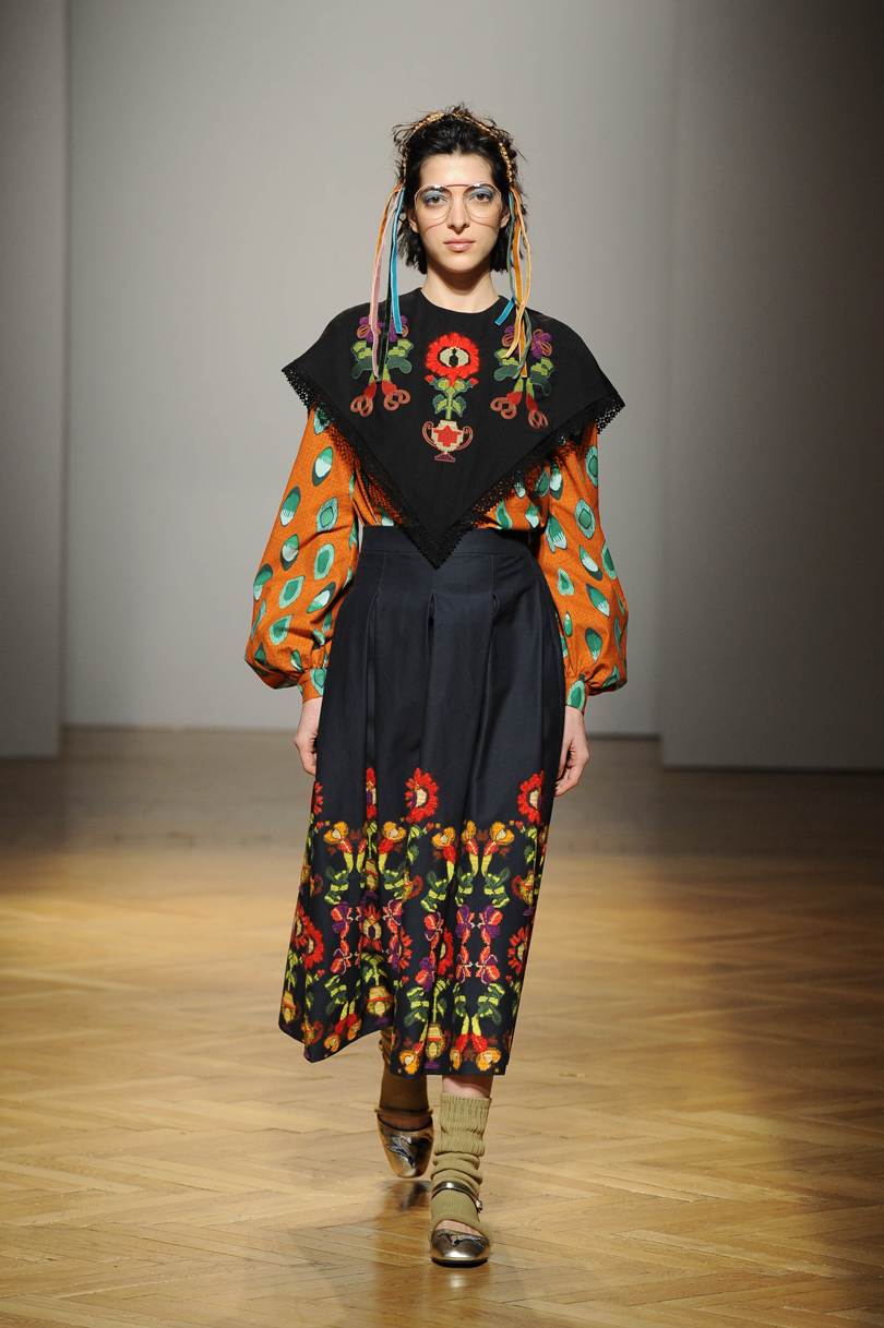 Una performance stupefacente. La stilista mescola spudoratamente tutto: fonti di ispirazione, stampe, colori, materiali, lunghezze, forme; un melting pot pittoresco, incrocio di visioni e crogiolo di culture diverse e distanti. Convivono l’ispirazione militare, nei riferimenti alle armate statunitensi e sovietiche fatte di medaglie ricamate e di gradi militari, con il fiabesco candore dei pittori naif russi.