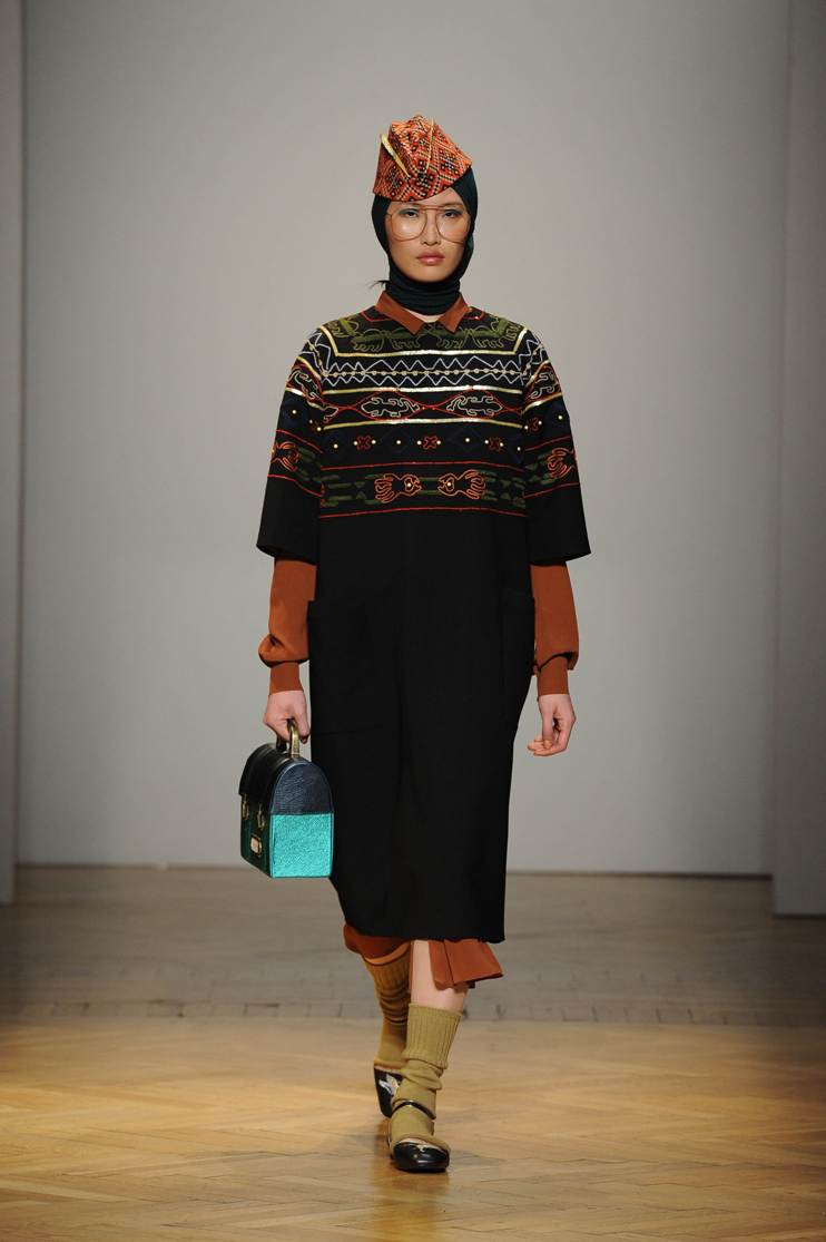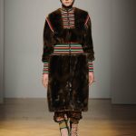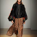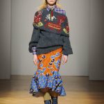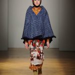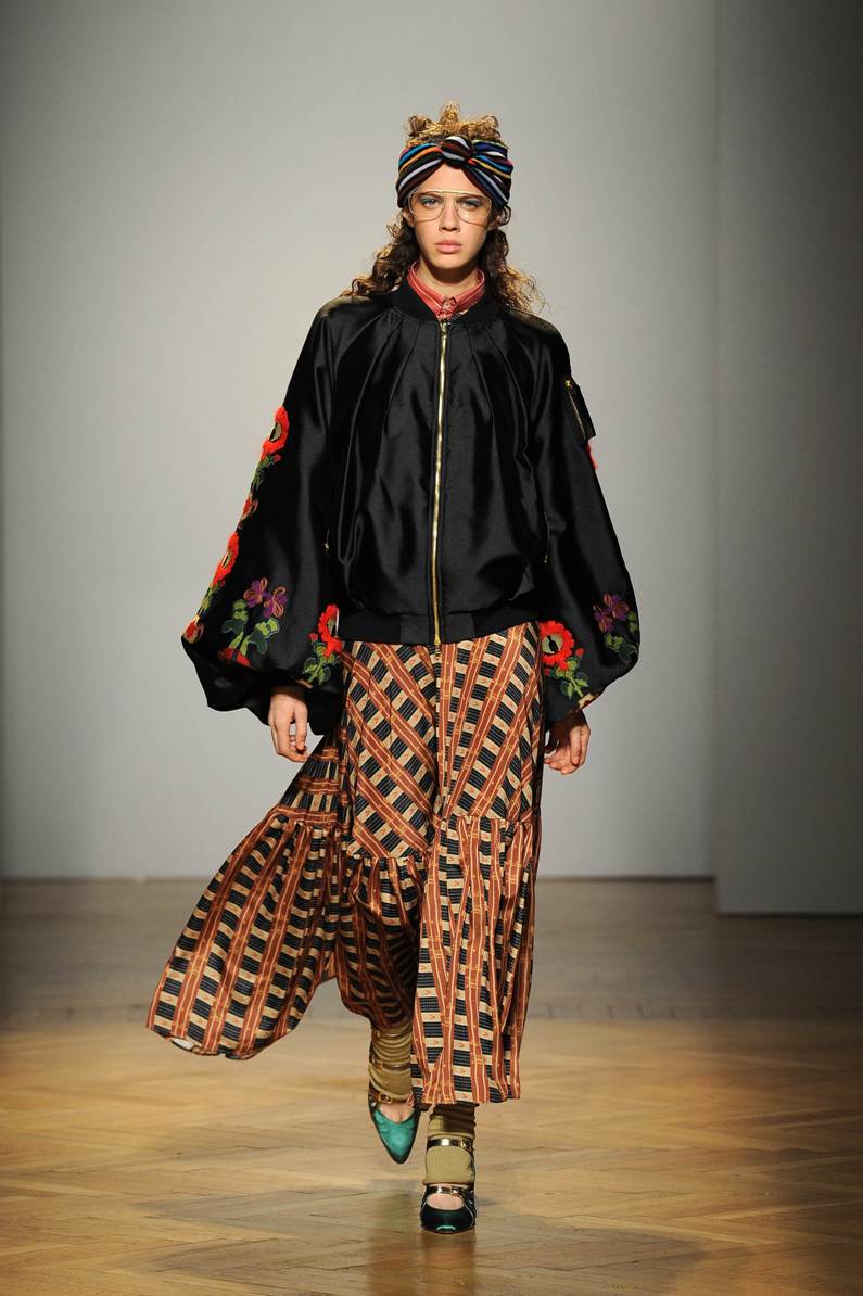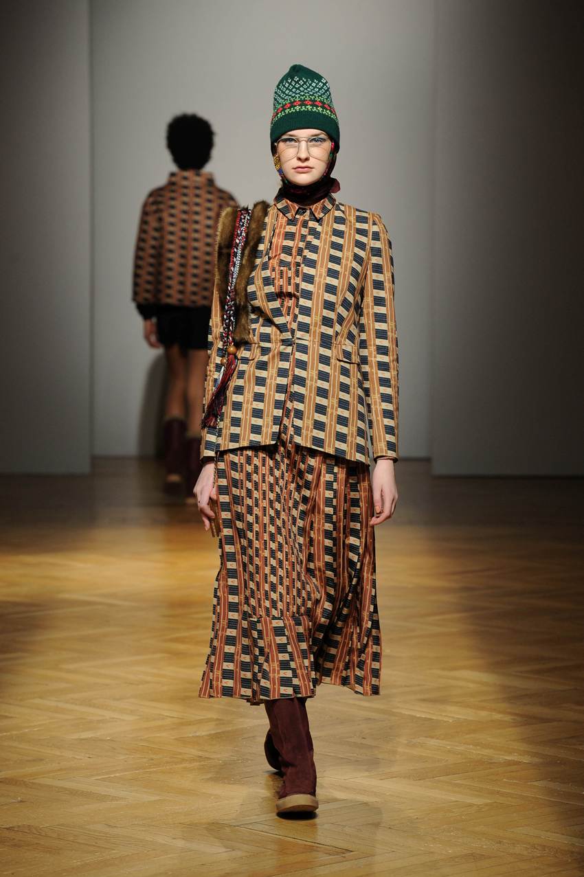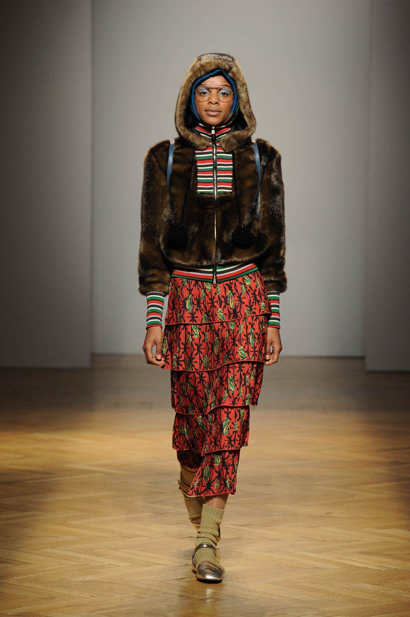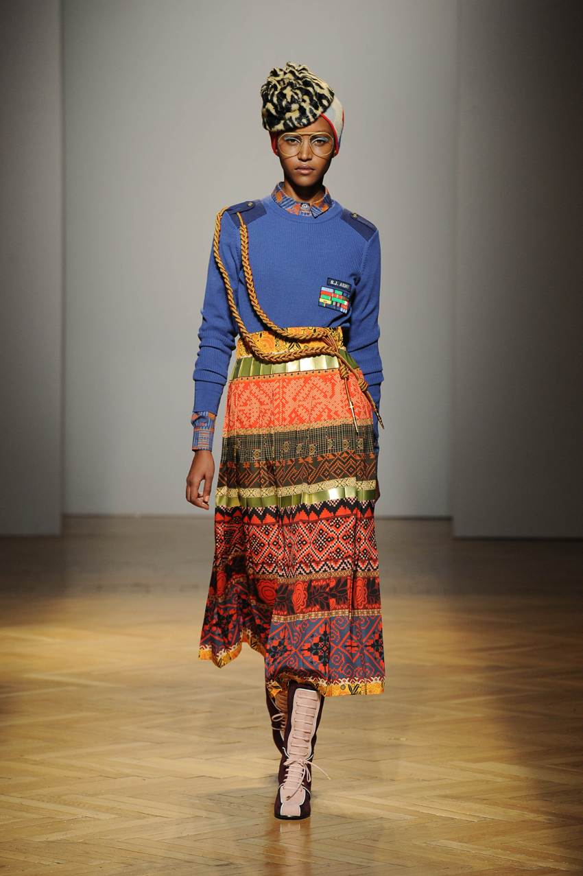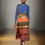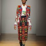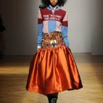 Una performance coinvolgente e non solo per l’accompagnamento musicale ritmato che accompagna ogni uscita. Stella Jean sa entusiasmare con la sua capacità di creare attingendo alle tradizioni popolari e culturali; accostando l’eco-pelliccia alla gonna con disegni africani; il giacchino a stampa di paesaggio siberiano con la gonna di tessuto africano. Bellissimi gli abiti e le gonne con i nevosi paesaggi russi portate con una camicia di stile militare. Ogni uscita è assolutamente nuova, nessun pezzo è ripetuto, ma il filo conduttore di ciò che la collezione deve comunicare non è mai smarrito.