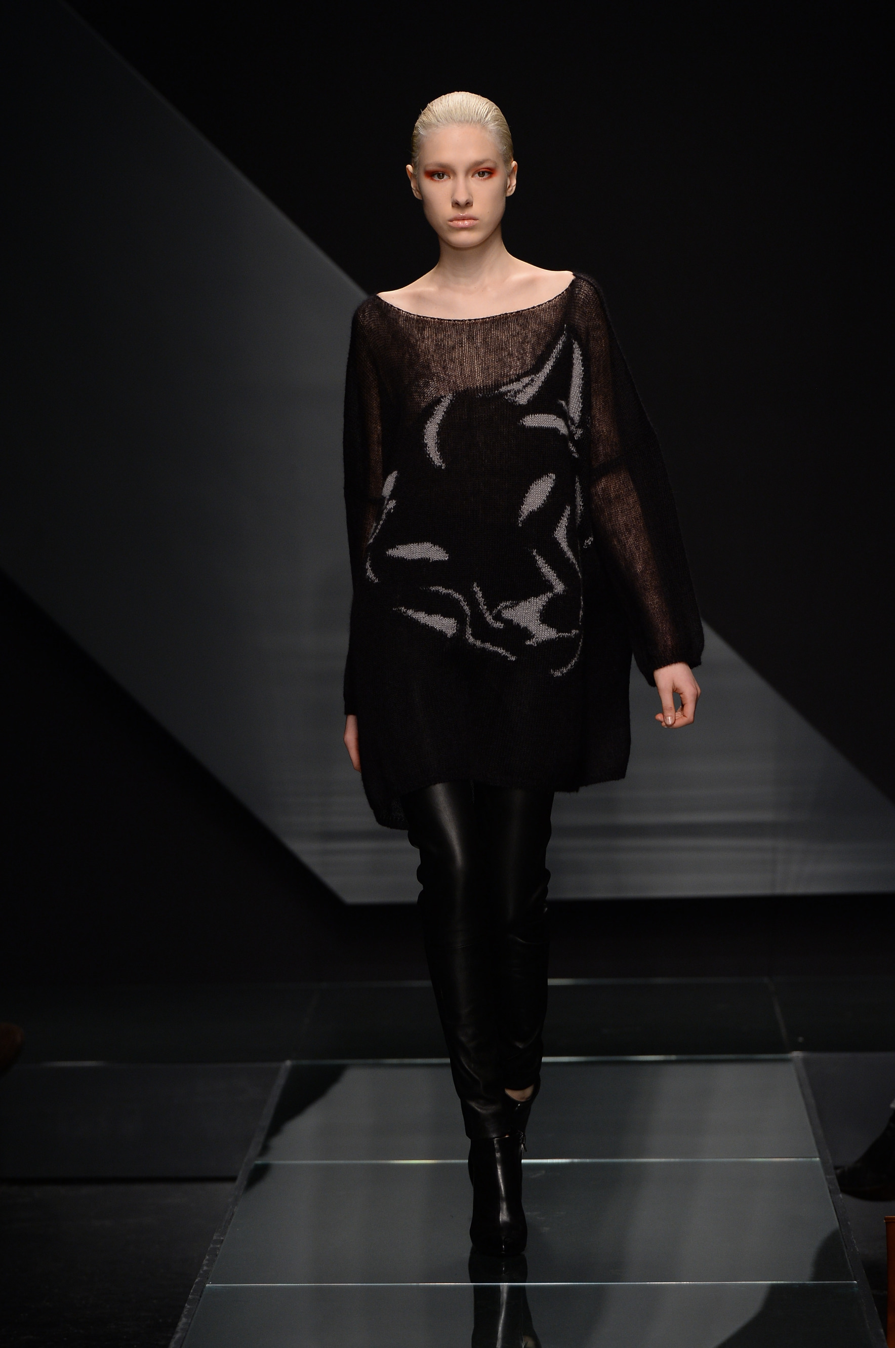 Il cambio si nota subito; è ancora più evidente di altre recenti collezioni; ancora del nuovo collezione A/I 2013-14 di Krizia, certamente dovuto alla presenza di Debora Sinibaldi nel team creativo. Ci sono tutti i codici, gli stilemi che da sempre hanno definito lo stile personalissimo di Mariuccia Mandelli, quella femminilità androgina, fredda, distaccata, eppur sexy; il plissè con cui costruiva volumi e nuove geometrie; la pelle, la maglieria e l’icona distintiva del marchio, la pantera stampata ossessivamente su tessuti e maglieria.