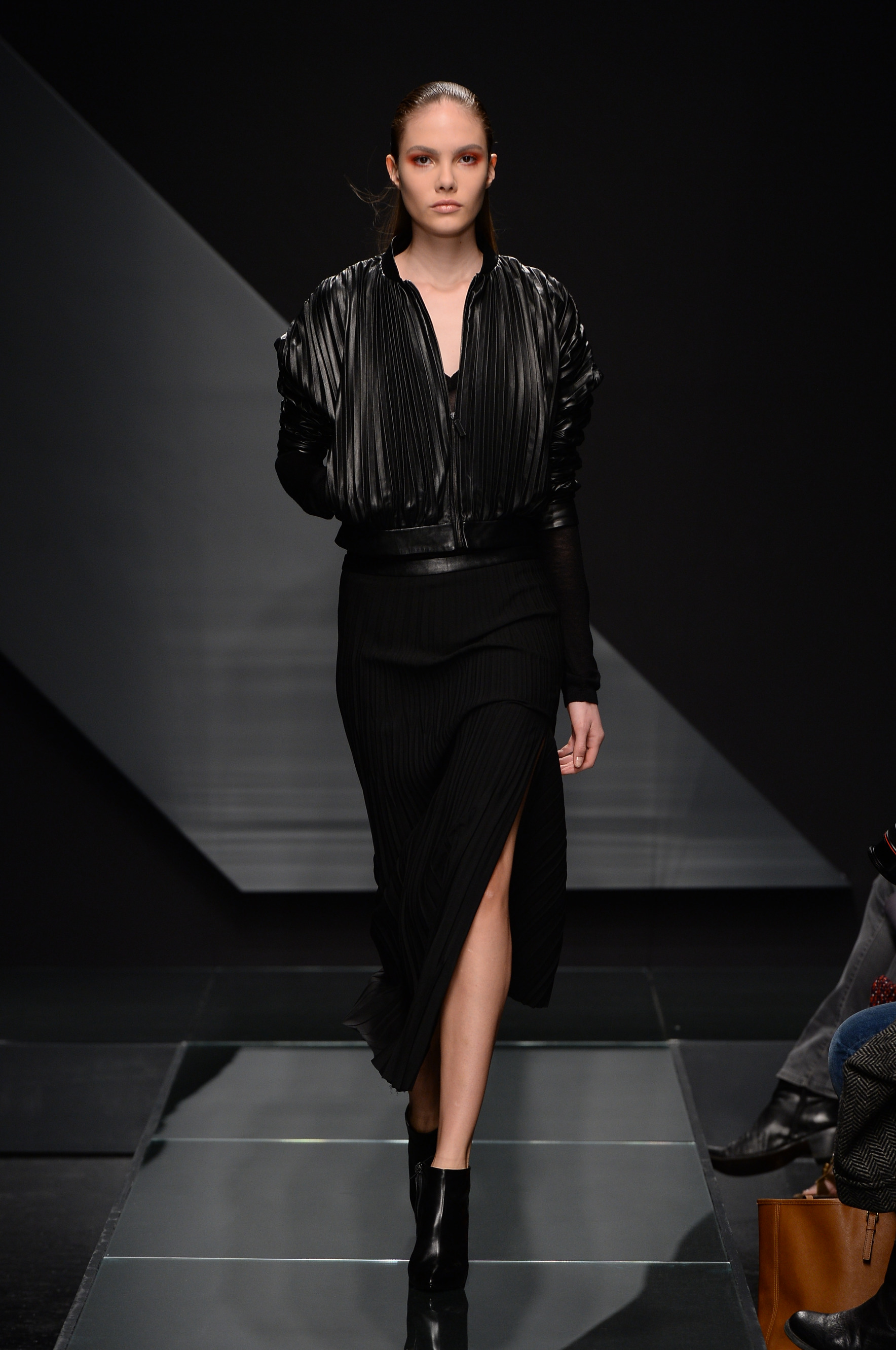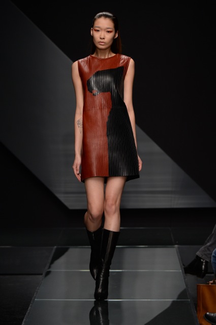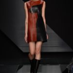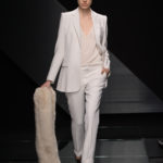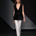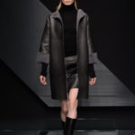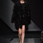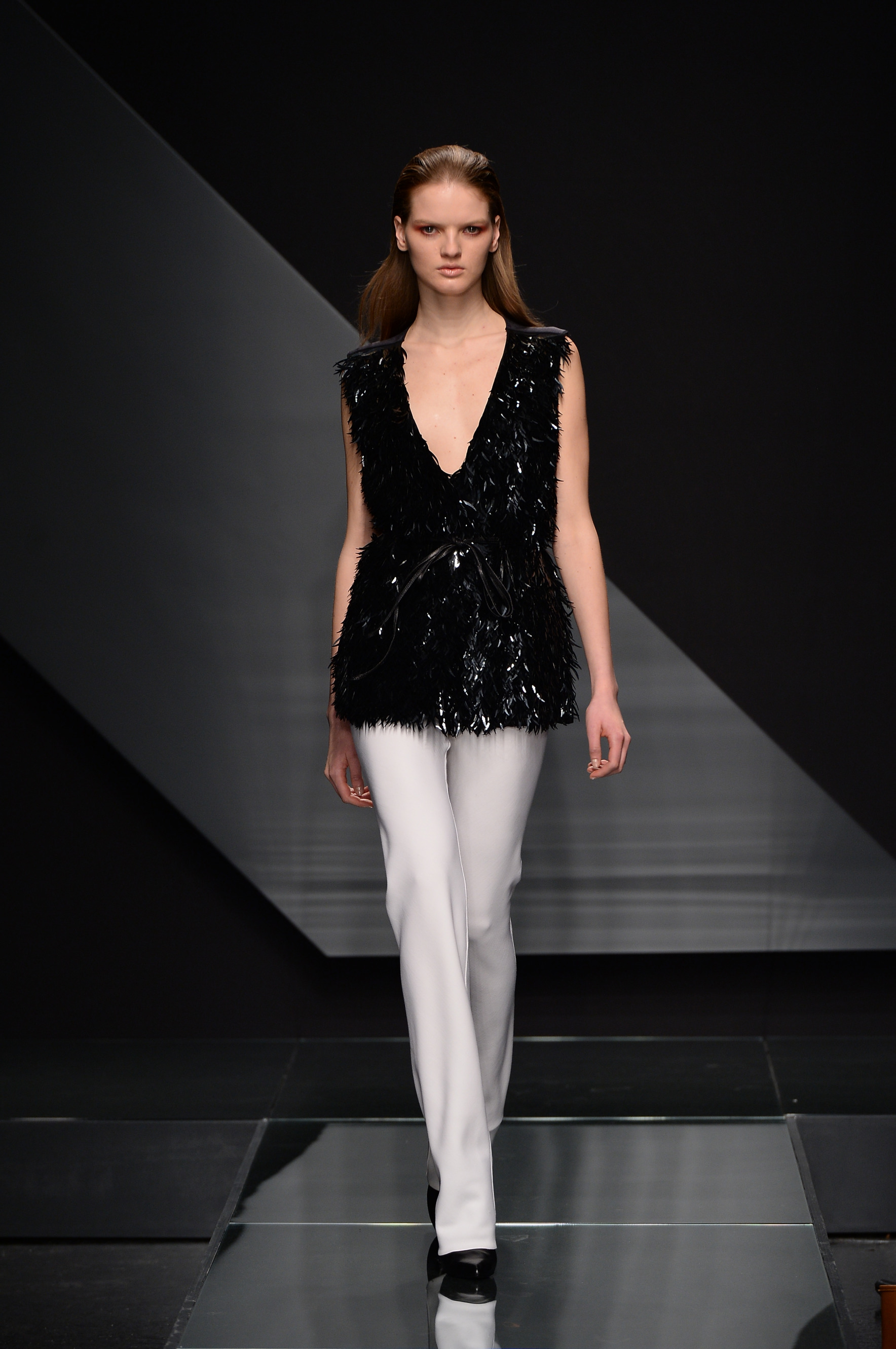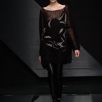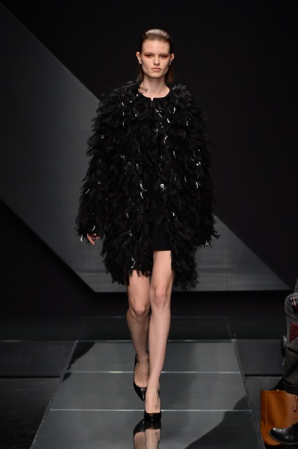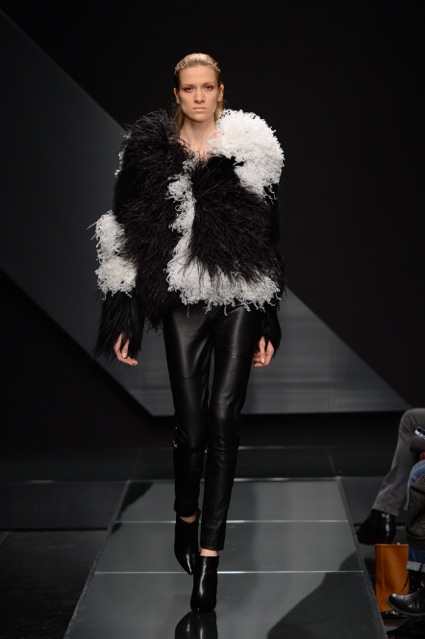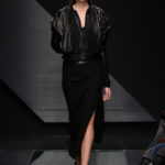 Prendiamo quindi la collezione per ciò che ha dato: un’ immagine femminile quotidiana e reale, non uno stereotipo; una donna misurata, elegante senza ostentazione, che veste il corpo senza esibirlo; sensuale, ma non sexy. Una collezione senza eccessi, dalla linea pulita, fluida, scivolata sul corpo specialmente negli abiti di seta lunghi, alla caviglia, stampati; nei tailleur dai pantaloni skinny o nella tuta nera di jersey. I materiali fasciano il corpo, anche il plissè presentissimo, è privo di volume, piatto, quasi un disegno,come nella gonna tagliata in sbieco che avvolge la figura, o ammorbidisce ancora di più la figura come nei pantaloni a vita bassa nero portati con maglieria leggerissima con il muso della pantera stampata tono su tono o nella tuta nera smanicata. Talvolta il pissè è solo un inserto, talvolta è la nota sorprendente, verticale o orizzontale nelle maniche, del trench doppio petto. La pelle è plissettata, accostata a gonna con plissè piatto e anche le coste della maglieria simulano il plissè. La maglieria è leggera da portare su pantaloni a pelle. I volumi sono dati dalla pellicceria a volte mescolata con marabut, doppiata con mohair; sui tessuti sottili sono i ricami fitti di canutiglie e piastrine rettangolari a dare spessore.