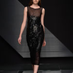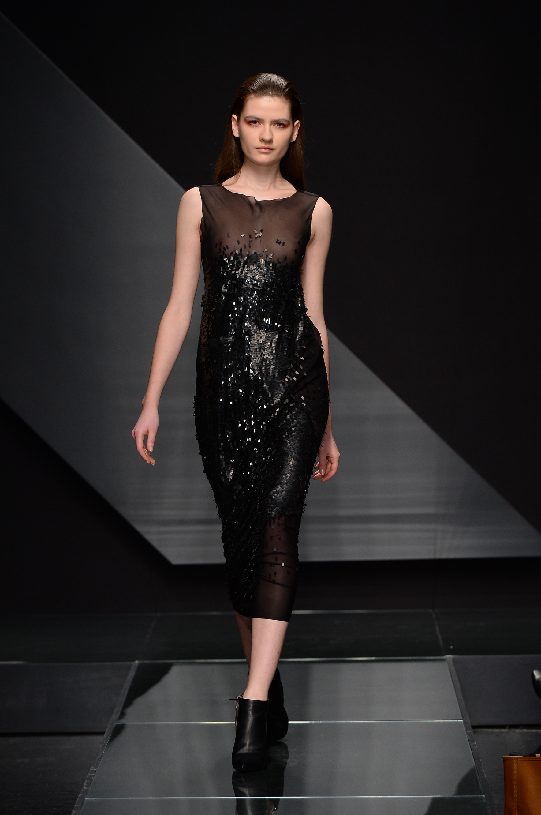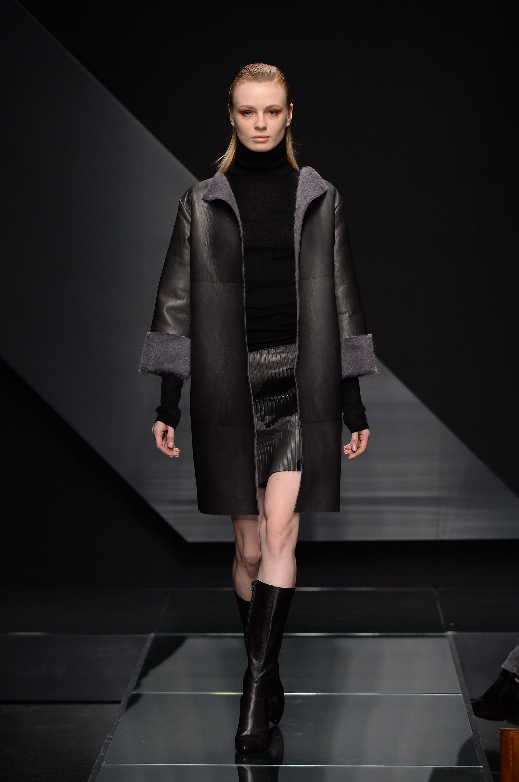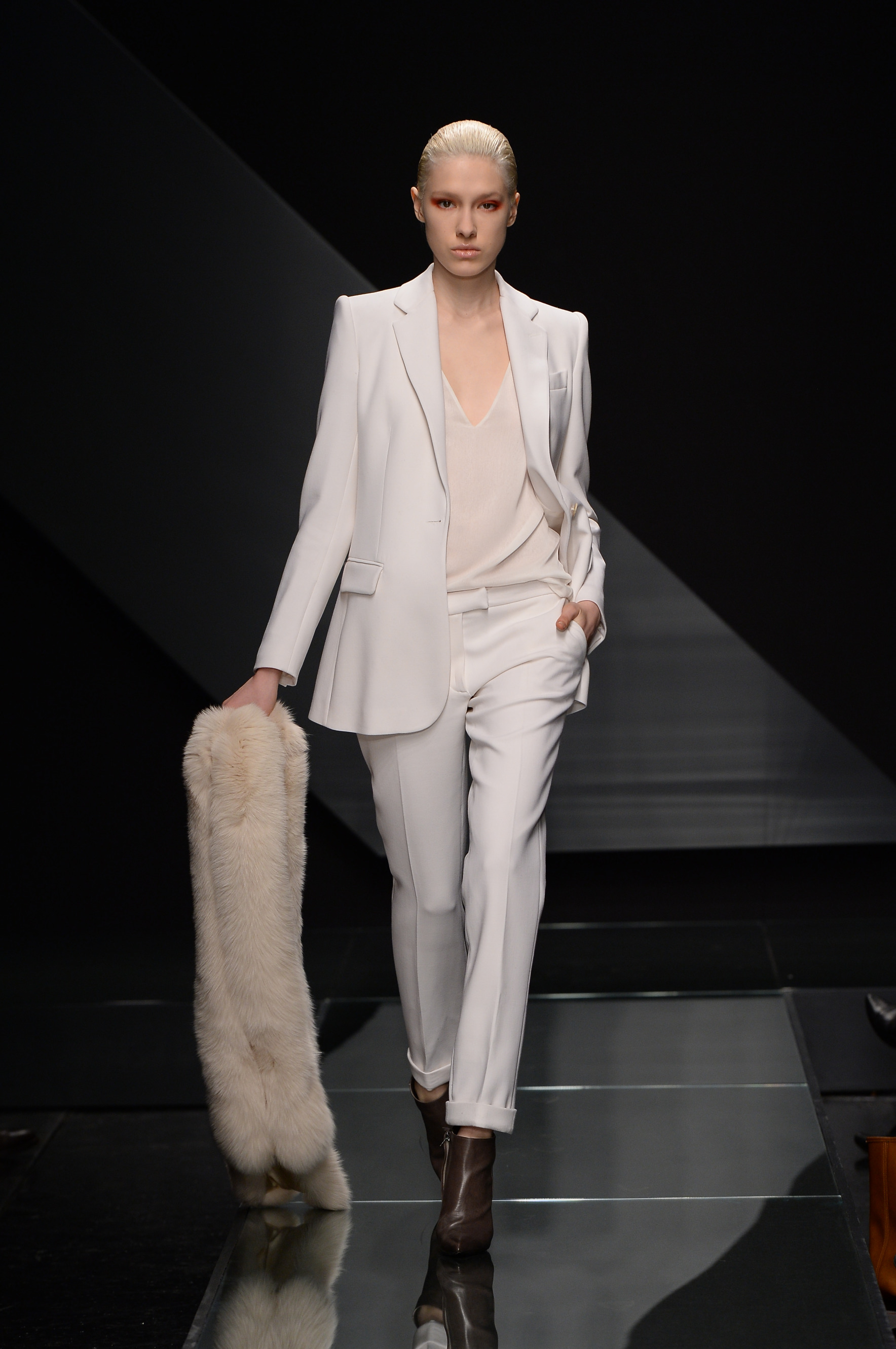 Prendiamo quindi la collezione per ciò che ha dato: un’ immagine femminile quotidiana e reale, non uno stereotipo; una donna misurata, elegante senza ostentazione, che veste il corpo senza esibirlo; sensuale, ma non sexy. Una collezione senza eccessi, dalla linea pulita, fluida, scivolata sul corpo specialmente negli abiti di seta lunghi, alla caviglia, stampati; nei tailleur dai pantaloni skinny o nella tuta nera di jersey. I materiali fasciano il corpo, anche il plissè presentissimo, è privo di volume, piatto, quasi un disegno,come nella gonna tagliata in sbieco che avvolge la figura, o ammorbidisce ancora di più la figura come nei pantaloni a vita bassa nero portati con maglieria leggerissima con il muso della pantera stampata tono su tono o nella tuta nera smanicata. Talvolta il pissè è solo un inserto, talvolta è la nota sorprendente, verticale o orizzontale nelle maniche, del trench doppio petto. La pelle è plissettata, accostata a gonna con plissè piatto e anche le coste della maglieria simulano il plissè. La maglieria è leggera da portare su pantaloni a pelle. I volumi sono dati dalla pellicceria a volte mescolata con marabut, doppiata con mohair; sui tessuti sottili sono i ricami fitti di canutiglie e piastrine rettangolari a dare spessore.