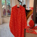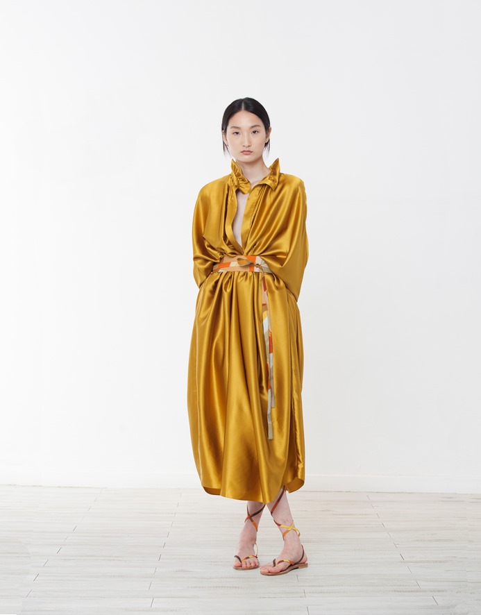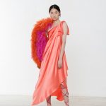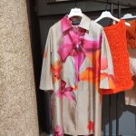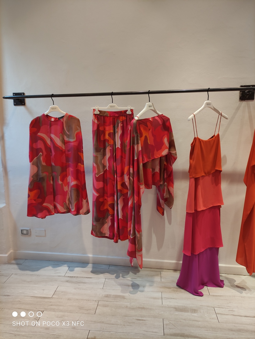 Per la collezione presentata durante MFW di settembre 2021, come per altre, è il colore a venirci immediatamente incontro. L’impatto è forte: fucsia, arancio, verde smeraldo e giallo, bronzo, tinte molto sature che danno tonalità intense, vivide e squillanti. E questo non solo nei capi tinta unica, ma anche nelle stampe.