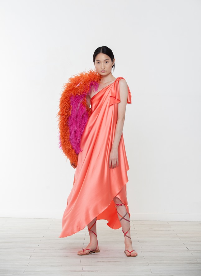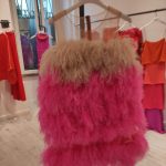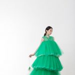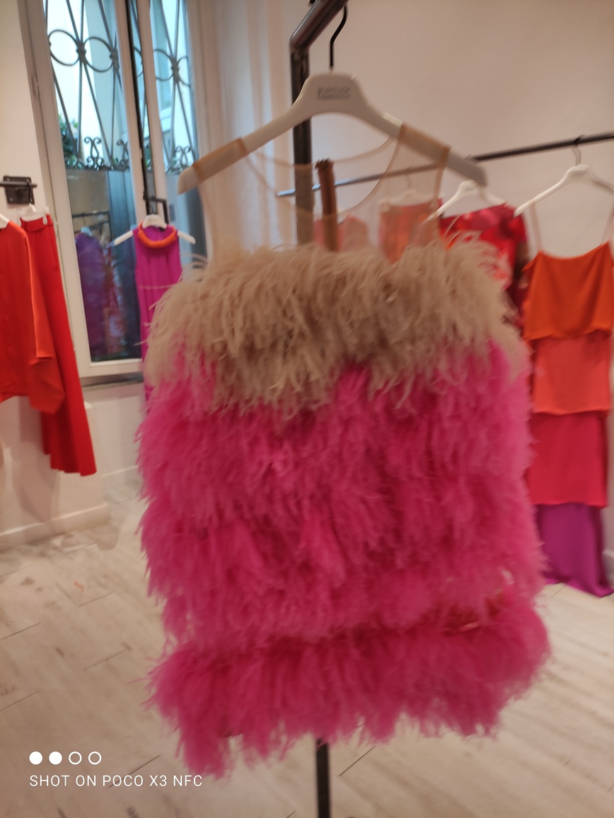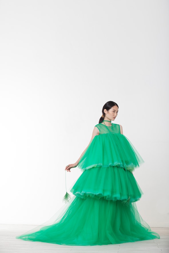 Accanto al colore altra nota significativa della collezione è la leggerezza che si esprime attraverso l’uso del tulle multistrato reso voluminoso attraverso le balze e dinamico grazie all’effetto degradè frutto di sovrapposizioni di tessuto. È sempre il tulle la base per gli abiti dai ricami in piume di struzzo applicate a mano.