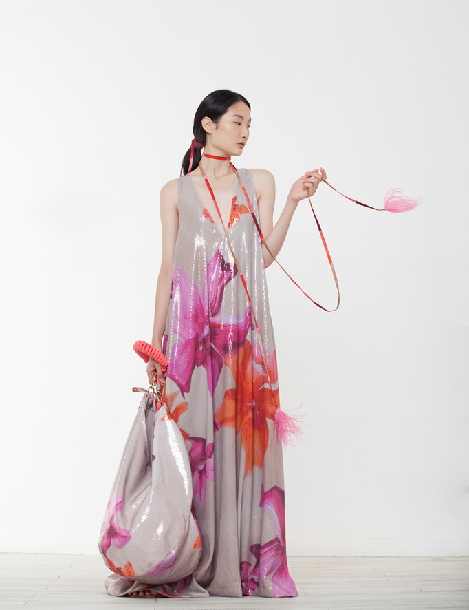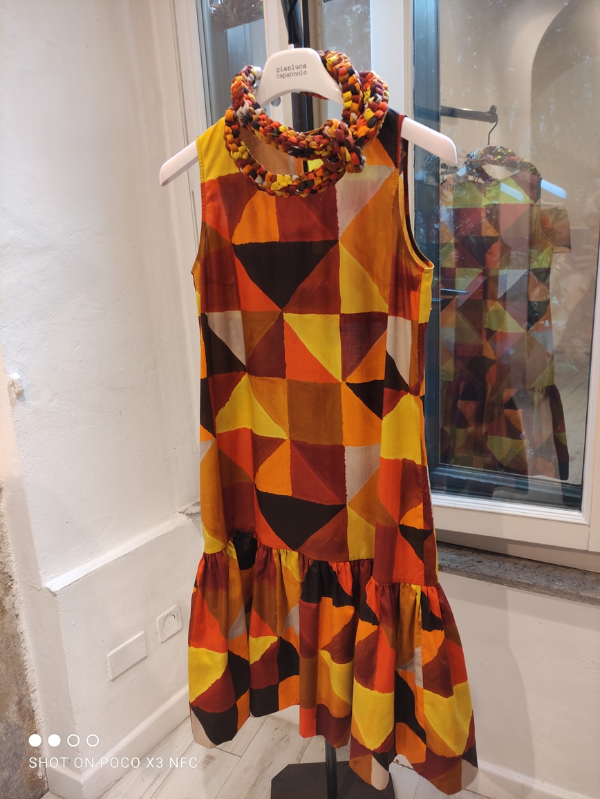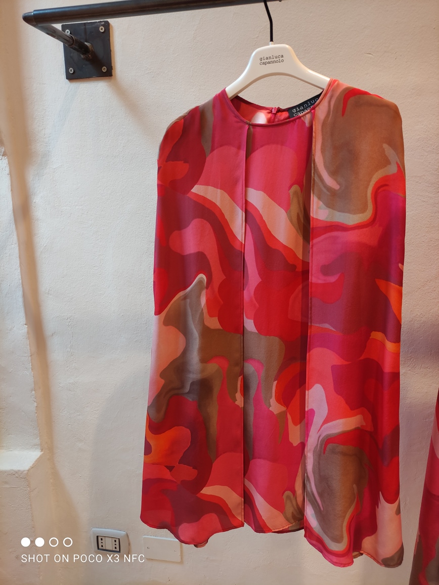 Ciò non sorprende. Gianluca Capannolo è in fondo un artista, sappiamo che si diletta di pittura e di architettura. Quindi nessuna meraviglia che la sua collezione si sia ispirata, nelle stampe di parecchi capi, ai temi della pittrice statunitense Georgia O’Keeffe. Le stampe -proposte su seta o realizzate con tecnica digitale su paillettes – rievocano, quelle floreali di corolle giganti, le creazioni più famose dell’artista americana; mentre i motivi geometrici su cotone e mussola ricordano le colline desertiche di rocce che la pittrice sapeva trasformare in immagini astratte, anche se vivide e quasi in movimento. Gianluca Capannolo riesce a trasferire bene sul tessuto il lavoro di una delle pittrici più quotate al mondo.