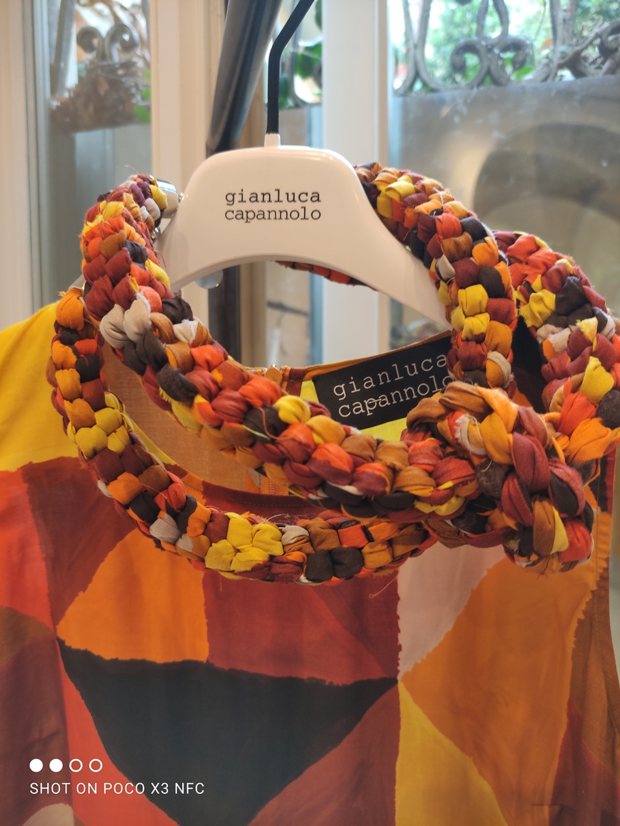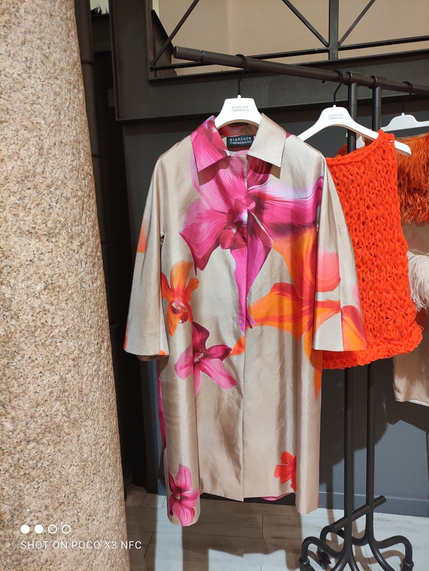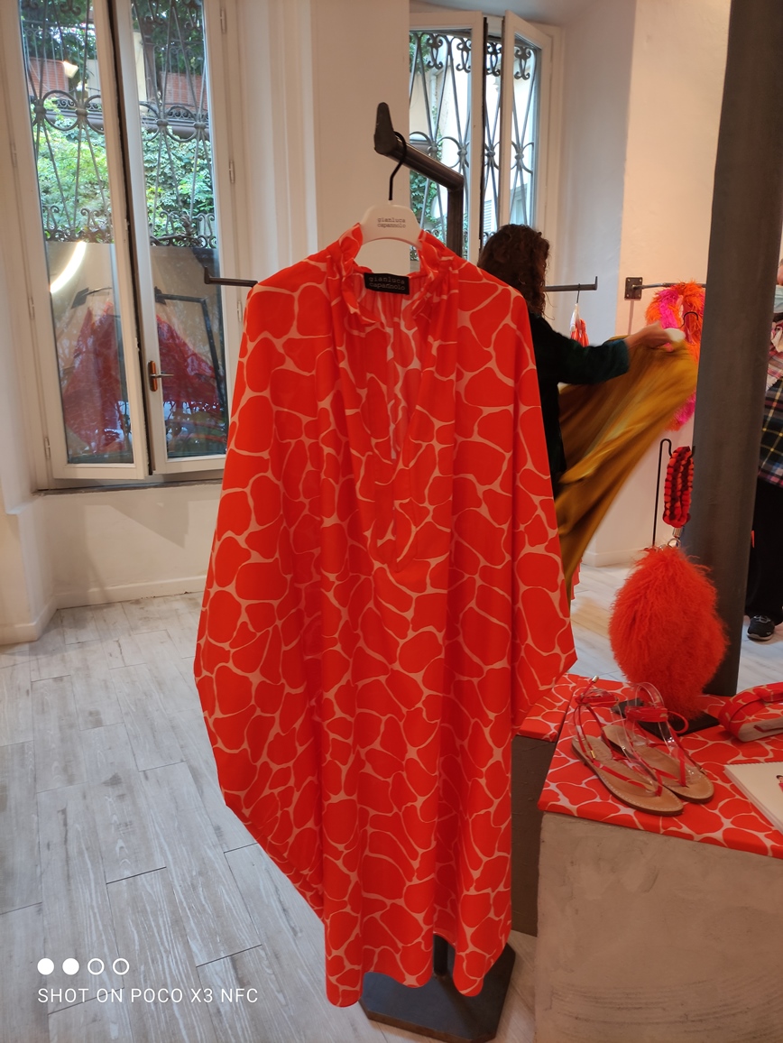 Gianluca Capannolo presenta la sua collezione p/e 2022 in via San Maurilio, lontano dai quartieri più sonori della Moda. La strada è stretta, adatta, come di fatto è, ad accogliere botteghe artigianali e vecchi negozi, trattorie antiche, più che l’atelier di uno stilista affermato che ha lavorato accanto a nomi di richiamo, Krizia, Lancetti, Maurizio Pecoraro, ecc. Lo showroom tutto bianco e spoglio è molto adatto ad accogliere le creazioni dello stilista abruzzese perché è più immediato cogliere quasi con un unico sguardo, il filo conduttore della collezione; il pezzo più “prezioso” bisogna scovarlo, solitario è quasi nascosto in una rientranza.