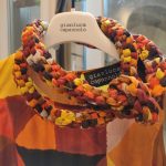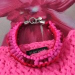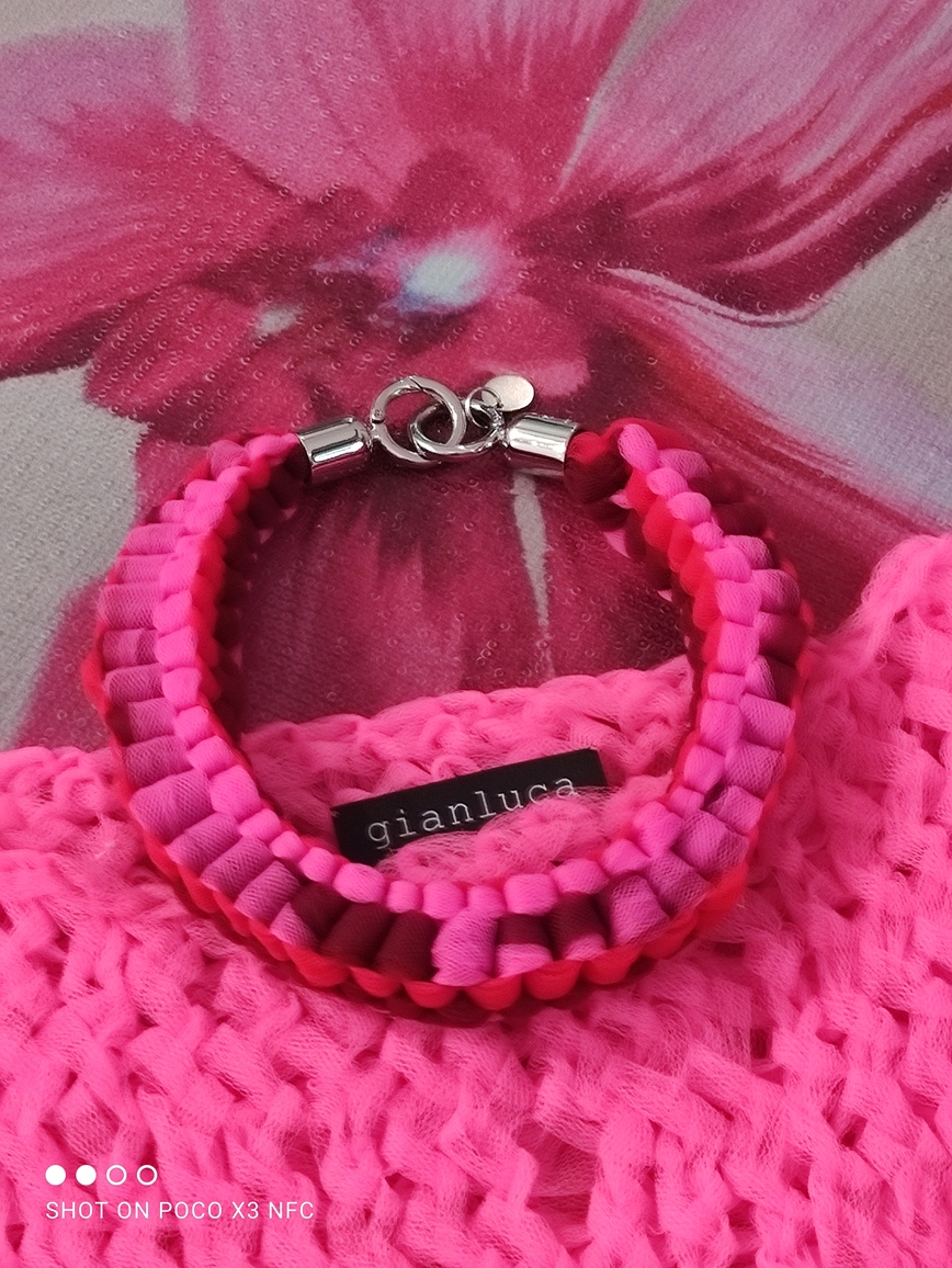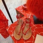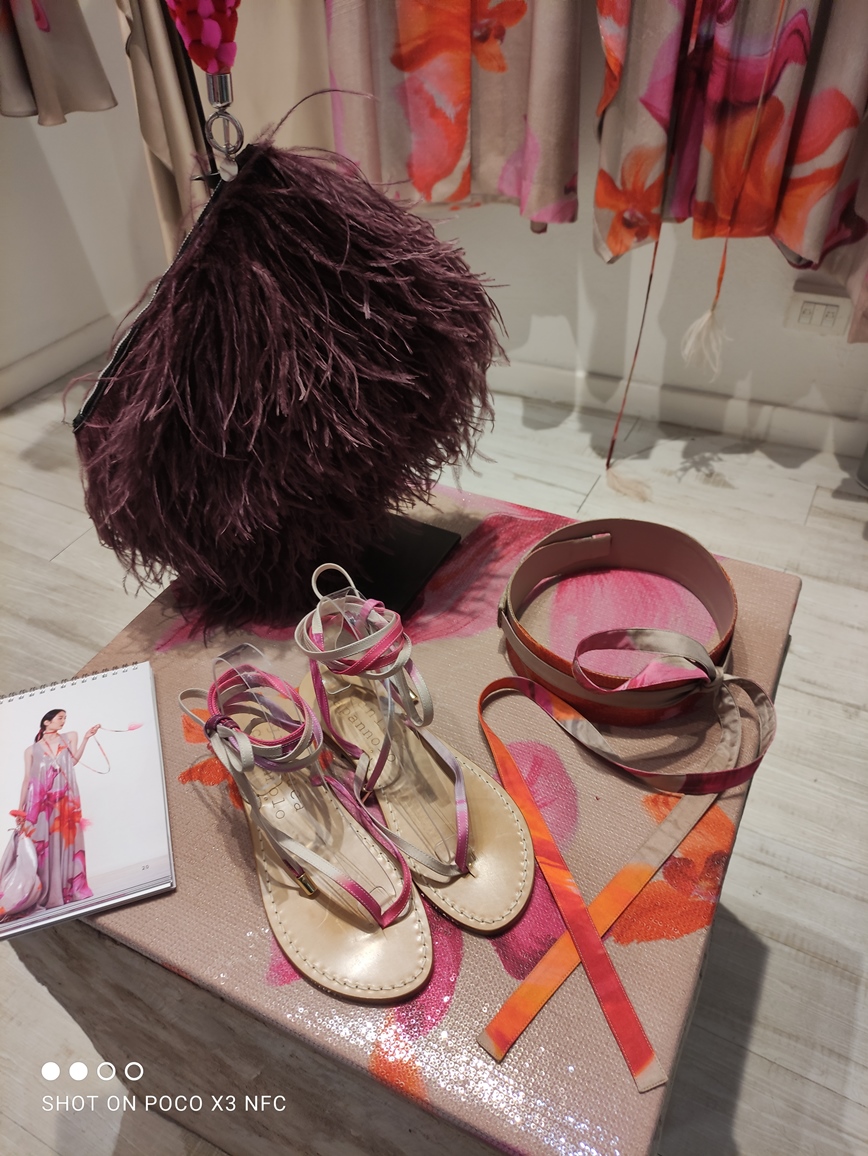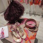 Interessanti tra gli accessori le borse dello stesso tessuto degli abiti; i copricapi in neoprene essenziali e rigorosi; le collane, già viste in altri momenti, lunghe e corte di tulle intrecciato prevalentemente nelle tonalità rosa e fuxia, oppure di stoffa intrecciata nei colori di un abito a stampa di figure geometriche. Borse vistose nei i colori, ma apparentemente leggere nel peso, di piume di struzzo; sandali essenziali, esili lacci colorati da annodare intorno alla gamba, completano l’offerta della collezione.
