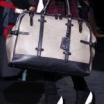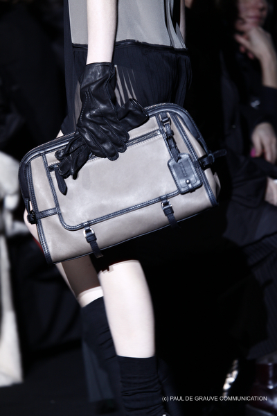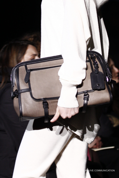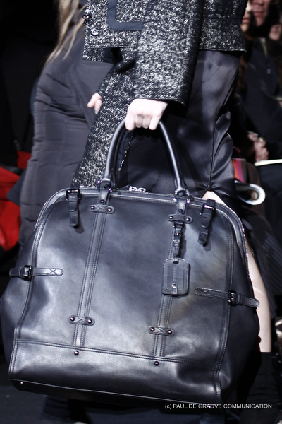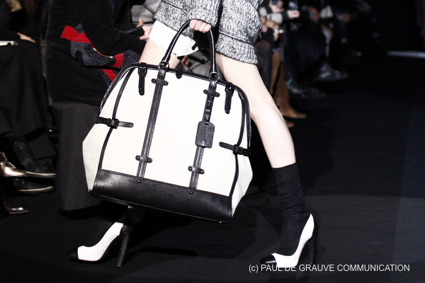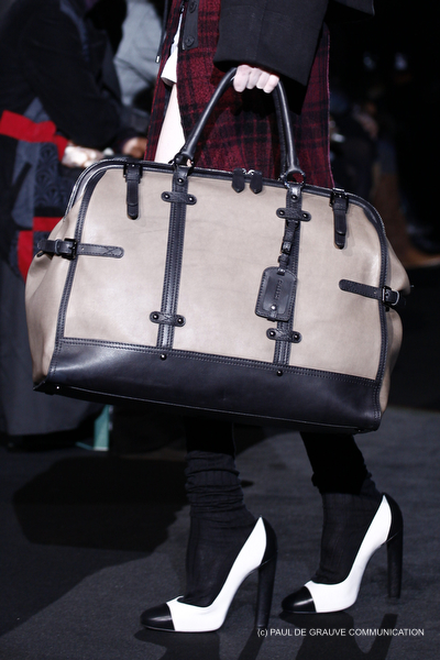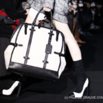 Per gli accessori maxi borse e maxi pochette sempre dal taglio sportivo, soprattutto in pelle. Decollete bicolor con tacco altissimo, e aggiungerei, di una o due taglie in più per qualche modella, visto che durante la sfilata il rischio caduta è stato altissimo.
