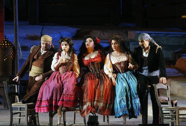 Tornano poi alla mente la faraonica Aida dell’Arena di Verona o la Carmen del Metropolitan di New York del 1996 per la quale realizzò ben 480 costumi dai colori forti e primari che screziavano dai vibranti verdi ai rossi accesi, dai penetranti azzurri fino all’avvolgente nero. E poi, il Don Chisciotte per Rudolf Nureyev tutto giocato sulle naunces delle terre bruciate e dei carmini o la Mirandolina goldoniana per la Fenice di Venezia, maliziosa e fanciullesca, passando ai riflettori degli ultimi capolavori per il cinema con i raffinati ed elegantissimi abiti di Un Tè con Mussolini e quelli straordinari di Callas Forever.