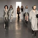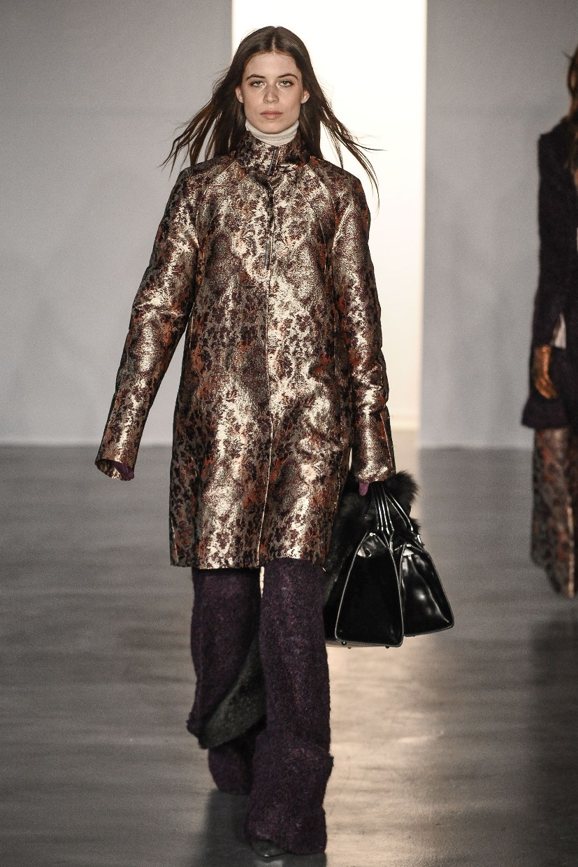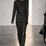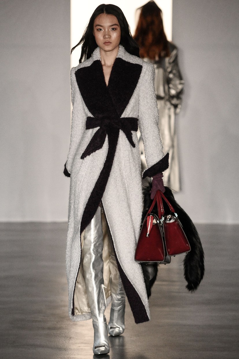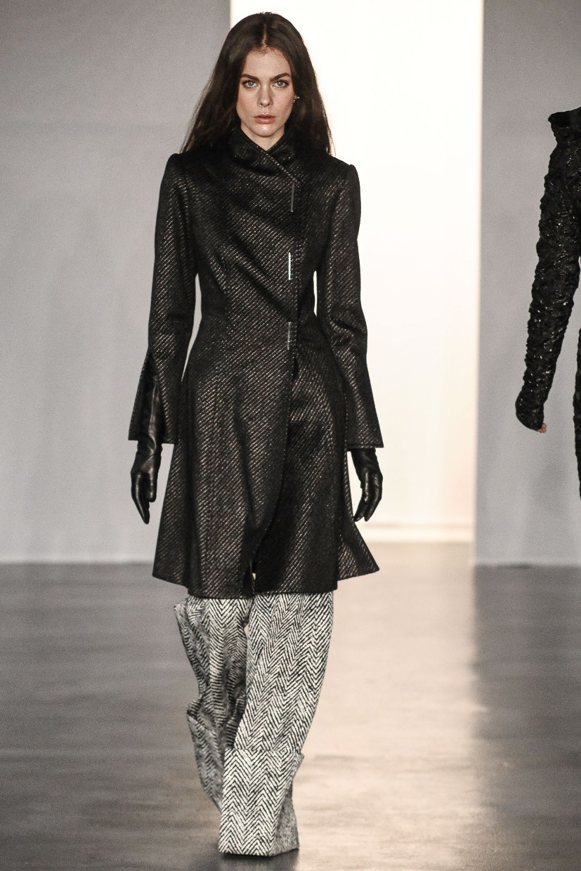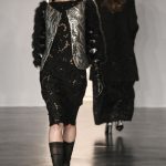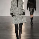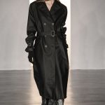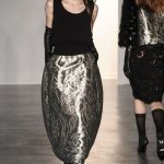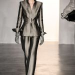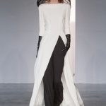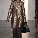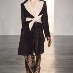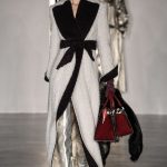 Segnaliamo i principali elementi di stile della collezione. Punto vita sottolineato che accentua la femminilità della silhouette ad anfora delle gonne, particolarmente marcata nelle minigonne gonfie dove profonde pince disegnano un inizio di linea a palloncino. Nel resto degli outfit la linea è slanciata e questo si vede nei pantaloni anni ’70 dall’alto risvolto; in alcuni capospalla, come il lungo cappotto-vestaglia chiaro dall’ampio scollo nera e cintura nera.