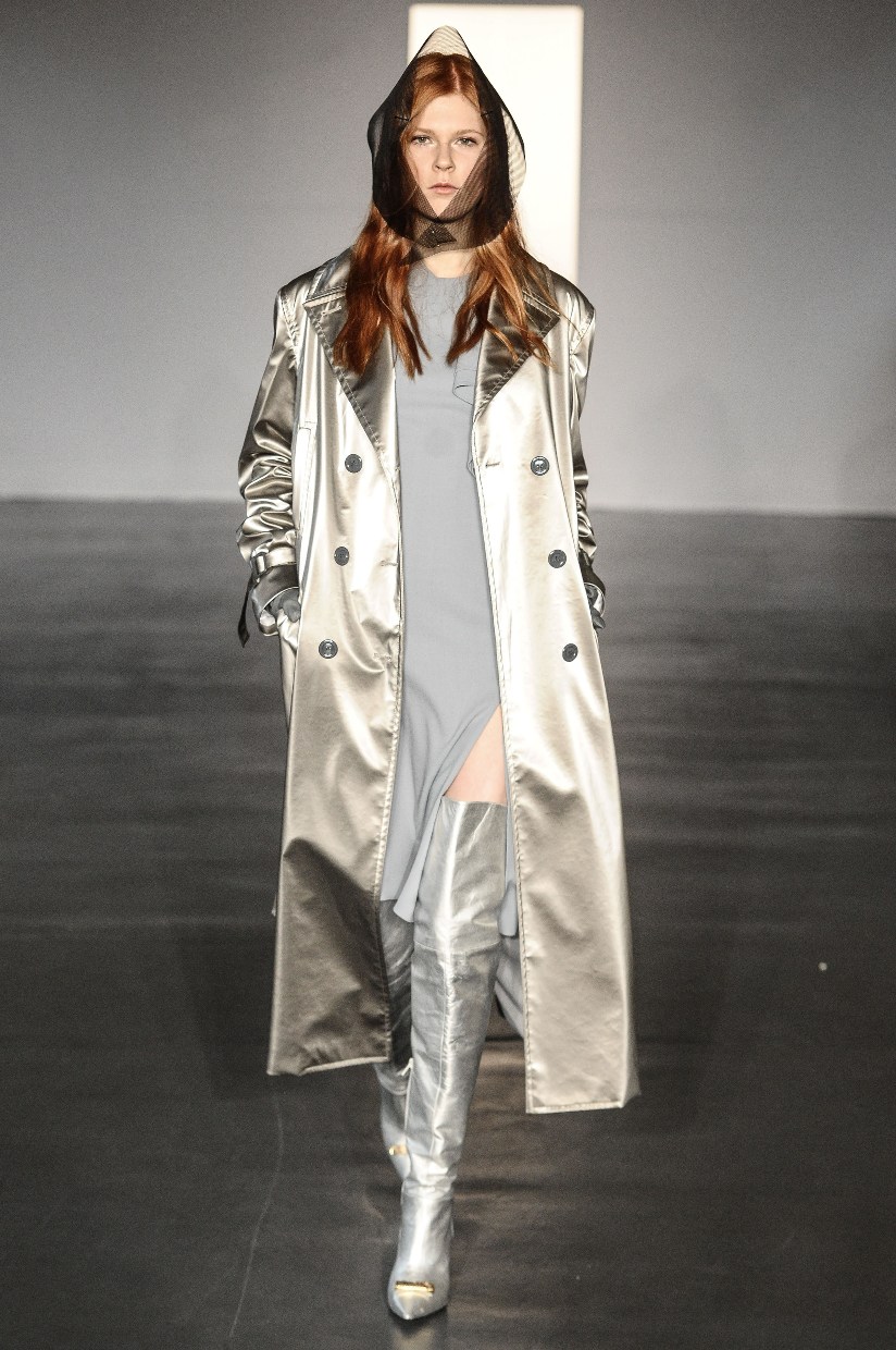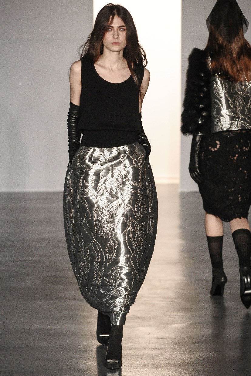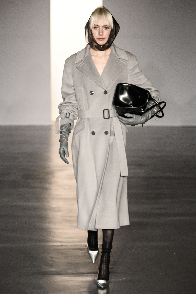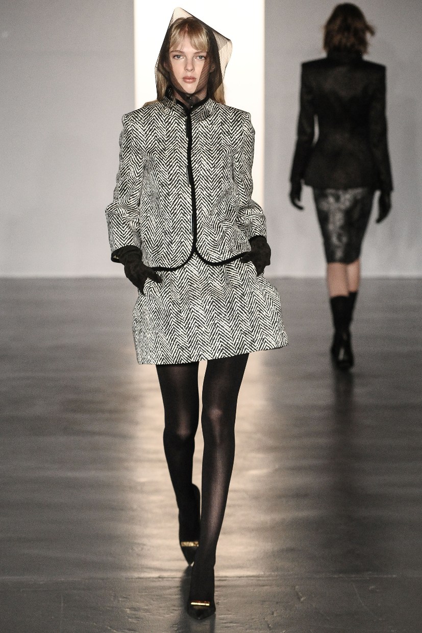 Segnaliamo i principali elementi di stile della collezione. Punto vita sottolineato che accentua la femminilità della silhouette ad anfora delle gonne, particolarmente marcata nelle minigonne gonfie dove profonde pince disegnano un inizio di linea a palloncino. Nel resto degli outfit la linea è slanciata e questo si vede nei pantaloni anni ’70 dall’alto risvolto; in alcuni capospalla, come il lungo cappotto-vestaglia chiaro dall’ampio scollo nera e cintura nera.