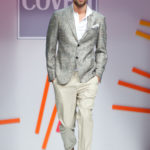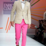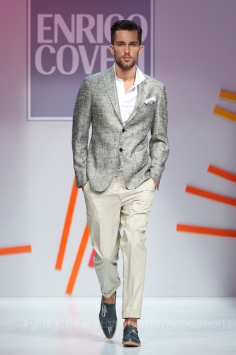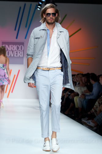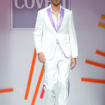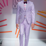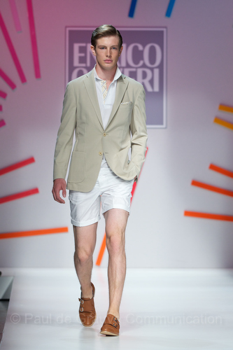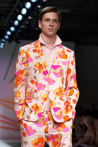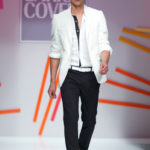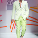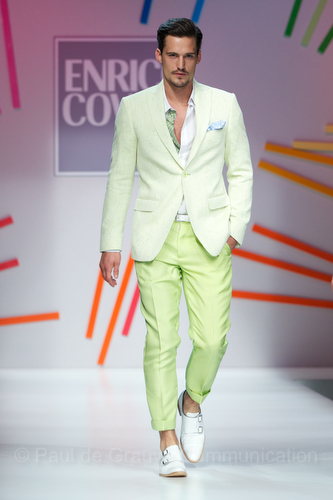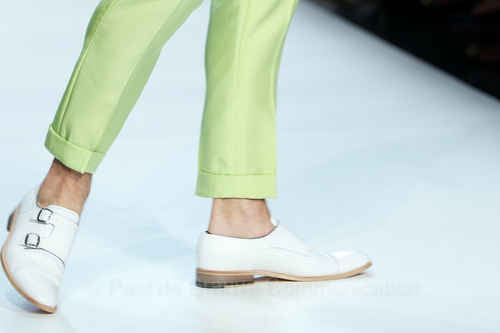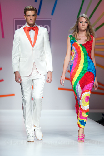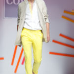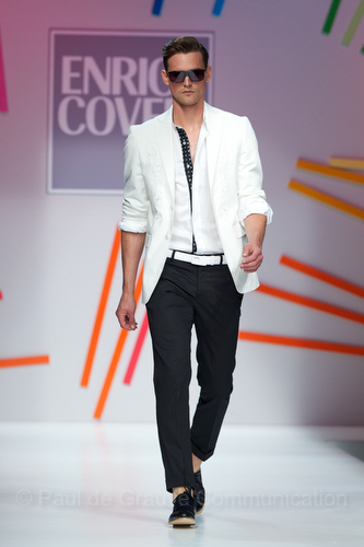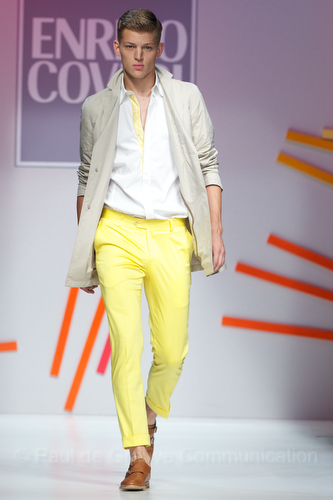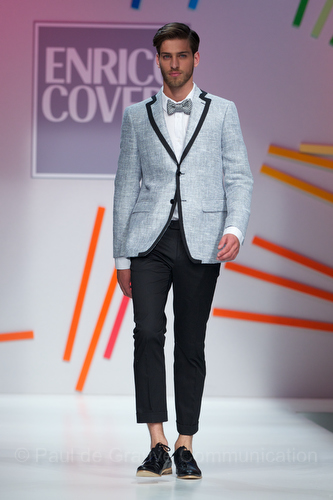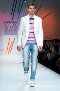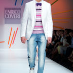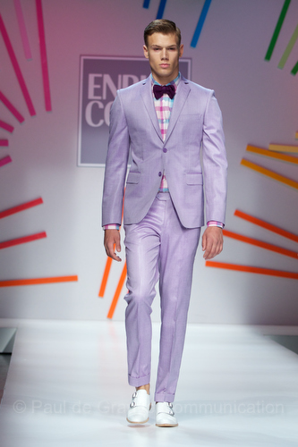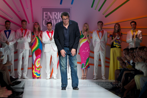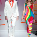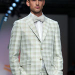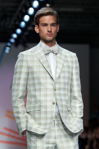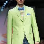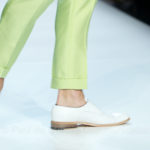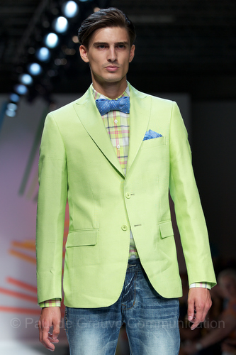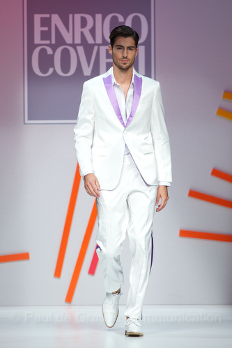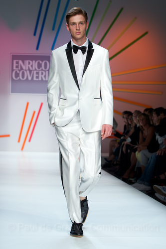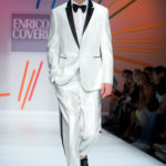 Chiude la sfilata una lunga serie di smoking, sul cui bianco puro spiccano bande, reverse e papillon verdi, arancio, blu e rossi, a sdrammatizzare, nelle intenzioni dello stilista, uno degli storici simboli dell’eleganza formale.