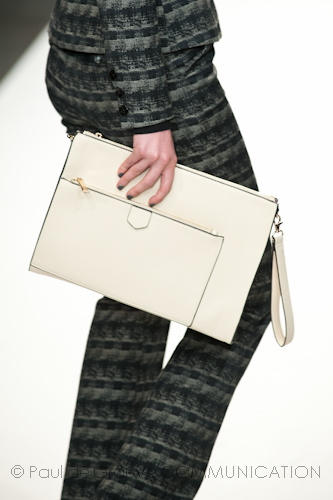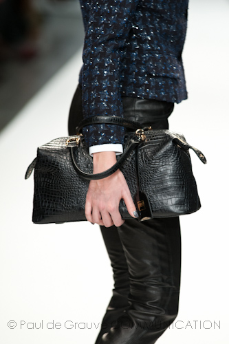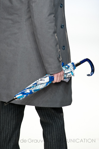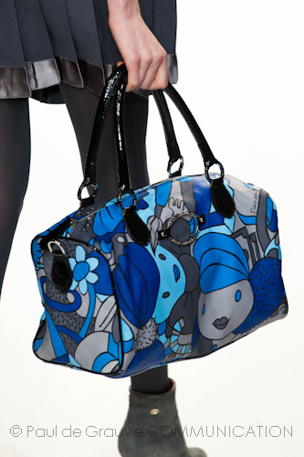Calzature da donna con la D maiuscola sono i decolleté dai tacchi vertiginosi, (smorzati da plateau interni) nelle nuance di grigio, bluette e fucsia; polacchini o stringate in vitello spazzolato rigorosamente blu e nere, per il suo compagno. A completare i look, una vasta gamma di accessori, in cui l’imperativo categorico sono le stampe: vistose e decise rivestono iconici ombrelli e bauletti in pelle (che lasciano talvolta il passo anche a piccole buste con tracolla in vernice e cavallino). Gli occhiali dalle forme over arrotondate o a goccia si adeguano alle regole cromatiche della collezione; così come le micro cinture sistemate strategicamente a sottolineare il punto vita. Elementi must per una coppia che, se di giorno ama alternare sportswear e formale, quando si abbassano le luci e si avvicina la sera passa grintosa ad un look molto glamour.