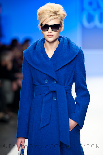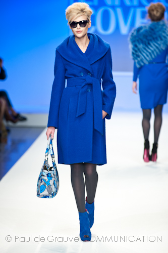 Si scivola quindi verso il mondo dei blu, quelli scuri, tipici del bel vestire maschile, dove trova spazio sia il completo formale quanto l’abbigliamento più sportivo. Fulcro del casualwear è la maglieria, che scherza a trasformare dinamicamente il guardaroba invertendo le usanze: se la maglia con cappuccio può essere il capo must di un weekend all’aria aperta, può anche essere riutilizzata indossandola sotto una giacca formale doppiopetto al ritorno in città; viceversa il classico cardigan può abbandonare il suo solito ruolo di sottogiacca e vivere di luce propria diventando, se indossato con camicia e cravatta che ne riprendono i colori, l’elemento principale di un look preppy style. In questo gioco di ruoli il classico cappotto lascia spesso il passo a una maglieria pesante o a giacconi tirolesi riveduti in chiave navy, per un comfort assoluto e massima protezione contro i rigori invernali. Freddi che la sua compagna combatte rubandogli i tessuti, per utilizzarli in mix materici su femminilissimi abiti smanicati – da indossare con appariscenti colli di volpe – o su mini tailleur.