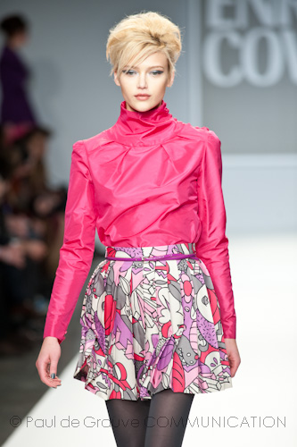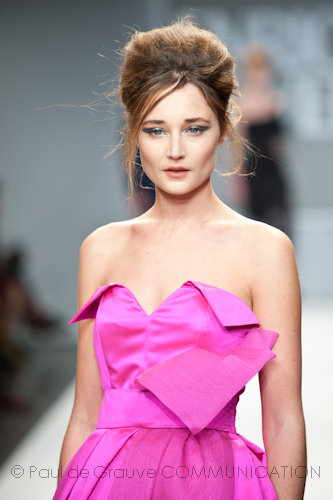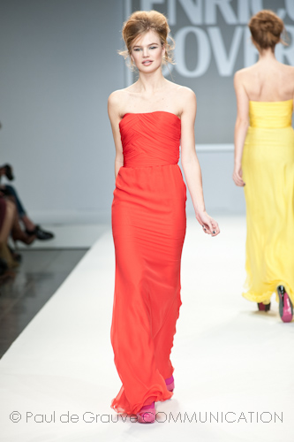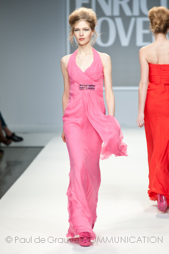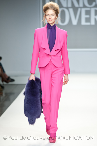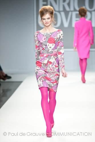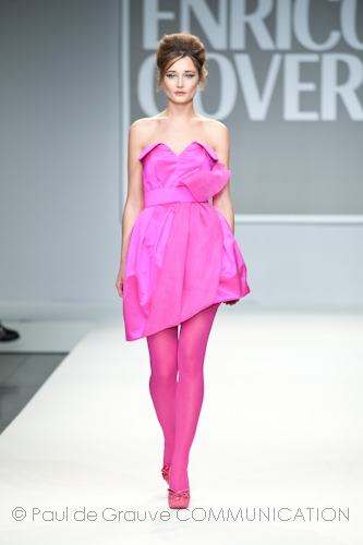 Apre la passerella dell’after dinner l’immancabile blusa in paillettes fucsia, omaggio al capo che ha reso famoso Enrico Coveri in tutto il mondo, indossata con una semplice gonna in pendant. Di sera lei passa con disinvoltura dal corto, scegliendo abiti scultorei in raso con gonne volumetriche a palloncino, al vestito lungo, trasformandosi così in una vera star da red carpet, ammantata in cascate di chiffon che le avvolgono il corpo grazie ad abili giochi di plissé incrociati e accompagnata dal suo lui in elegante abito di velluto.
